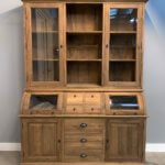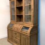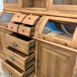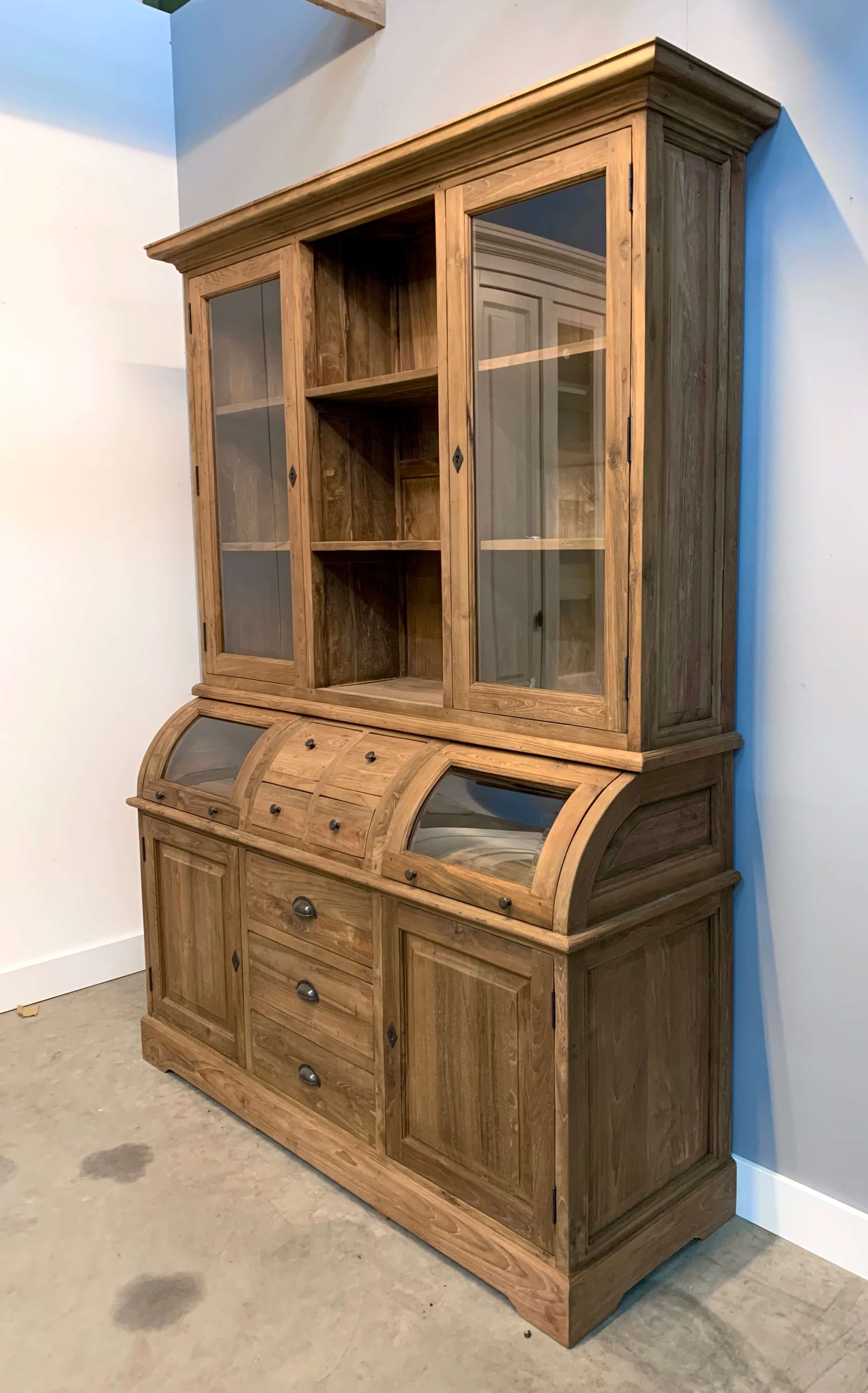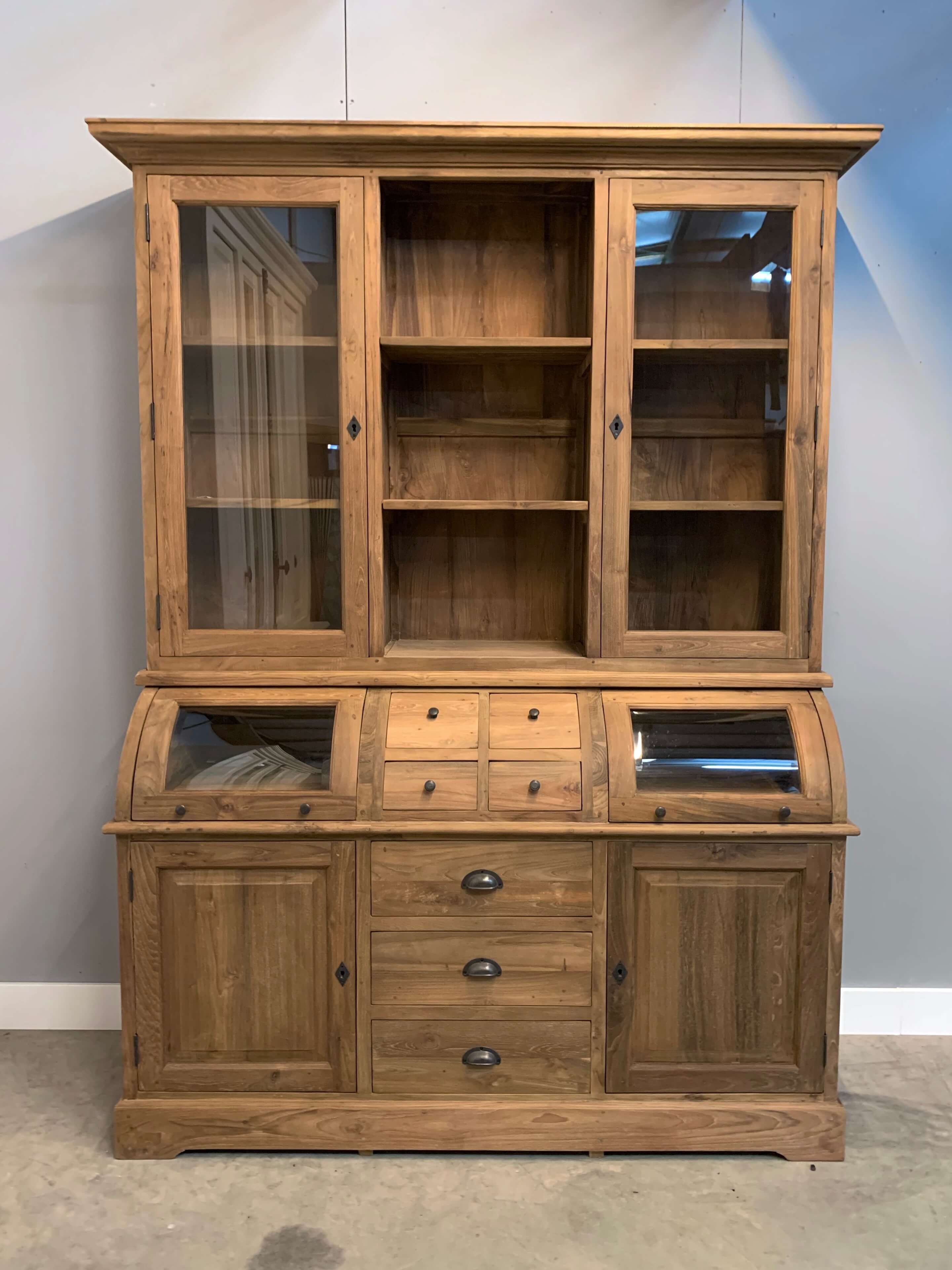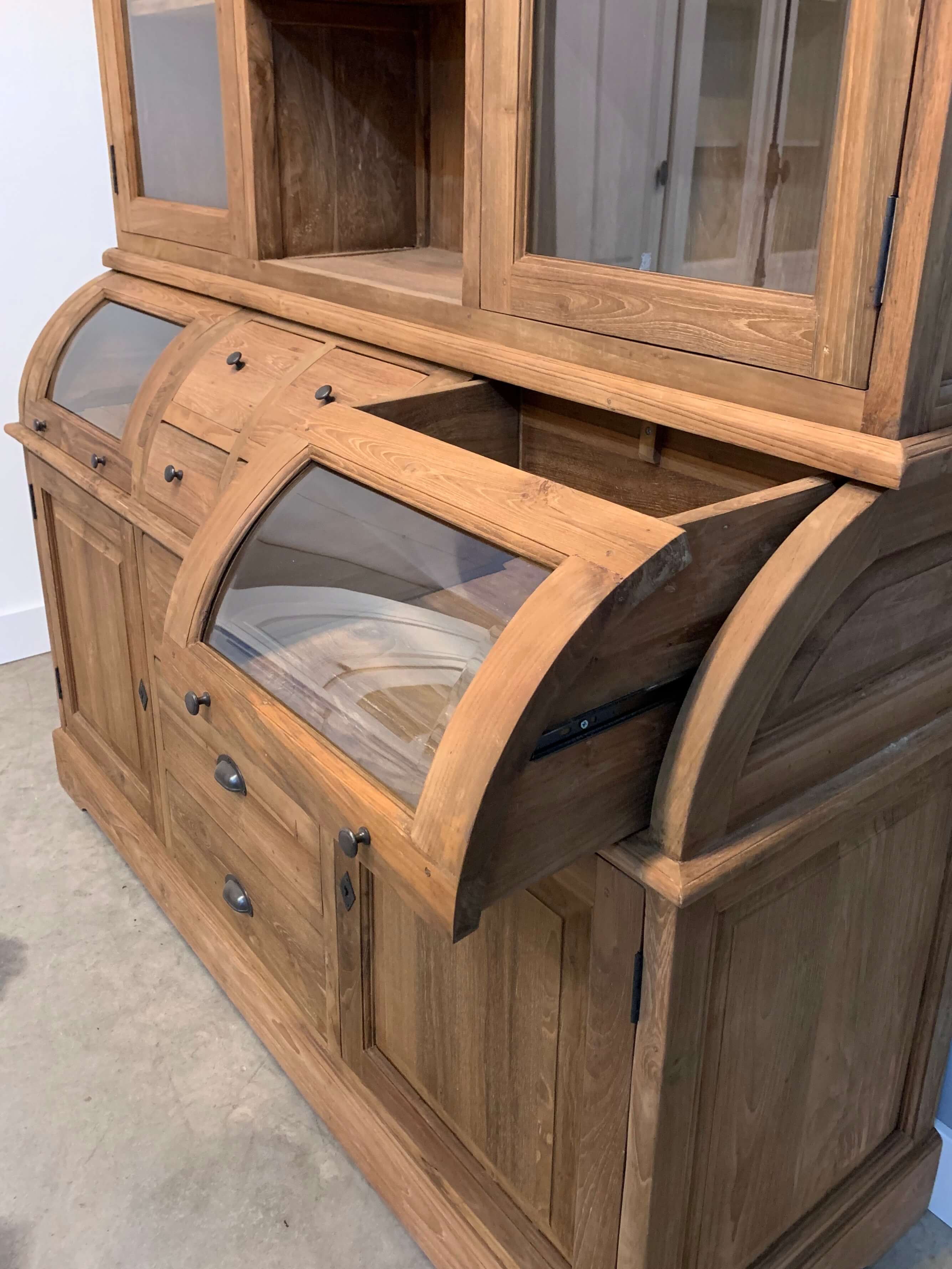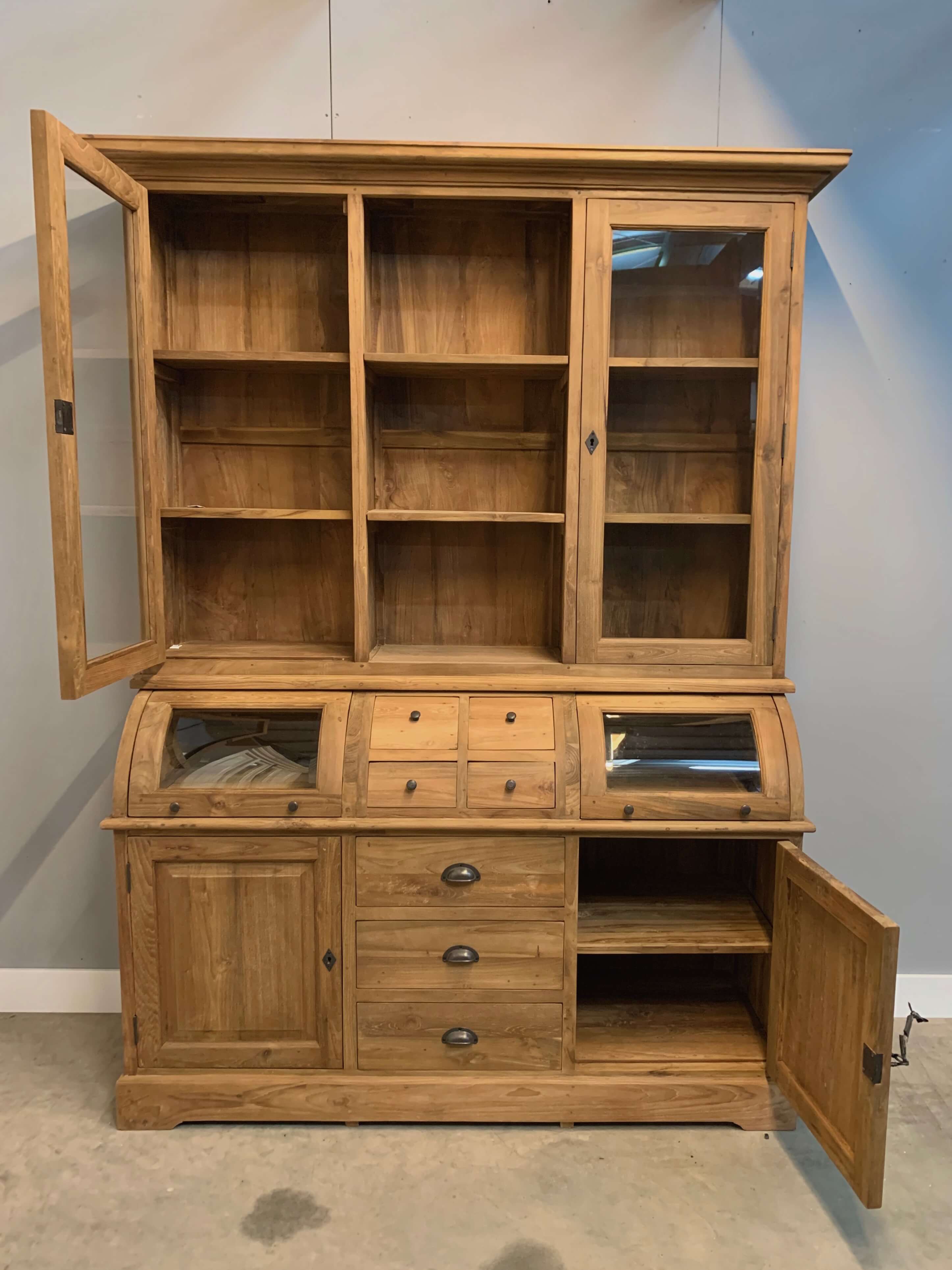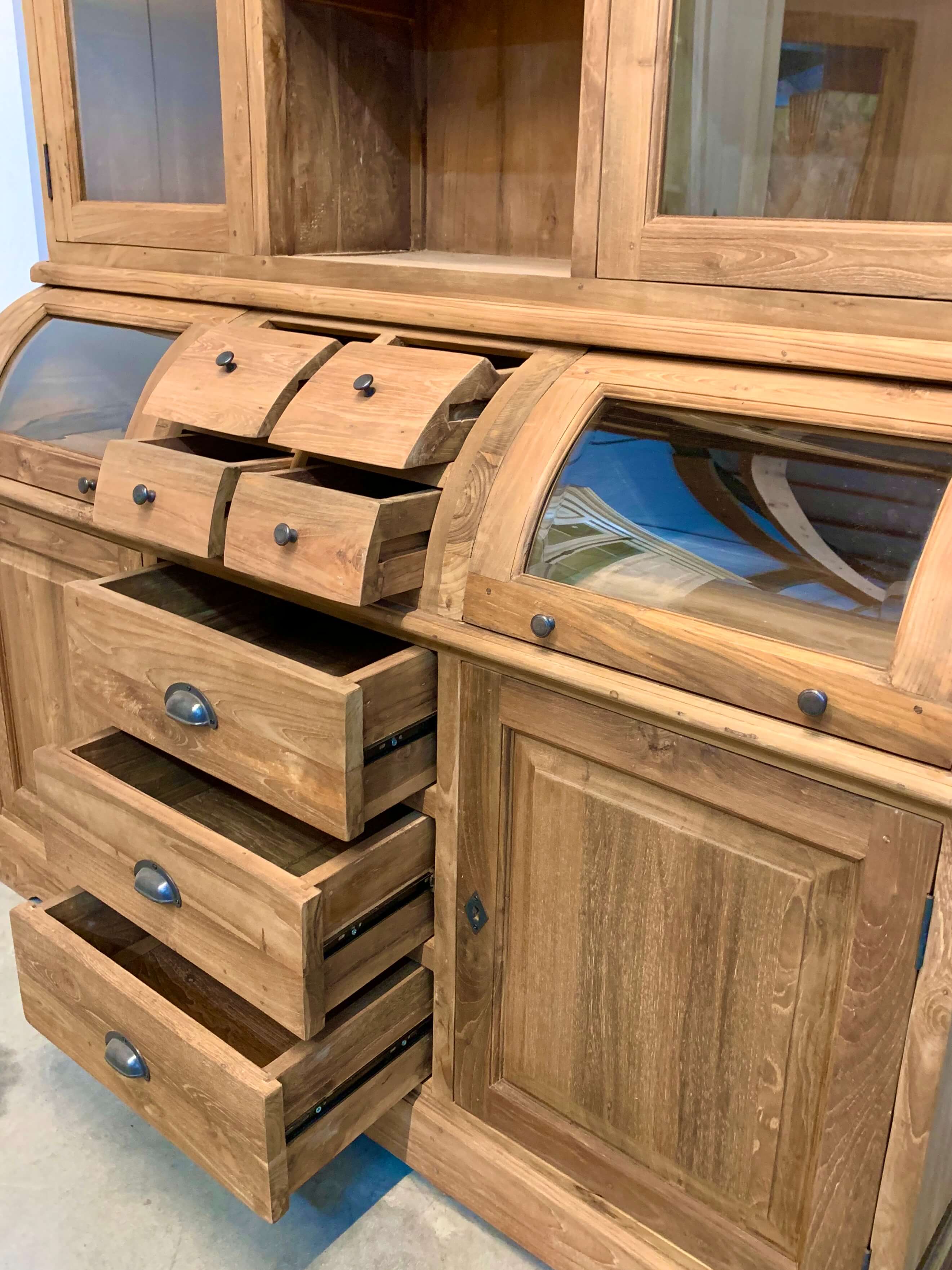 This shopping cabinet is made of recycled teak wood. The drawers open on a rails. The cabinet is unique in its kind because the convex glass part of the cabinet is now a drawer instead of a flap.
