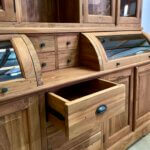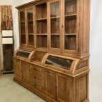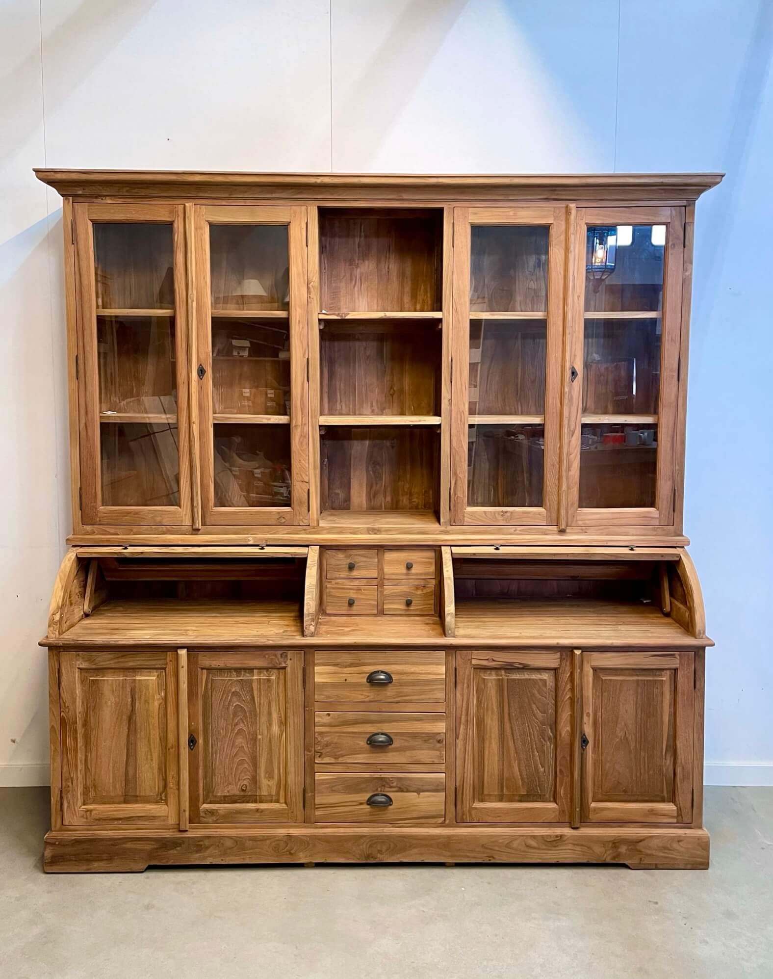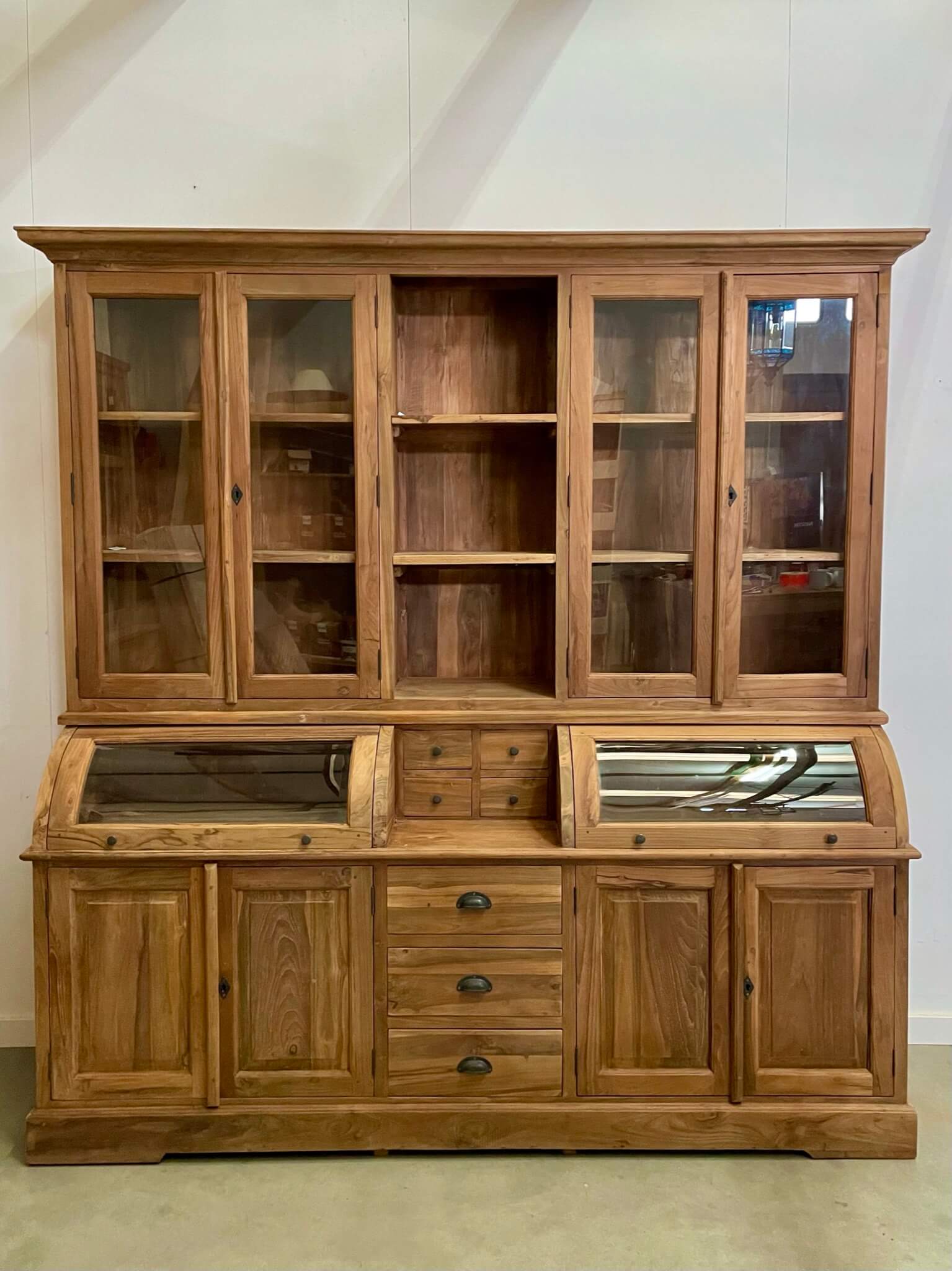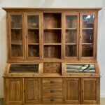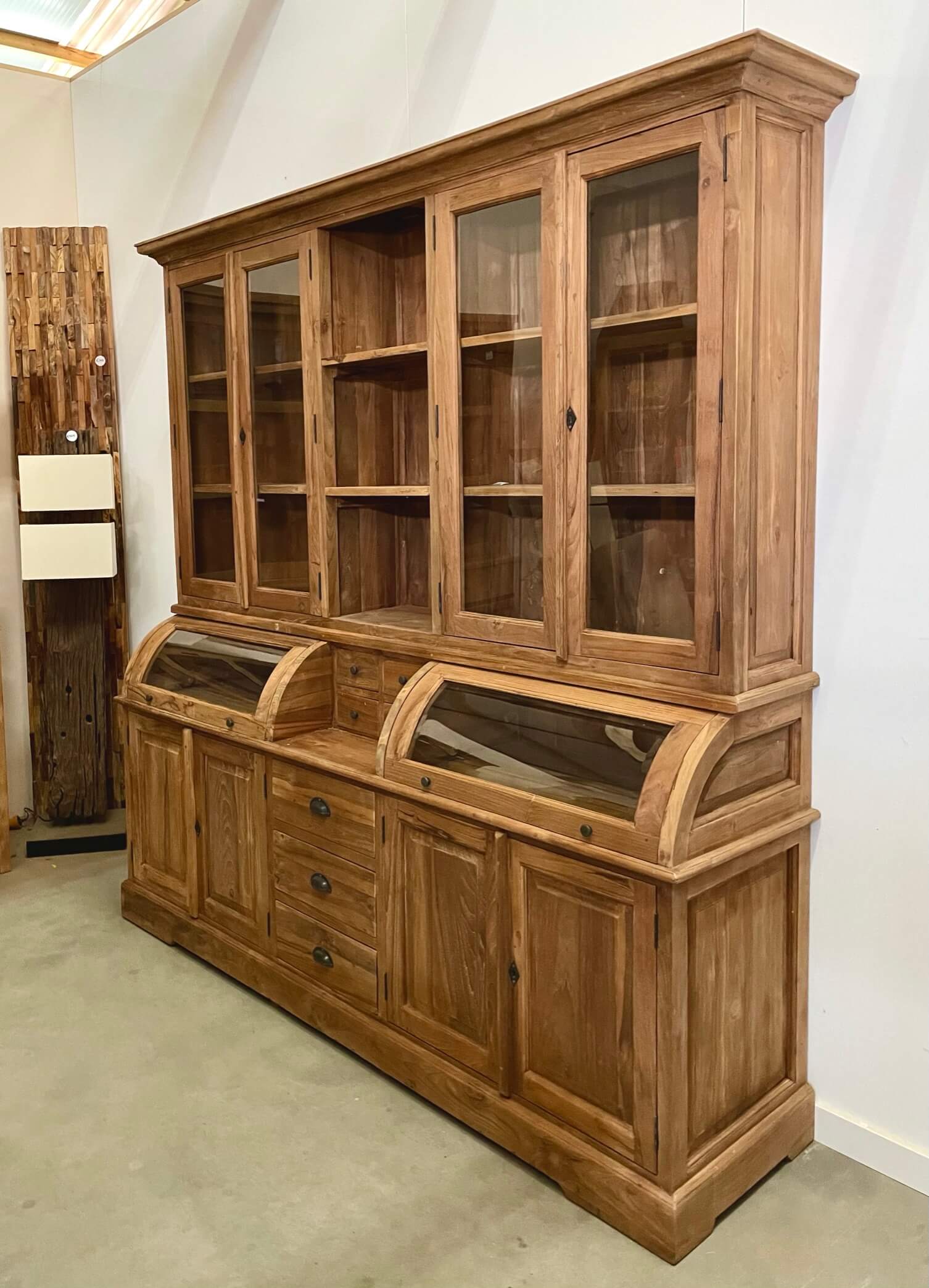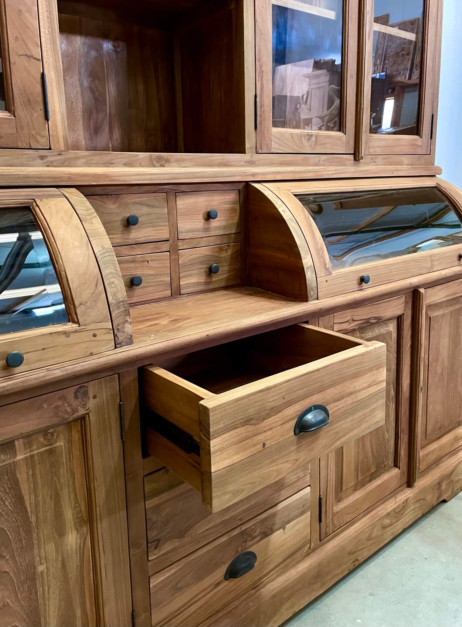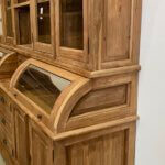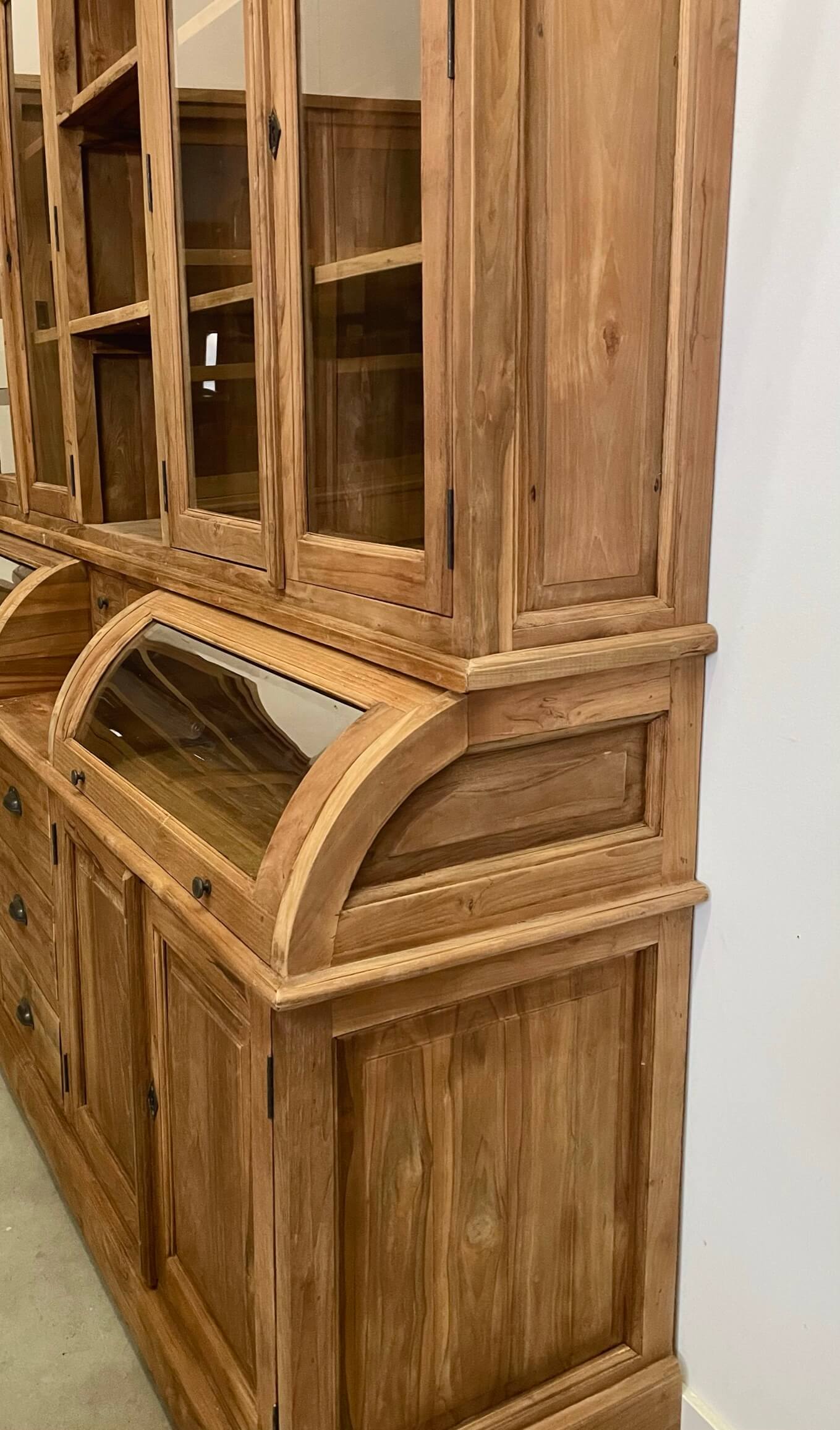The cream of the crop among grocery cabinets, this cabinet is made out of the best quality old teak wood. The glass of the valves is facet cut. The drawers open smoothly on a metal rail.