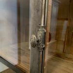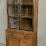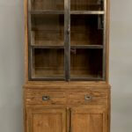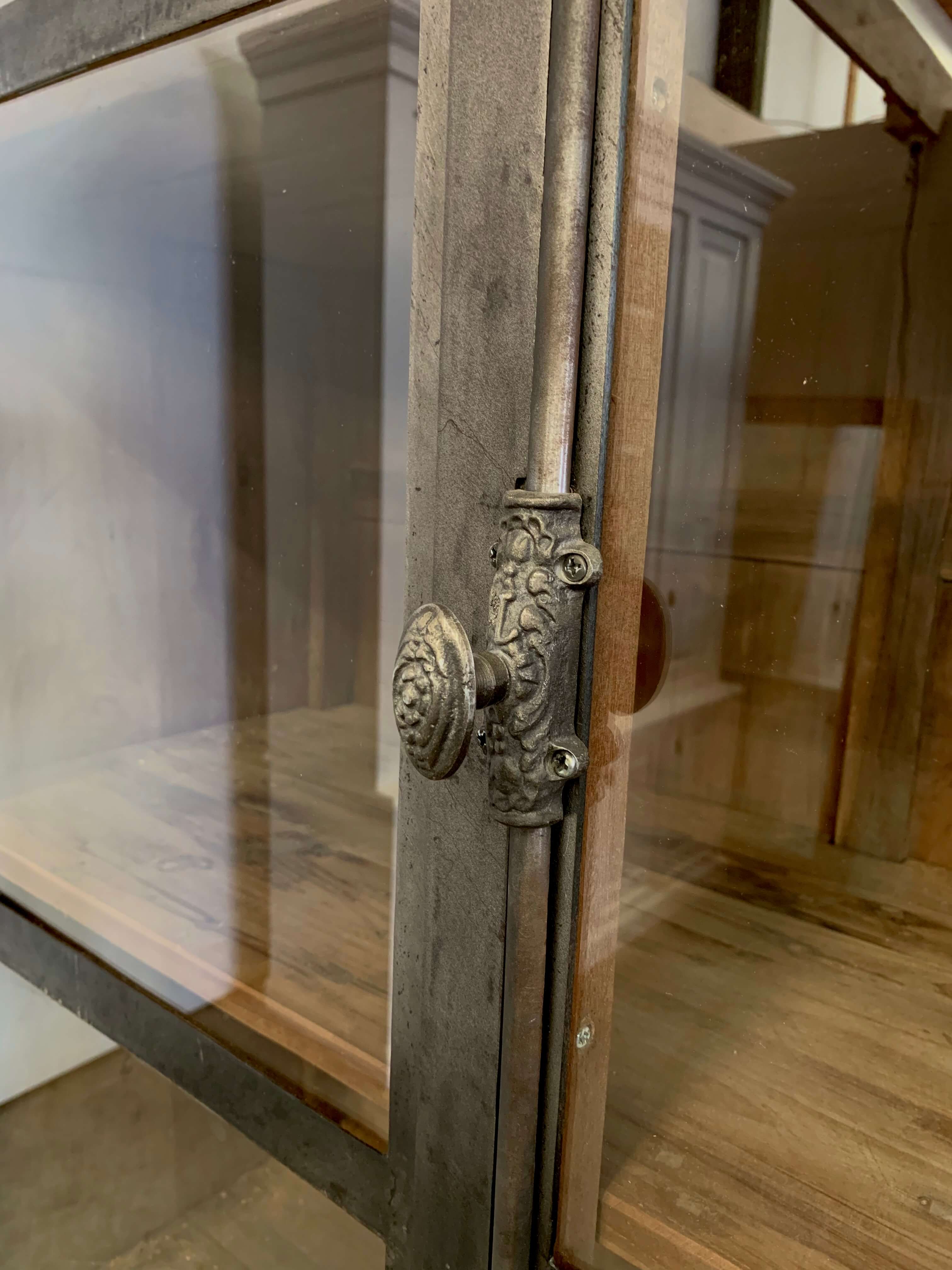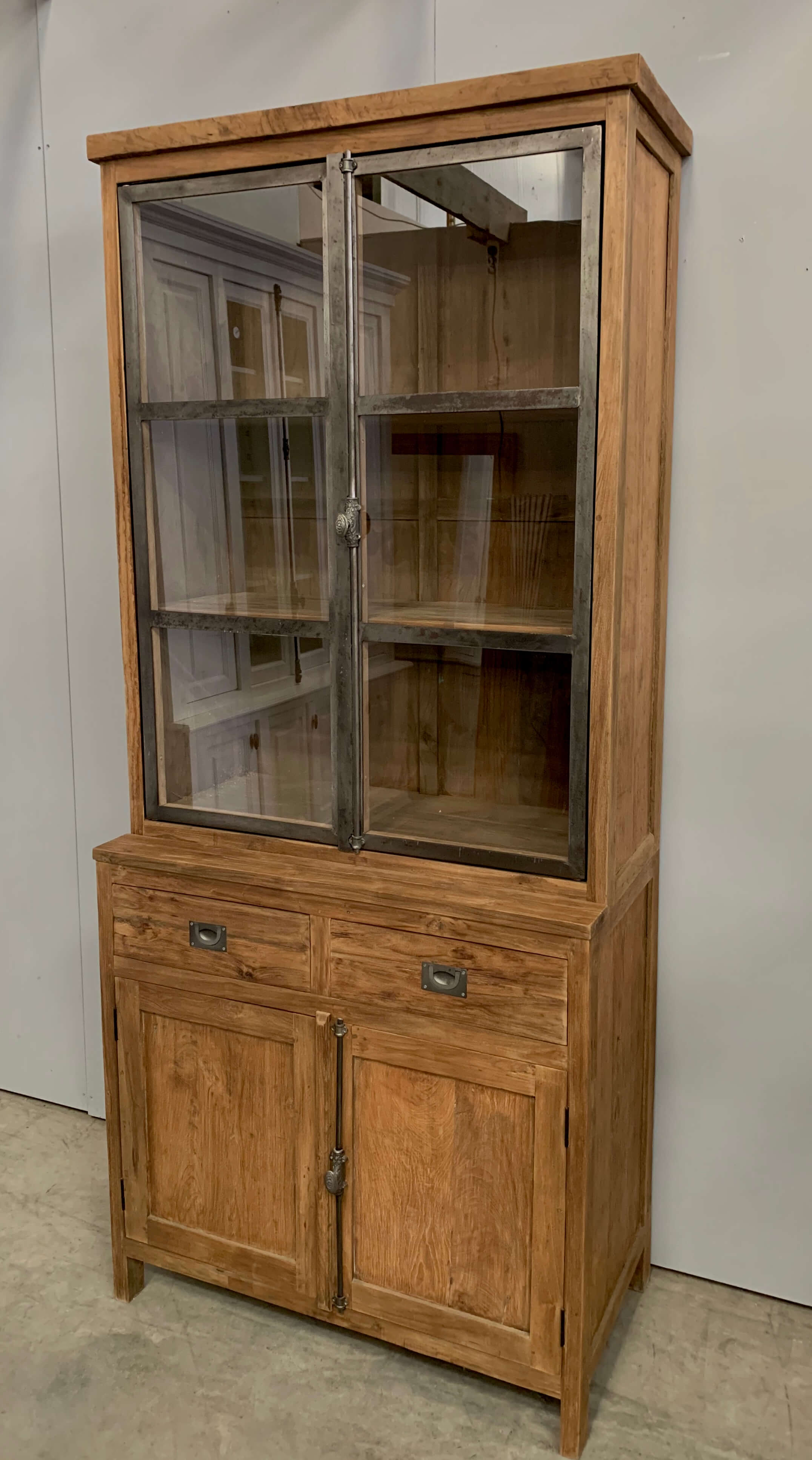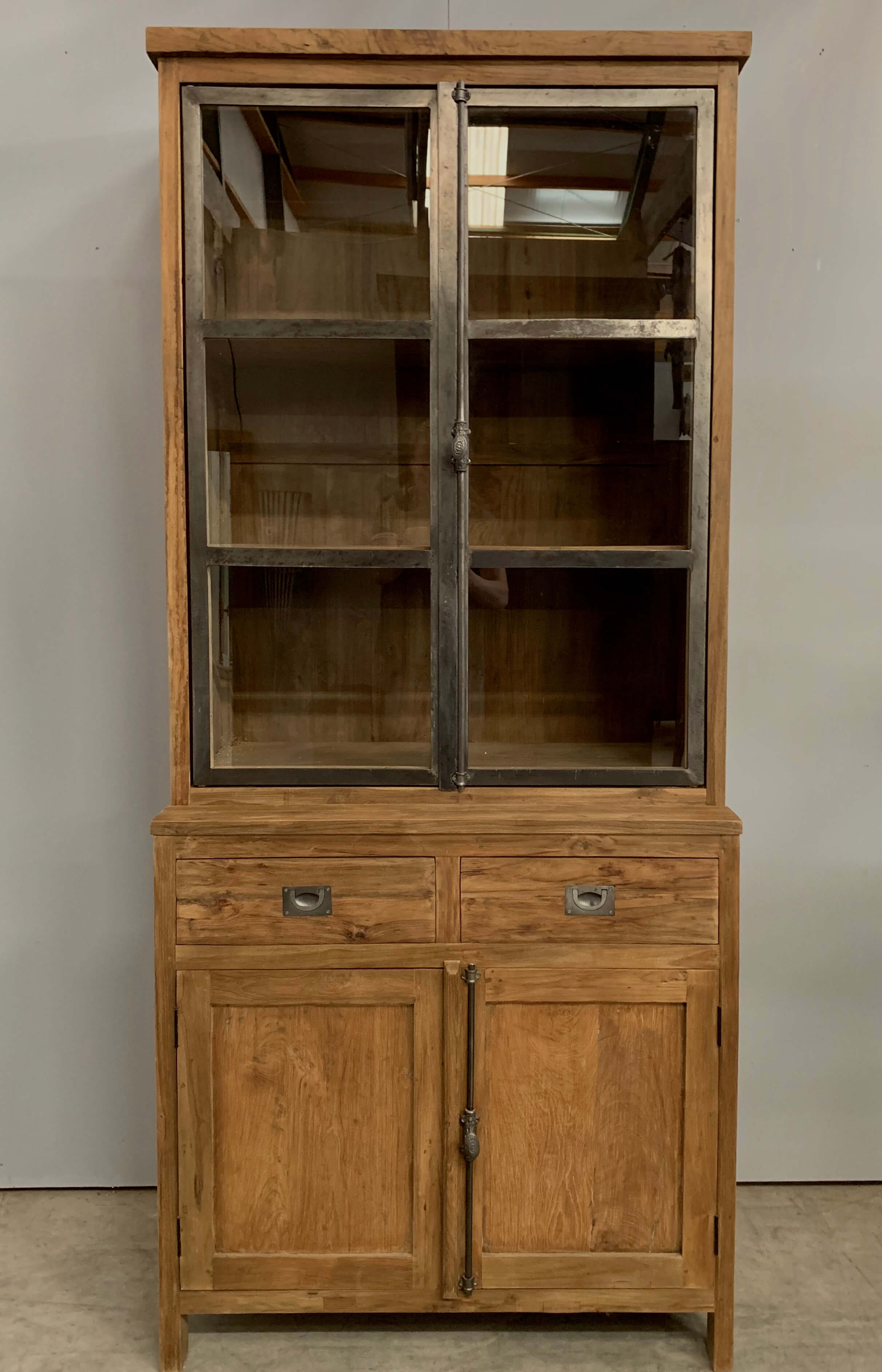 Industrial display cabinet with steel doors. The teak has been left rougher for an even more robust look.