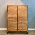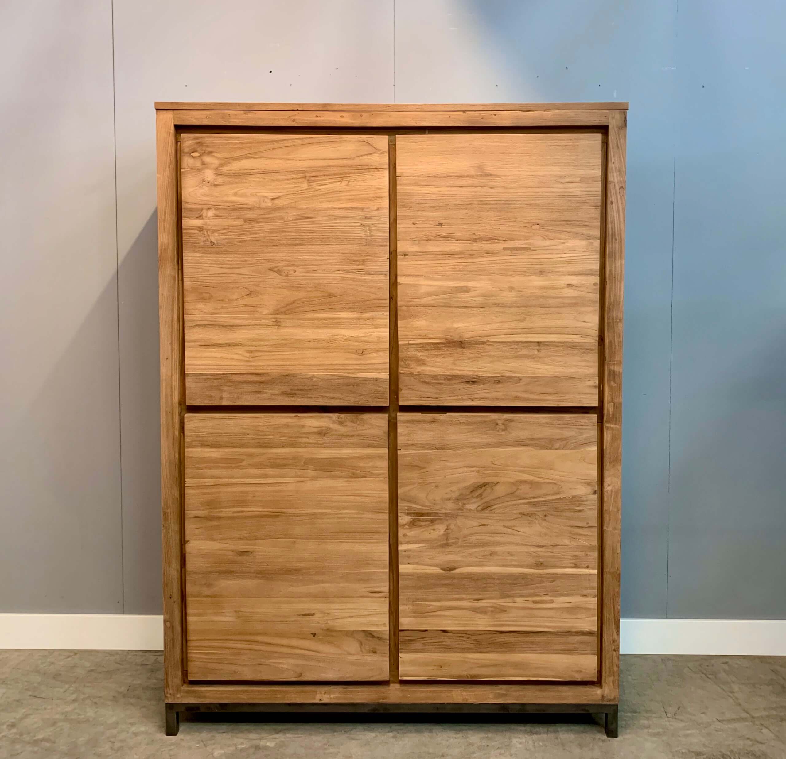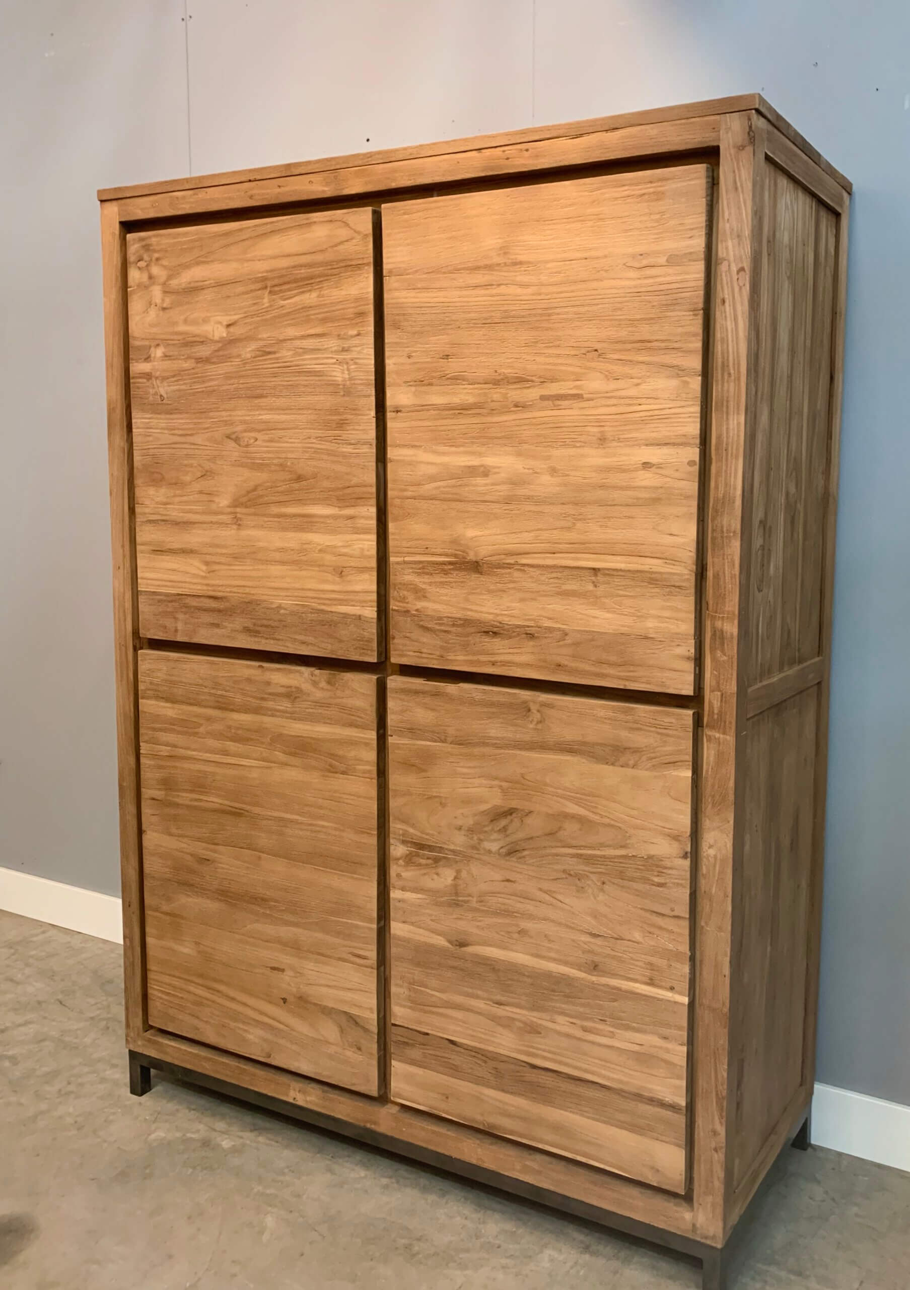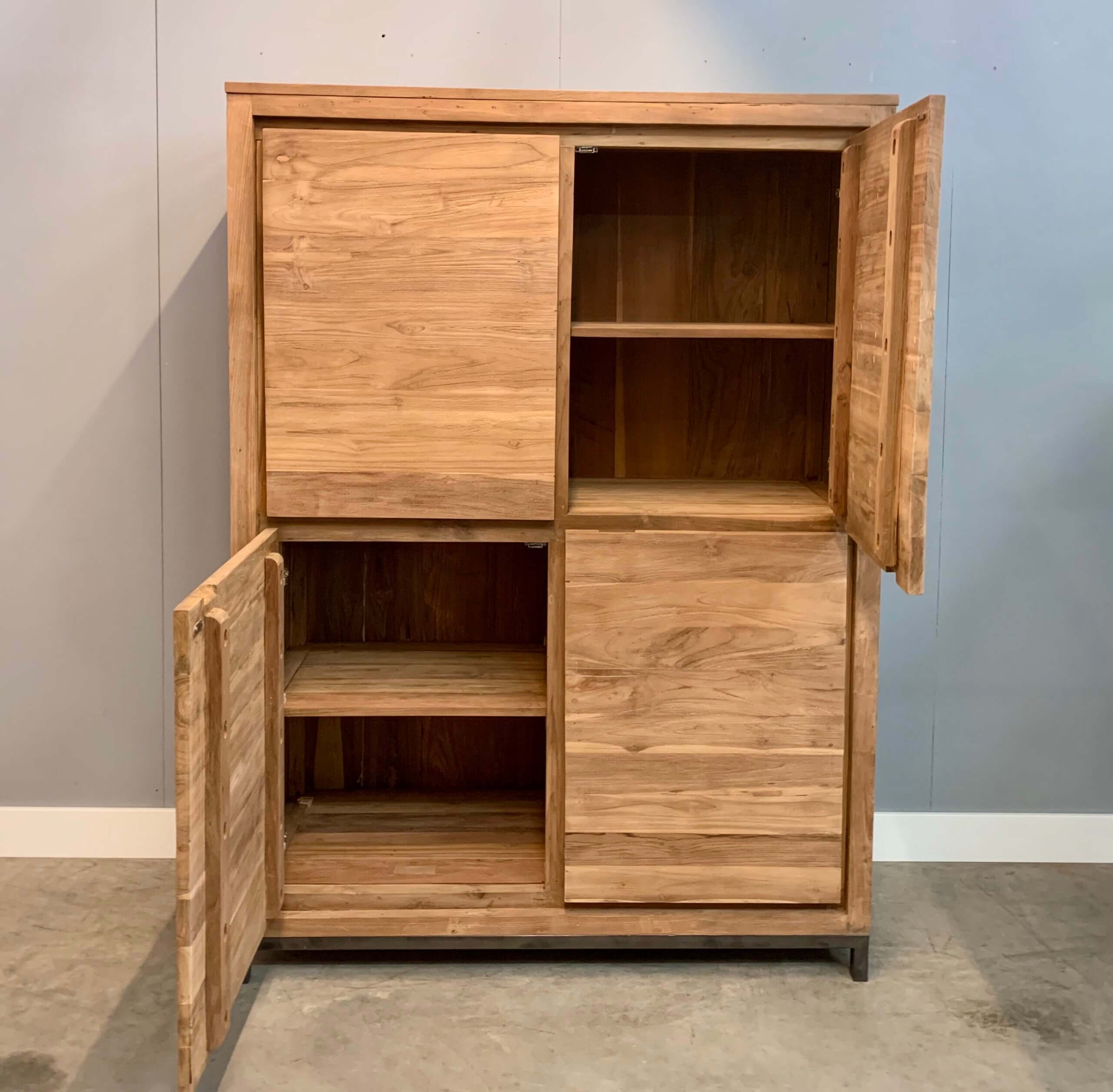 Closed cabinet made of recycled untreated teak. The steel frame gives the cabinet an industrial look. Next to the fact that this cabinet has a lot of storage space, it also offers a lot of privacy behind the closed doors.