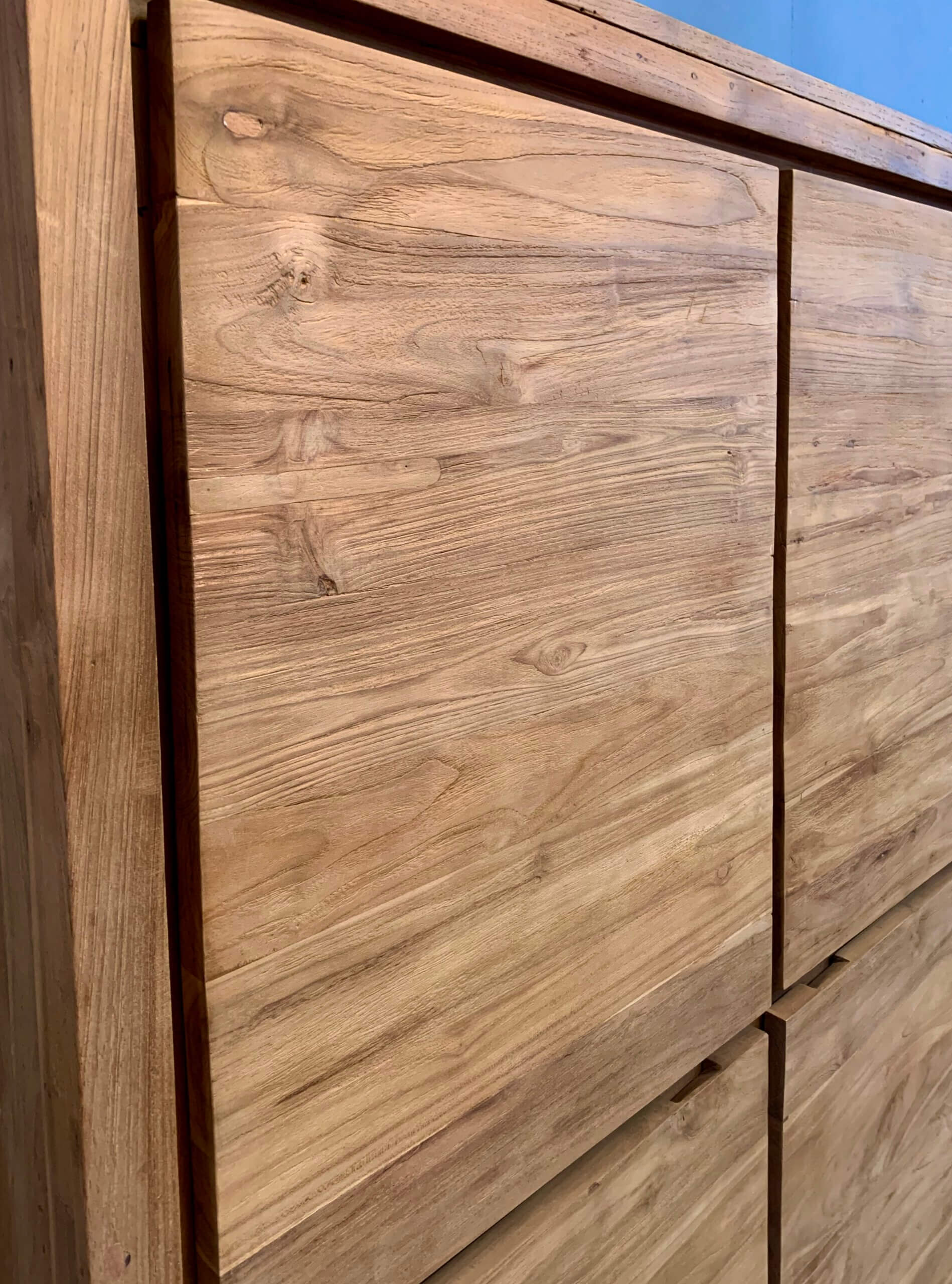 The modern closed teak cabinet is made of untreated recycled teak. This means that the wood comes from old demolition buildings in Indonesia. The buildings are being demolished. Removing nails, filling holes and sanding the wood is necessary to prepare the wood for further use. Through this entire process, each cabinet is unique. This also makes the cabinet very durable, because no trees were cut for it! The doors of this cabinet are slightly roughened to give the cabinet a slightly more robust look.