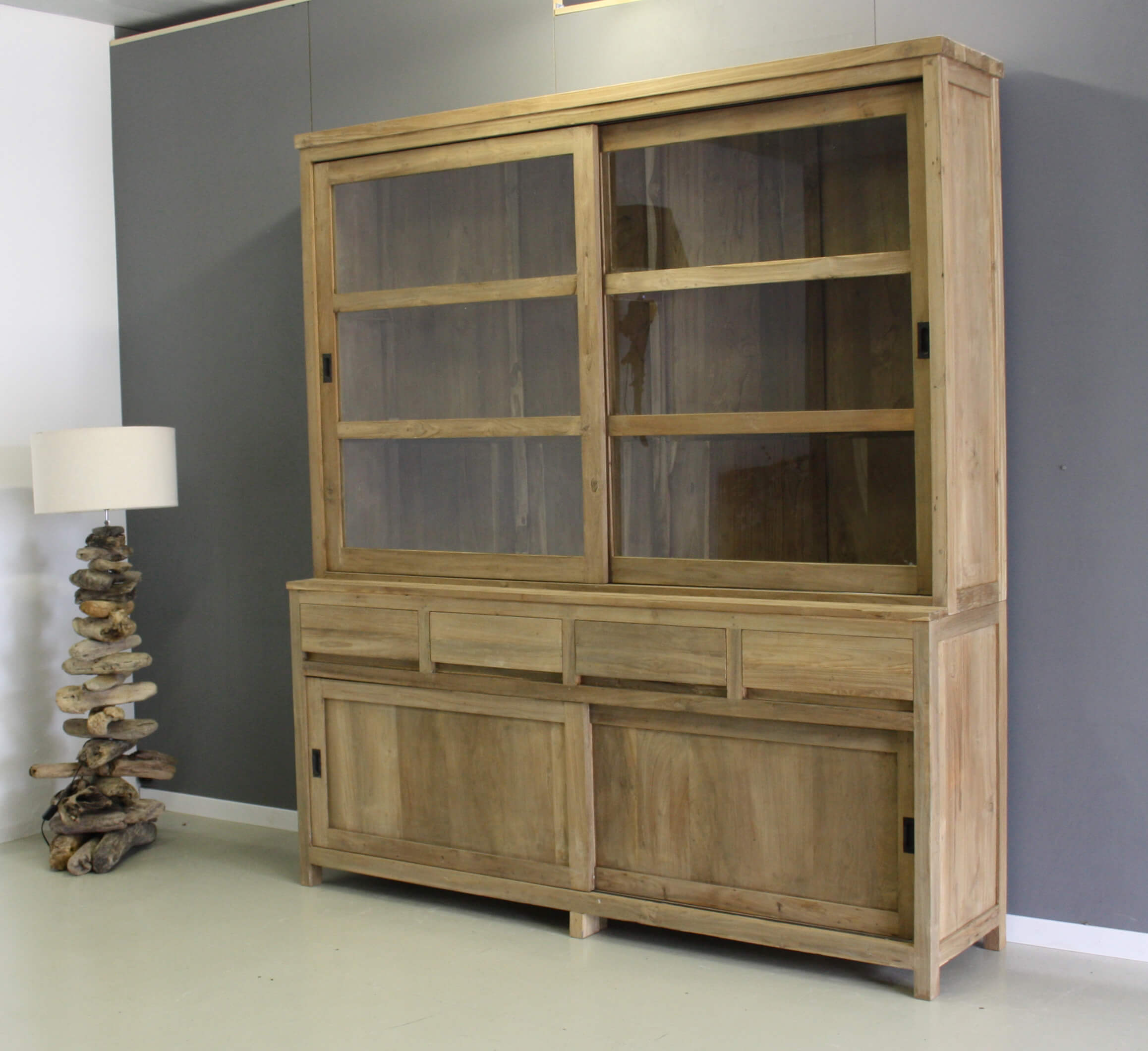 This cabinet is made of high-quality recycled teak wood. This means that the wood is taken from old demolition buildings. The wood is cleaned of paint and nails and then sanded. Bad spots will be filled. This gives each piece of furniture a unique look. The advantage of recycled wood is that the wood has been allowed to dry naturally. As a result, the chance of shrinkage cracks is much less than with plantation wood.