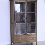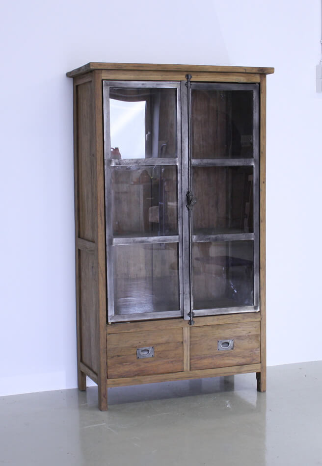 Playful cabinet dingklik with iron frame around the glass. The spanjolet closure gives the cabinet character. Dingklik is a way of finishing the teak wood. The wood is left a bit more robust and then finished with wax. Model Turnhout.
