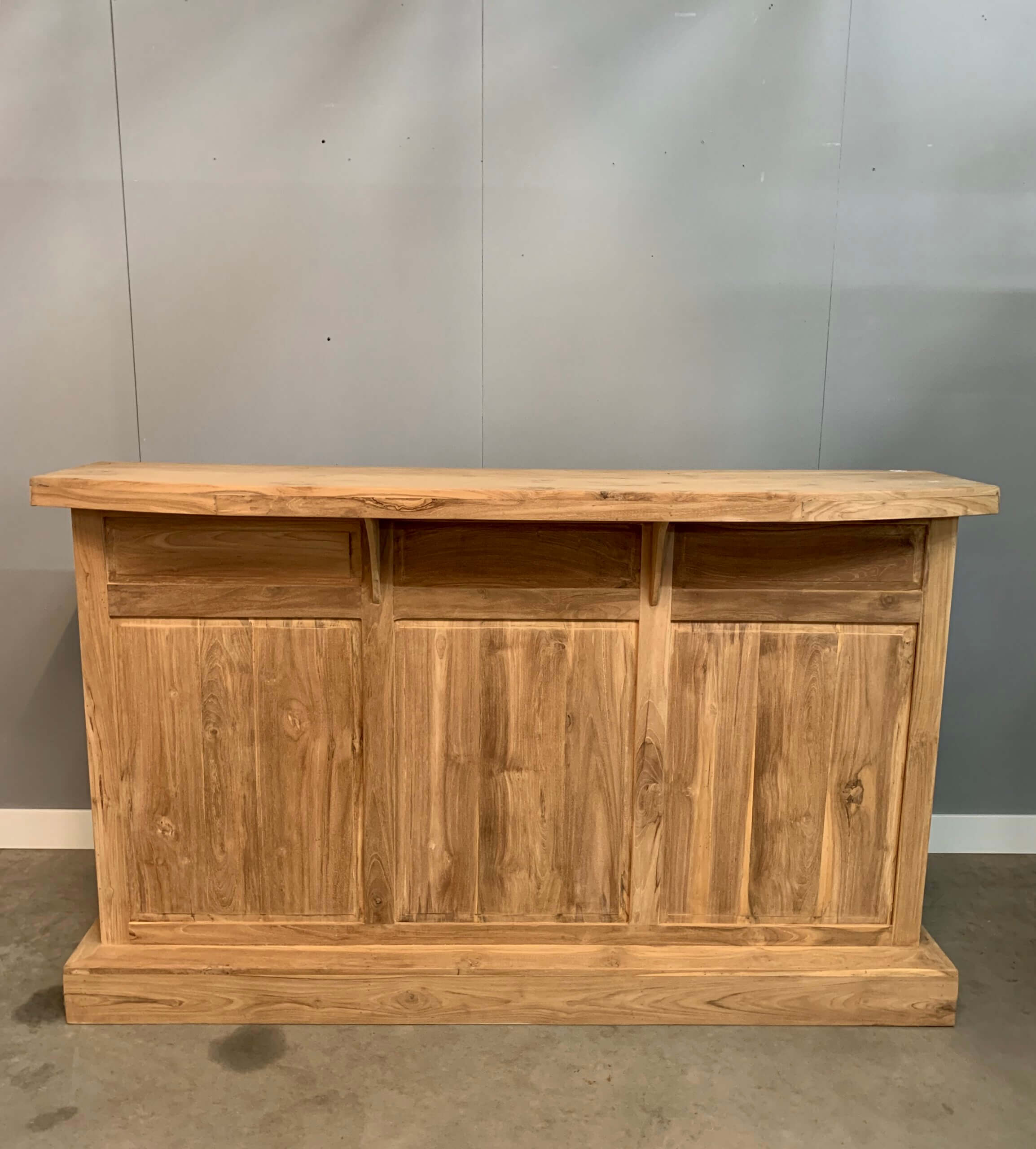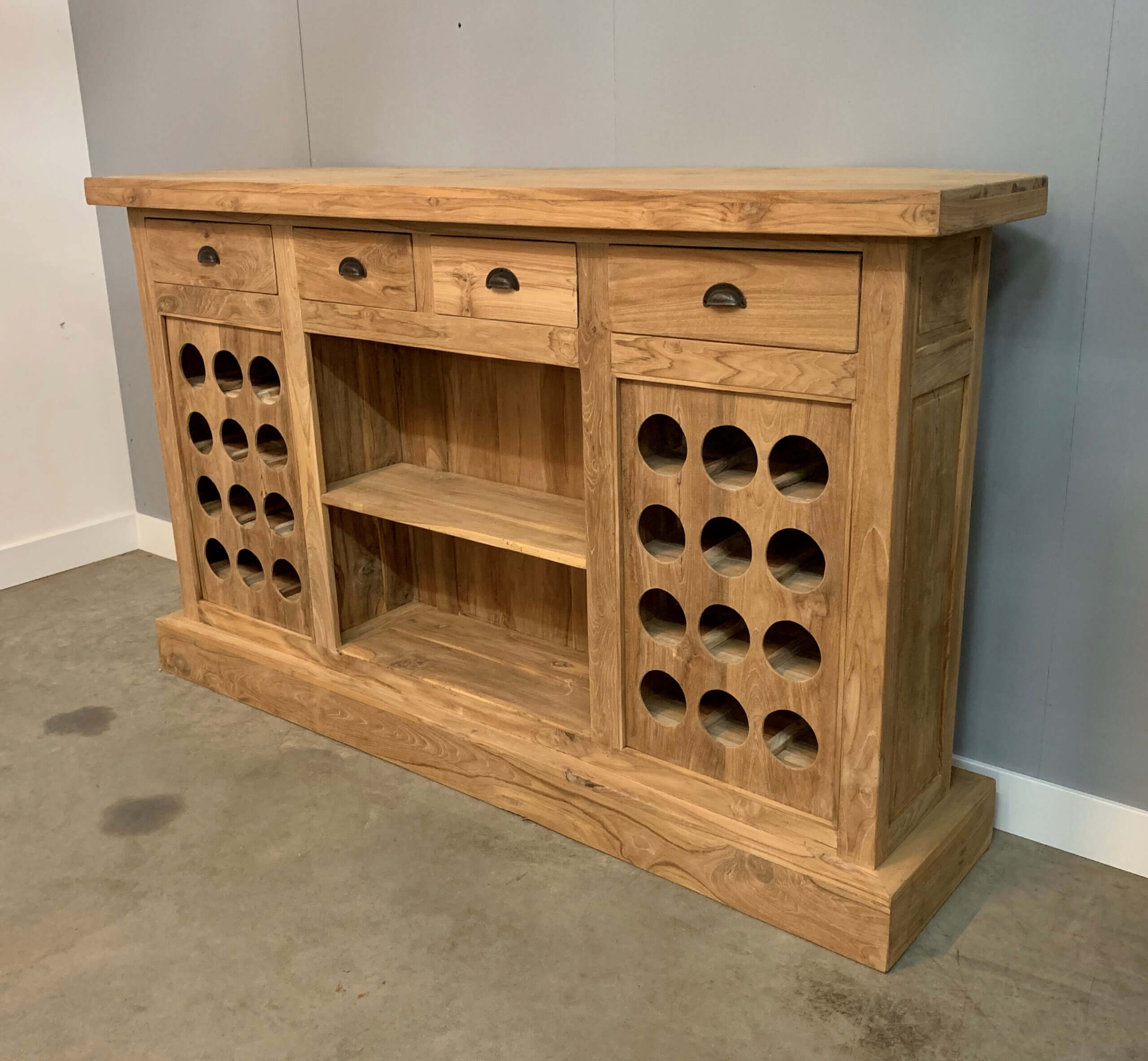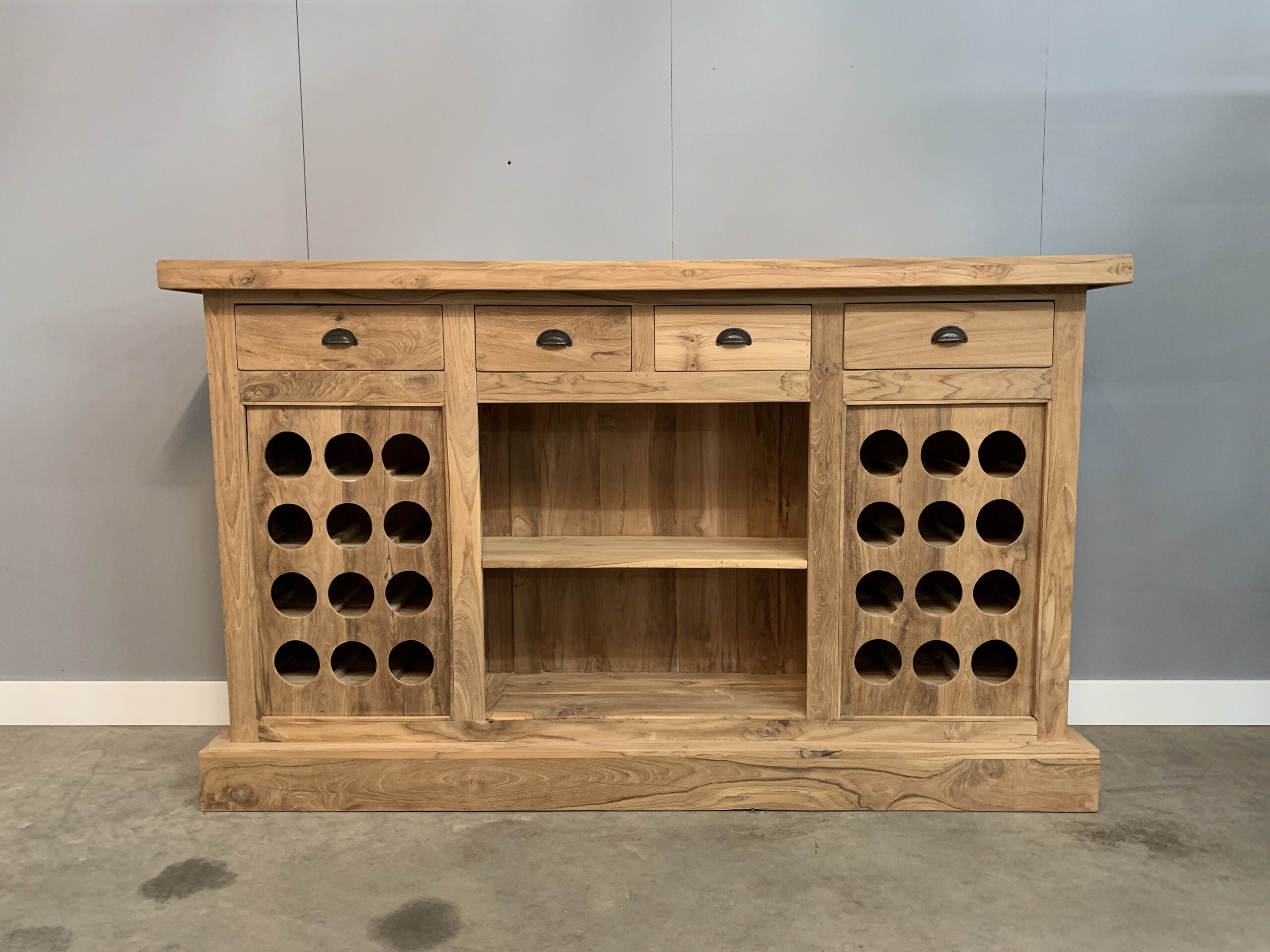 Barmeubel van plantage teakhout. Hiermee kan de liefhebber van een alcoholische versnapering zijn hart ophalen. Er is plek voor 24 flessen wijn, daarnaast bieden de planken en laden nog extra bergruimte.