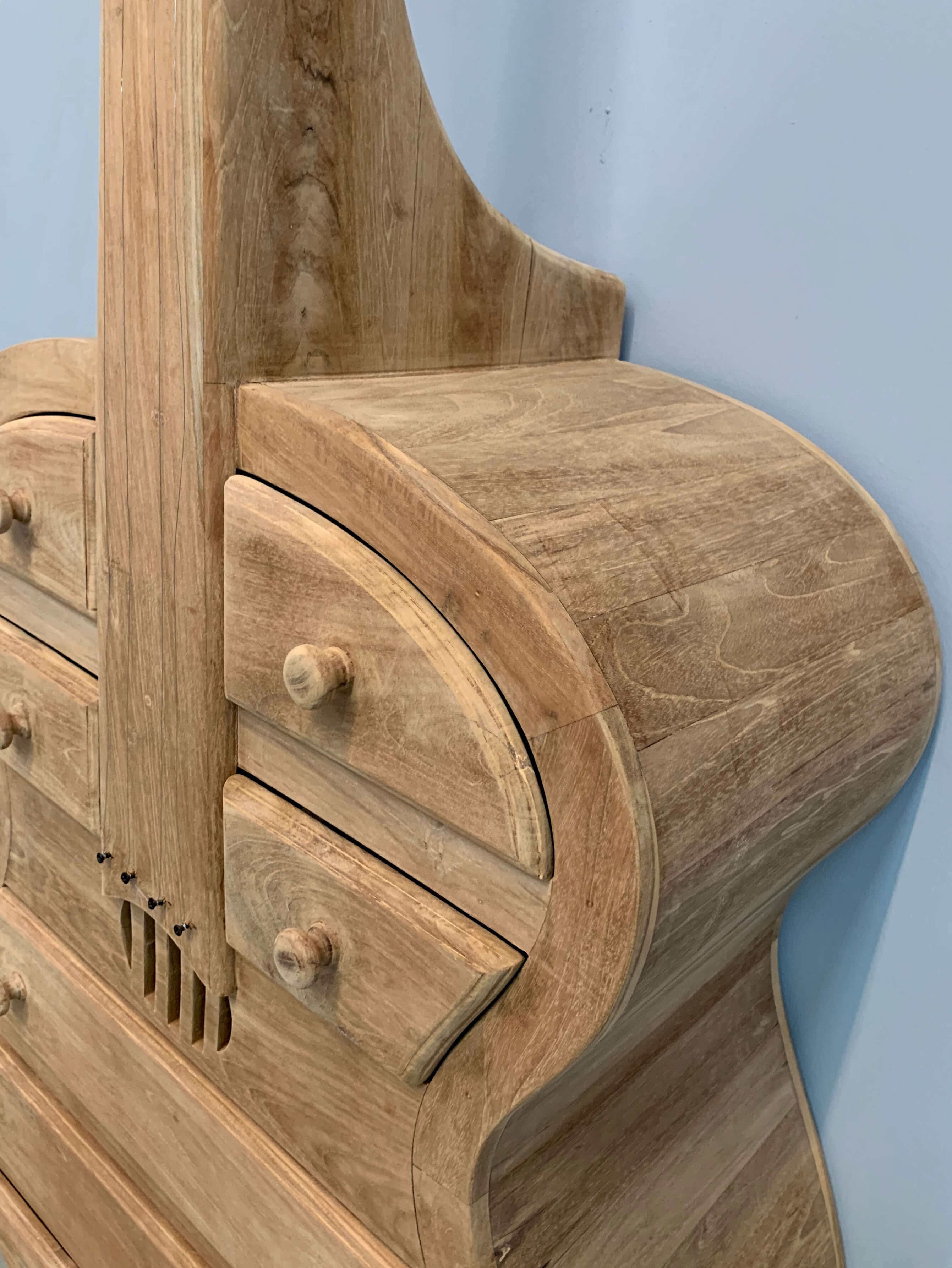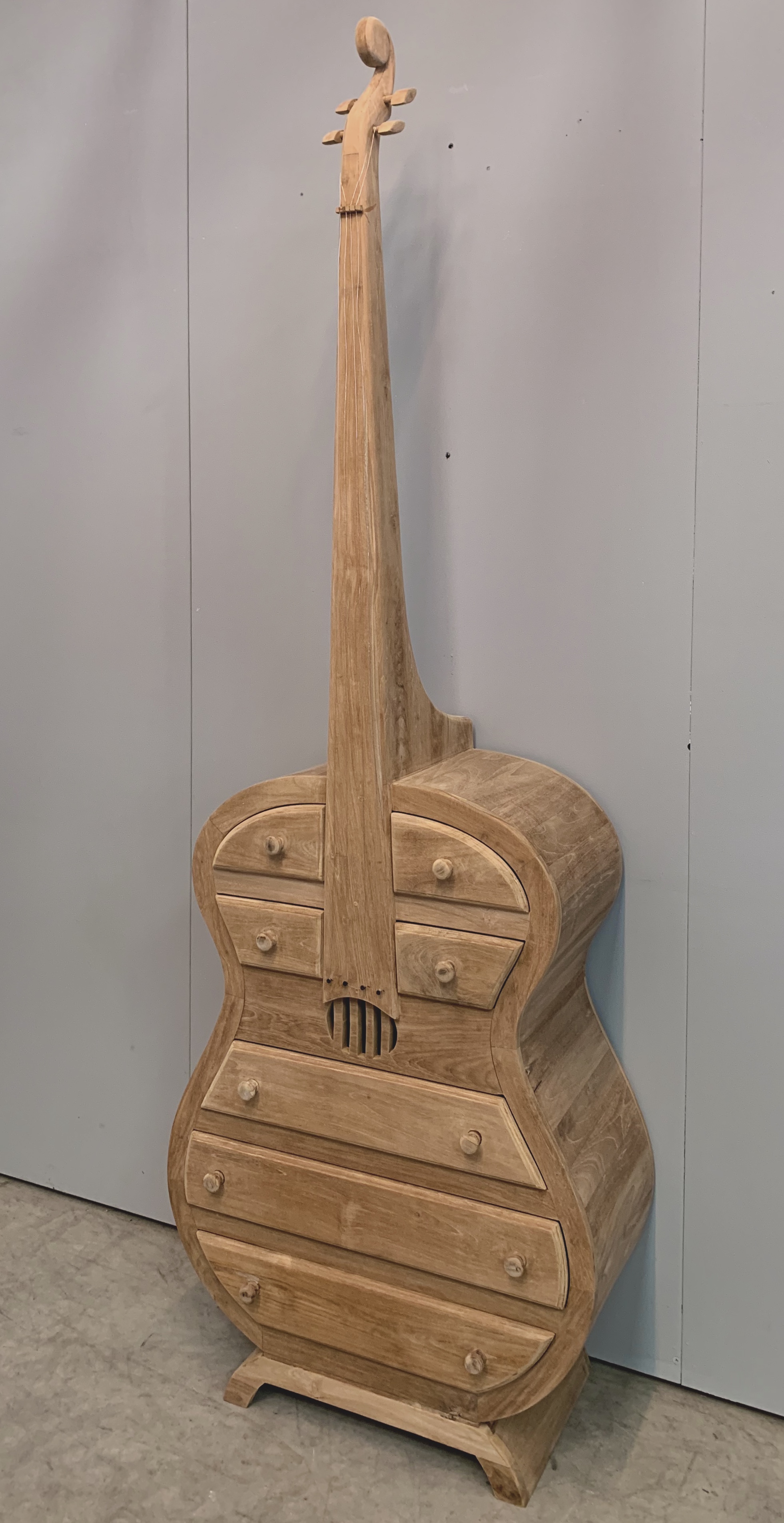 Decoratieve basgitaar van teakhout.