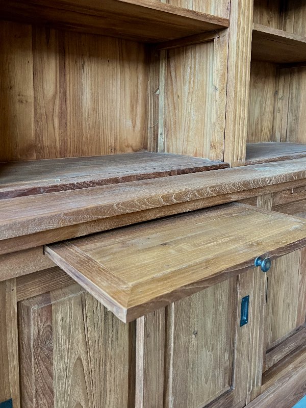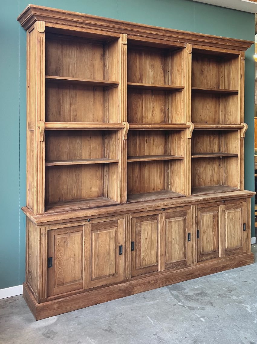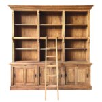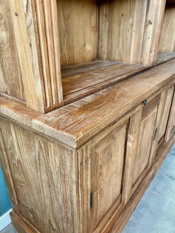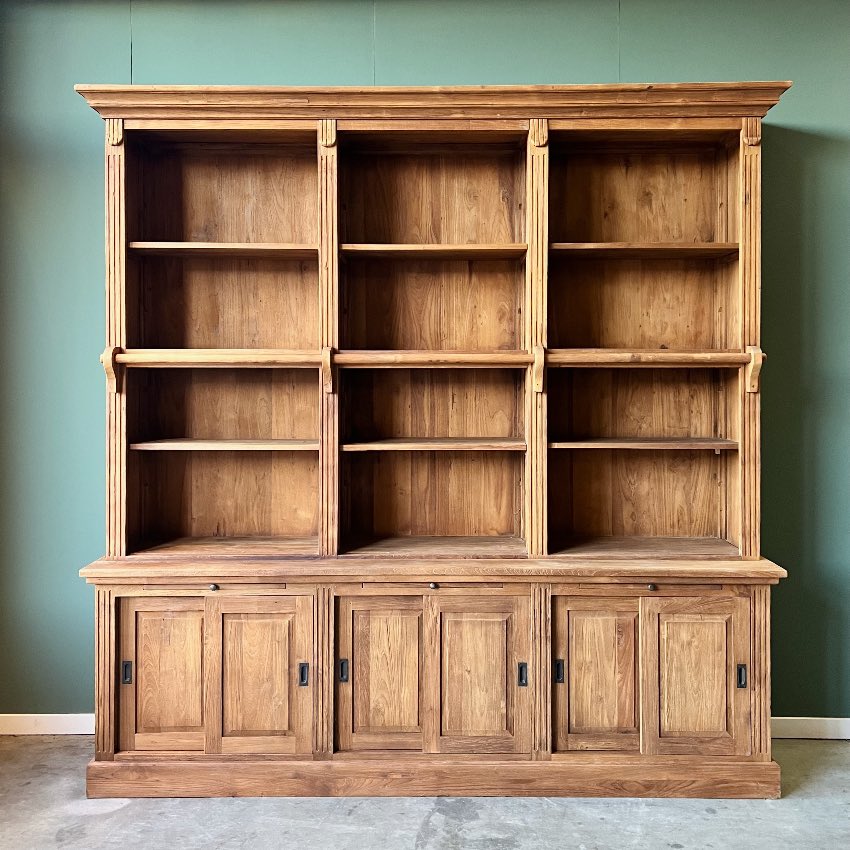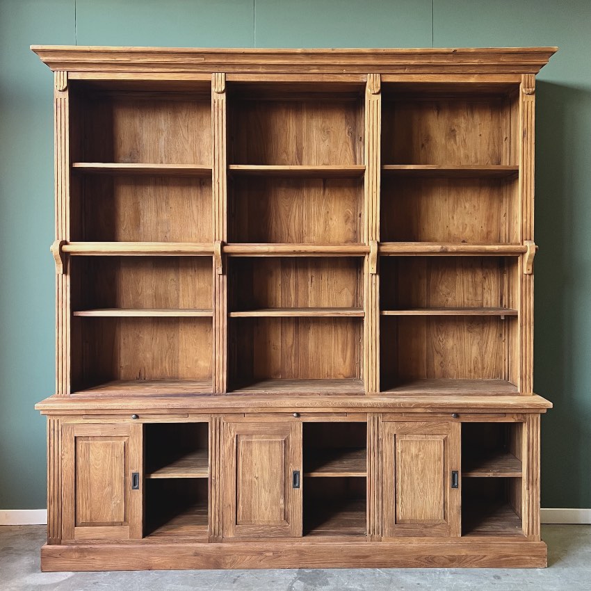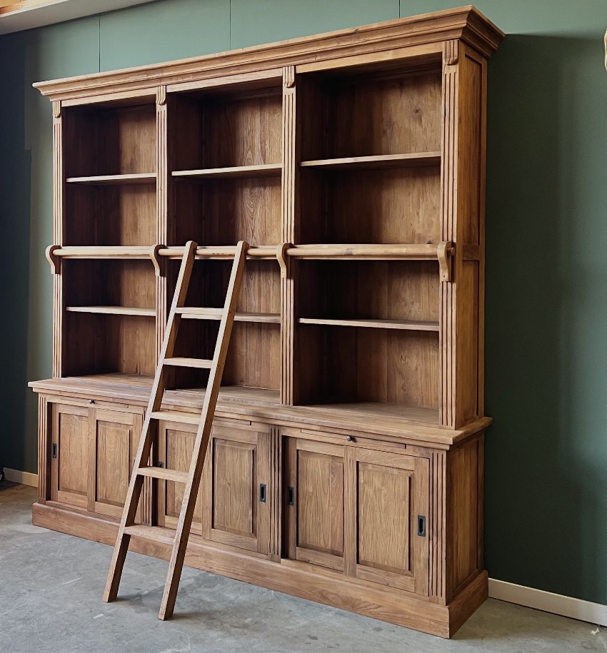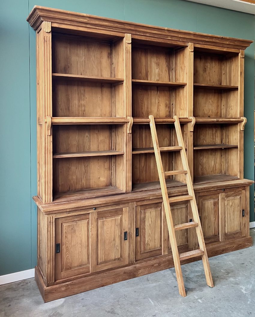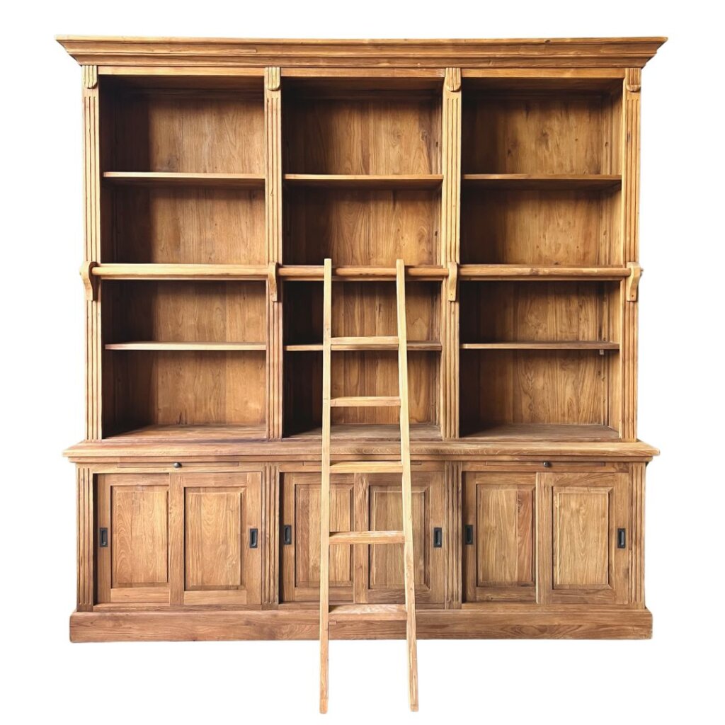 Ontdek onze indrukwekkende boekenkast, vervaardigd uit licht geborsteld gerecycled teakhout met een klassieke uitstraling. Deze robuuste kast biedt niet alleen volop opbergruimte dankzij de verstelbare planken en de drie kasten met schuifdeuren in het onderstuk, maar wordt ook compleet geleverd met een bijpassende teakhouten aanleun trap voor gemakkelijk toegang tot de bovenste planken.