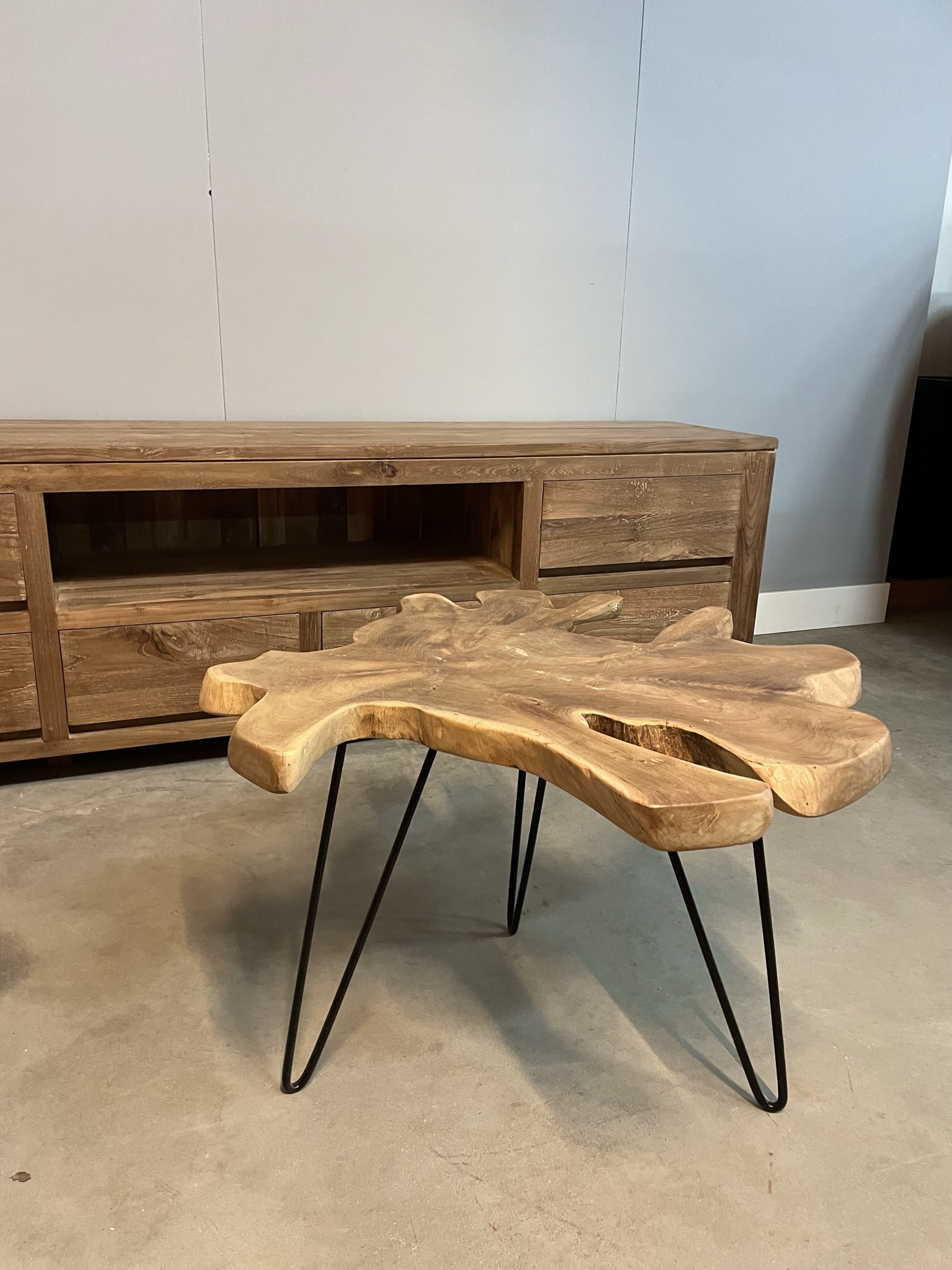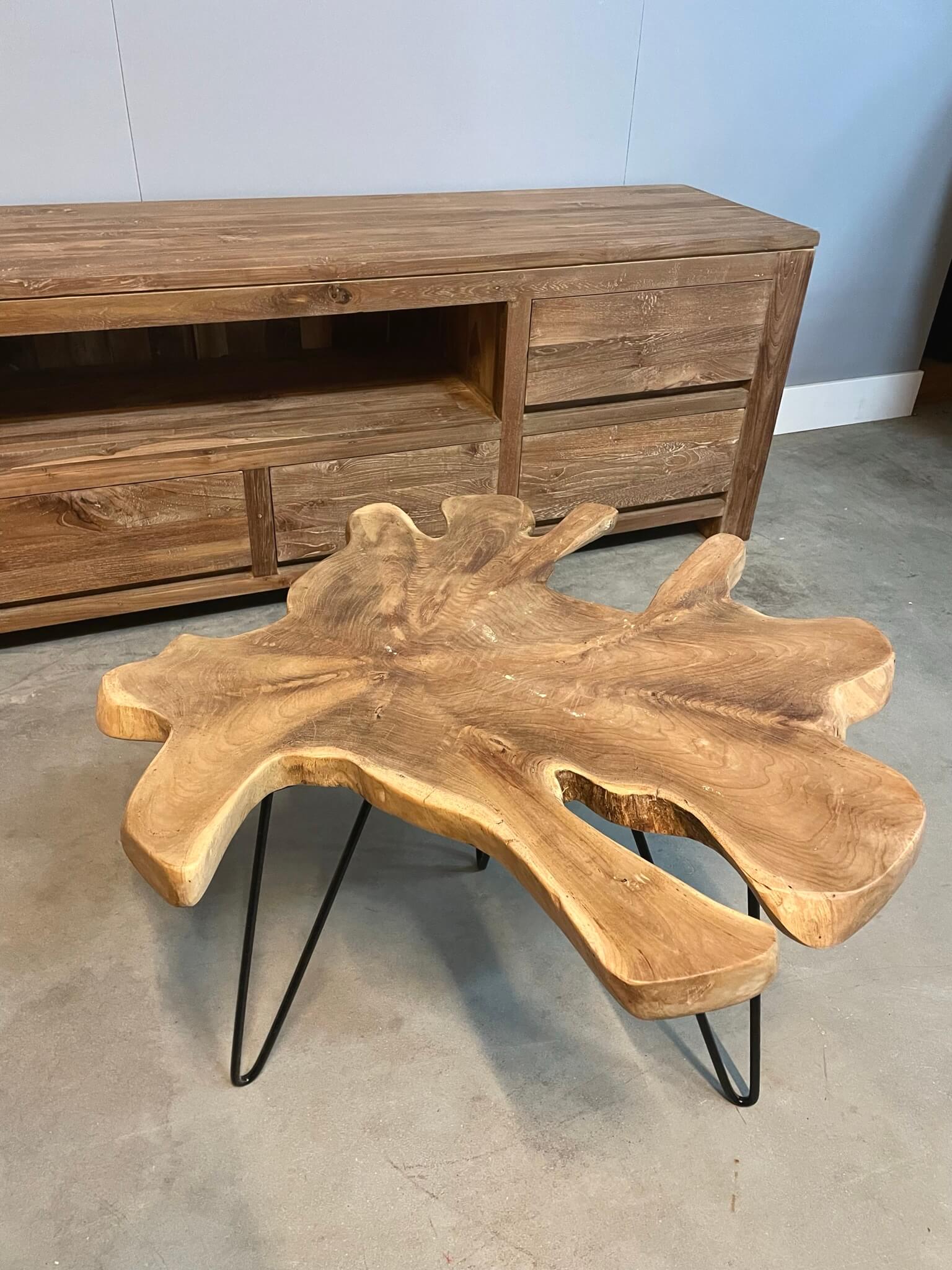 Speelse salon/bijzet tafel gemaakt van een stam doorsnede.