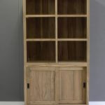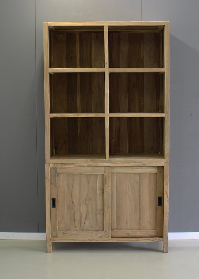 Fijne boekenkast met zes open vakken en twee schuifdeuren. Achter de schuifdeuren zit een extra plank. Dit is een ideale kantoorkast.