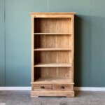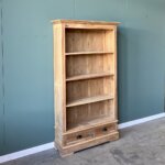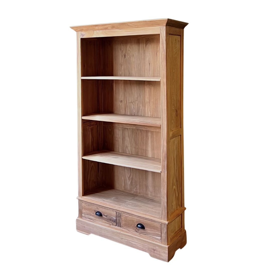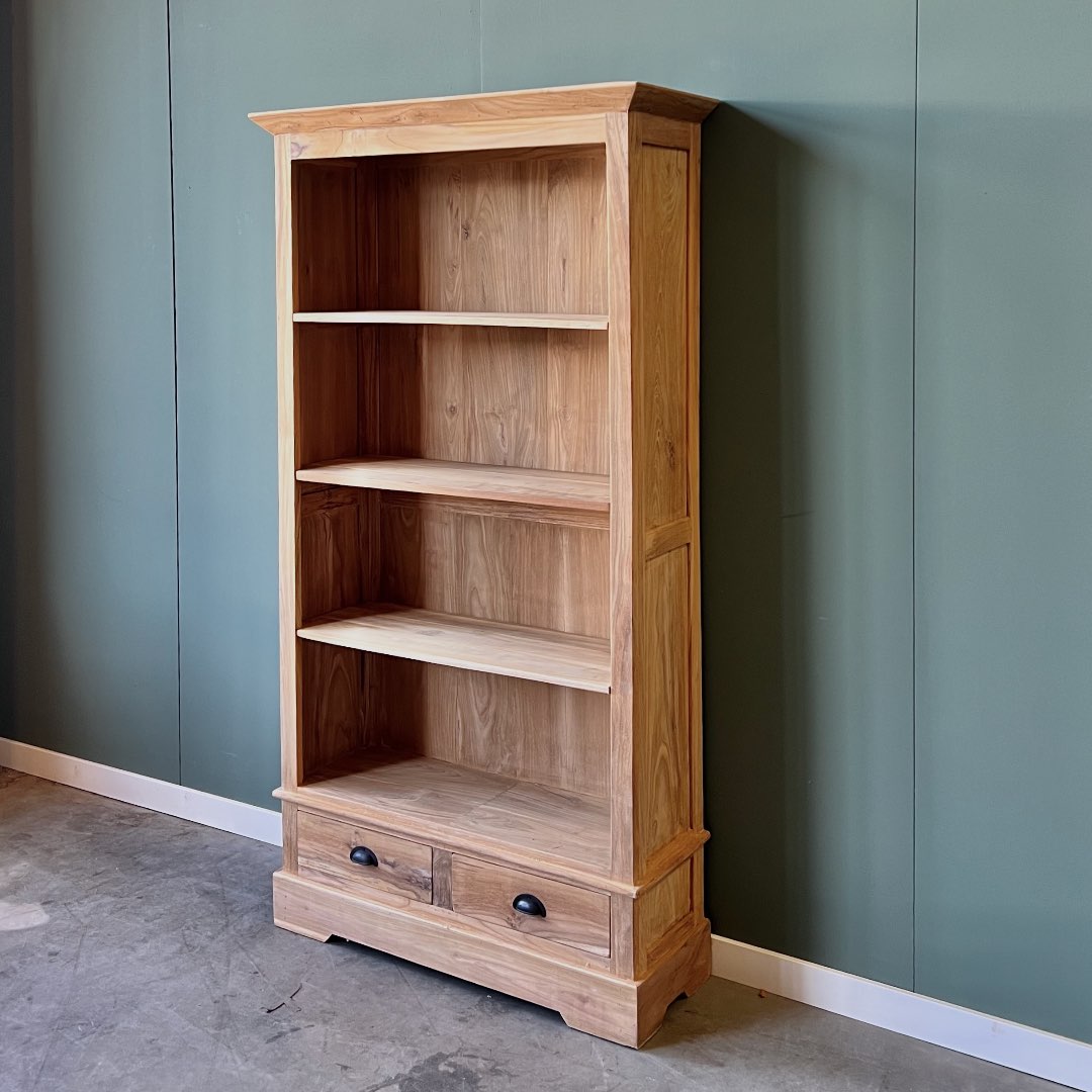Eenvoudig model boekenkast van teakhout. Met planken en onderin twee laden.
