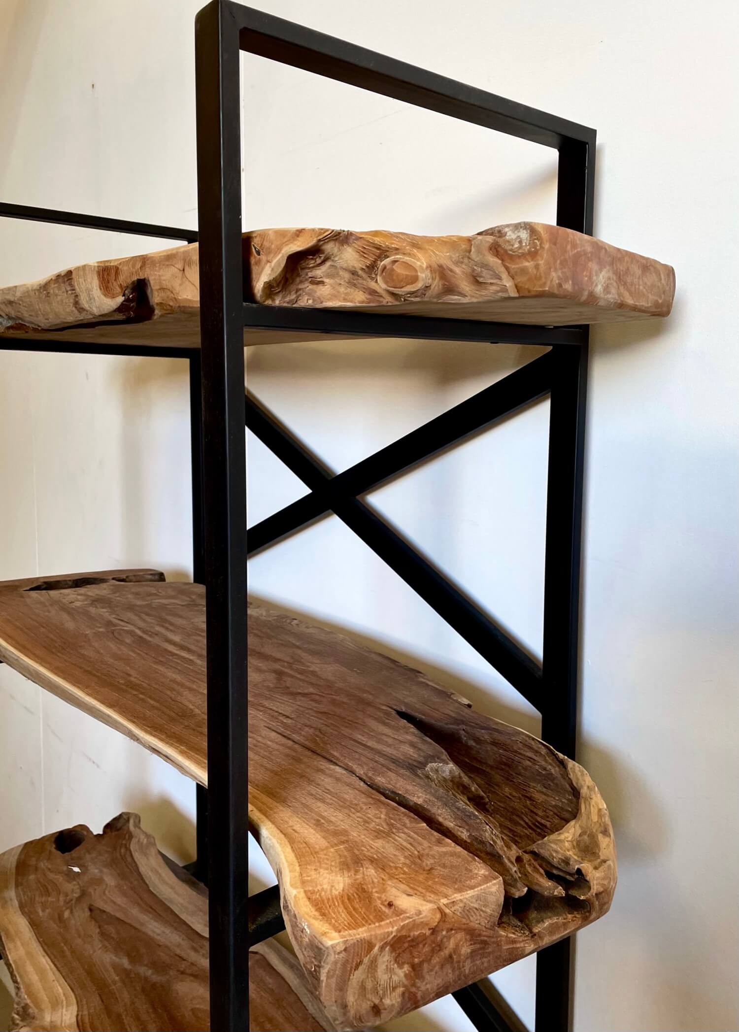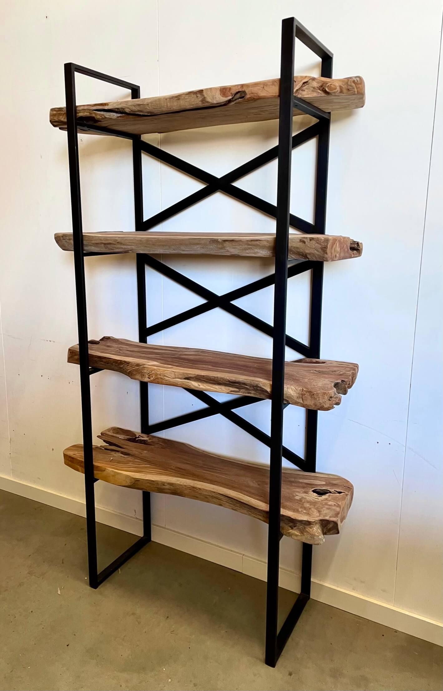 Mooie boekenkast van teak en staal. Door het robuuste hout en het stalen frame is deze kast een hele leuke toevoeging voor uw interieur!