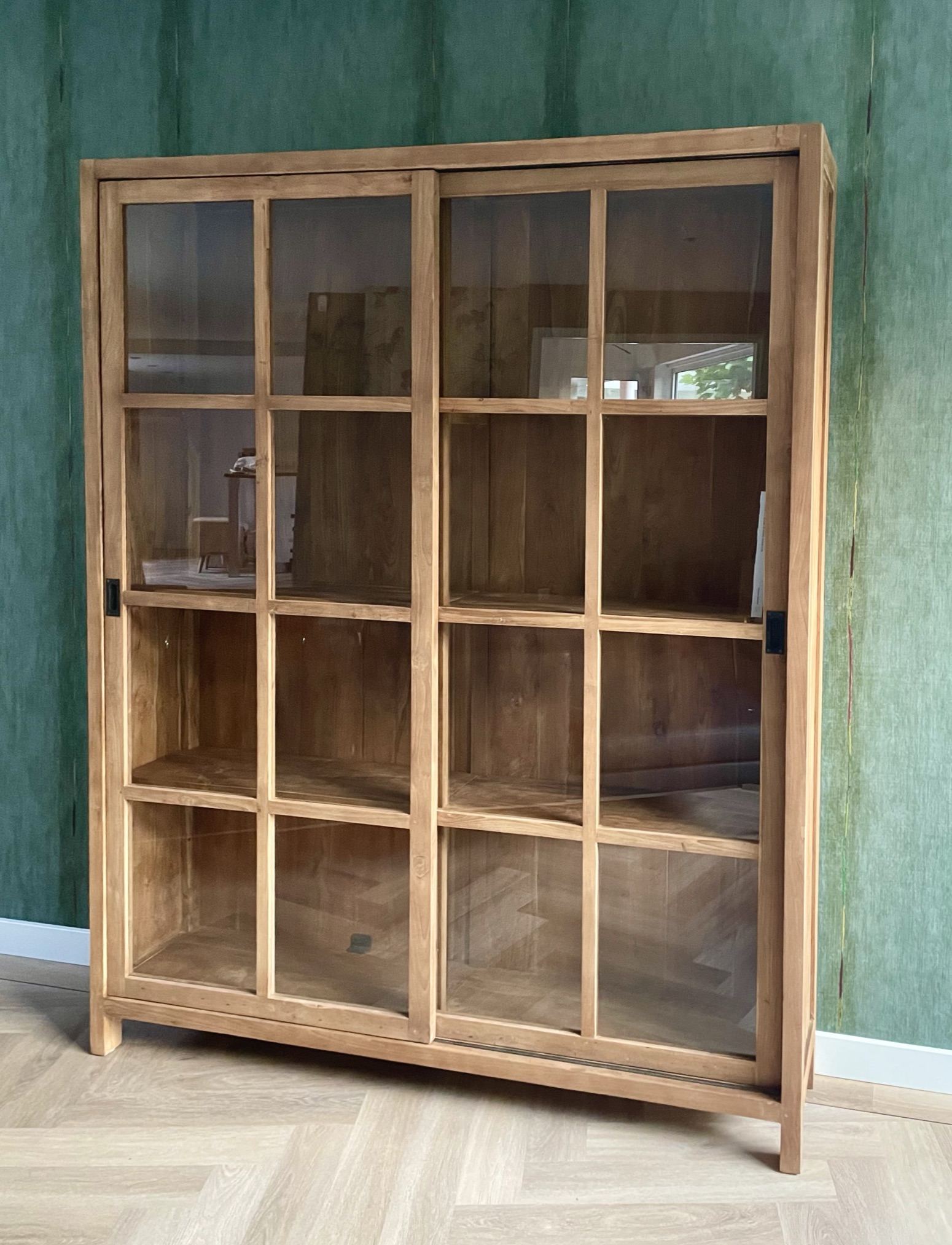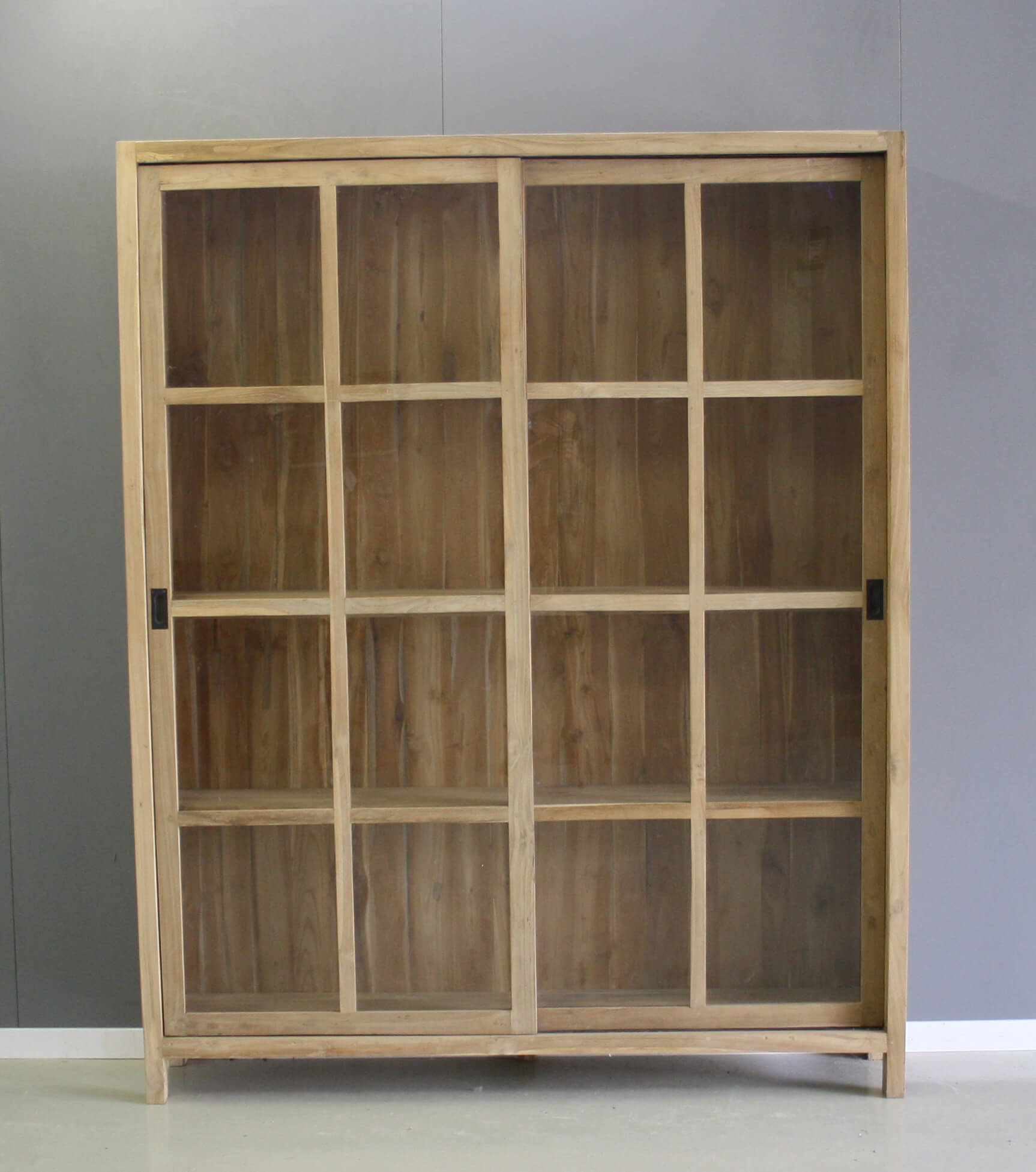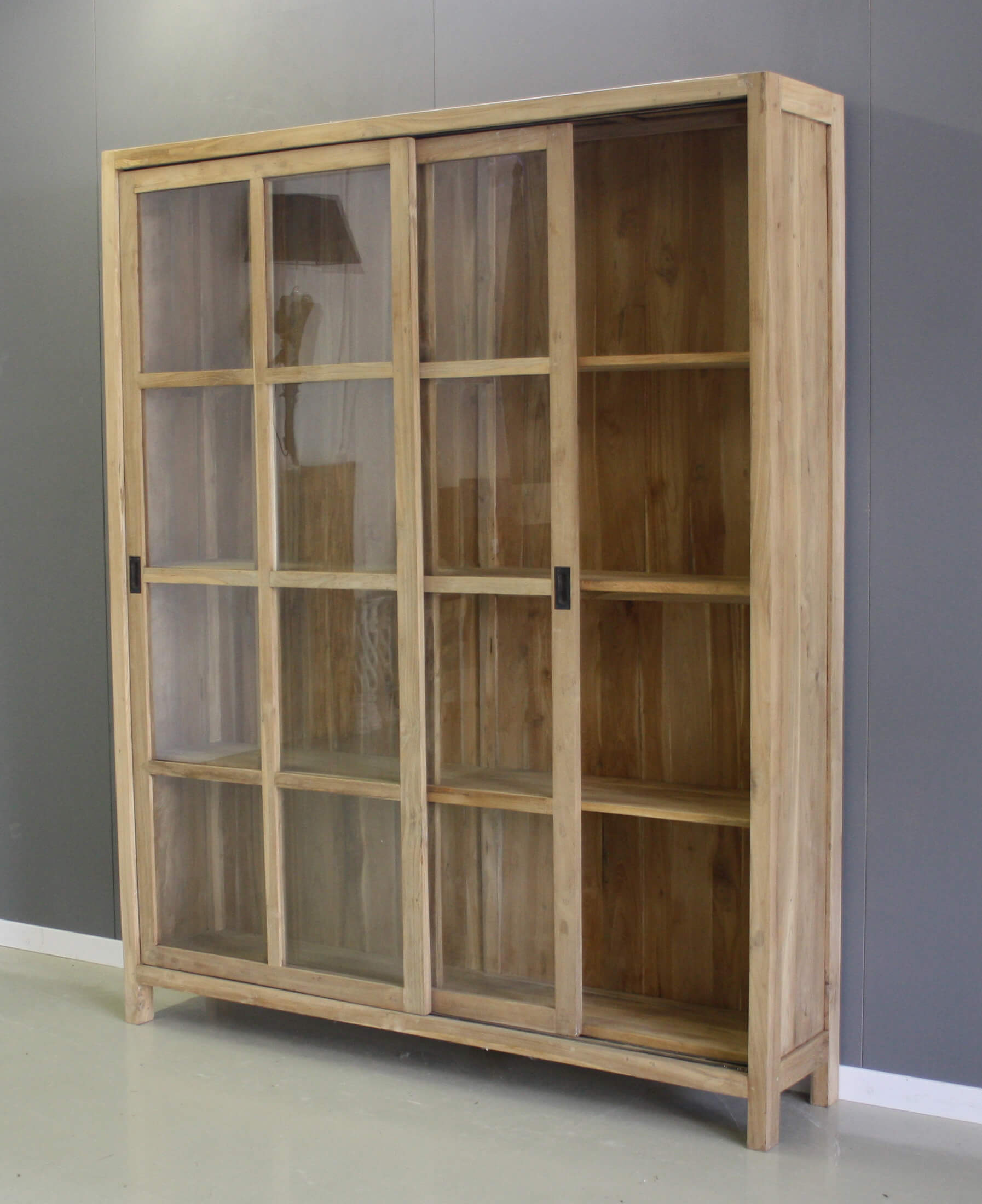 Stijlvolle teakhouten boekenkast met twee grote glazen schuifdeuren.