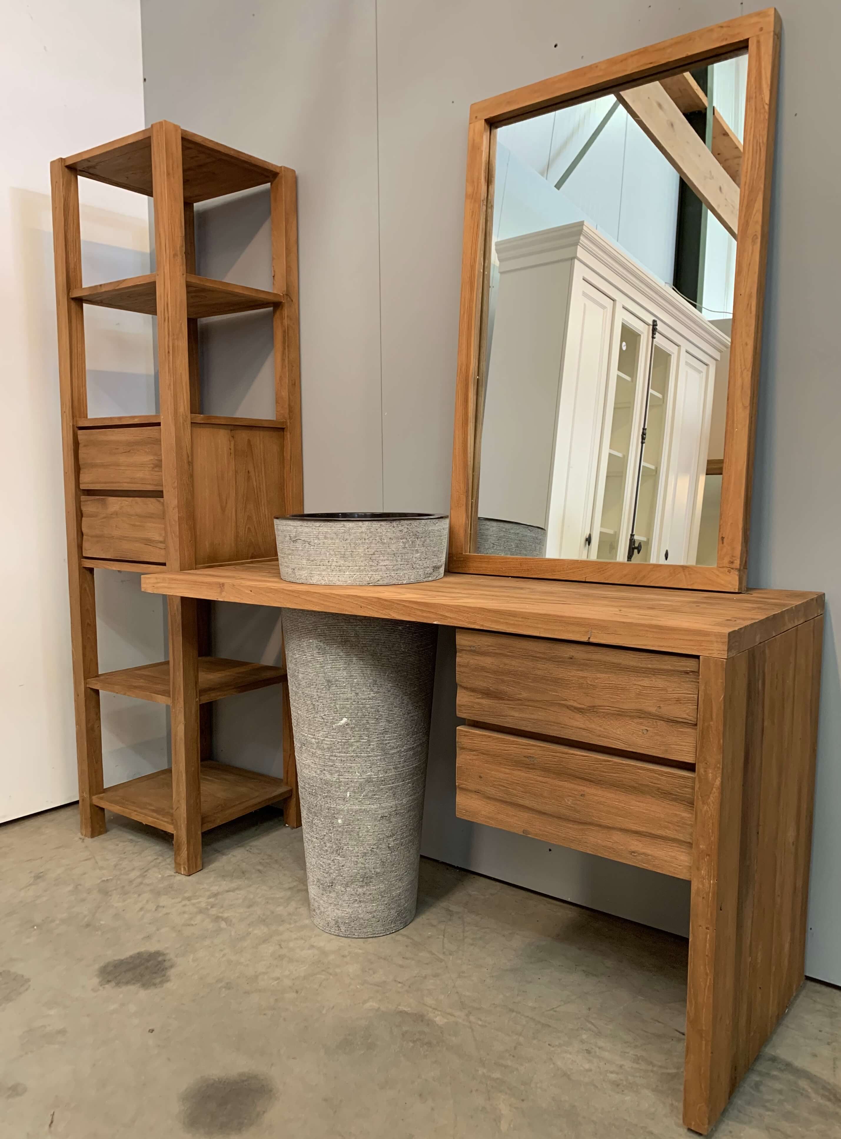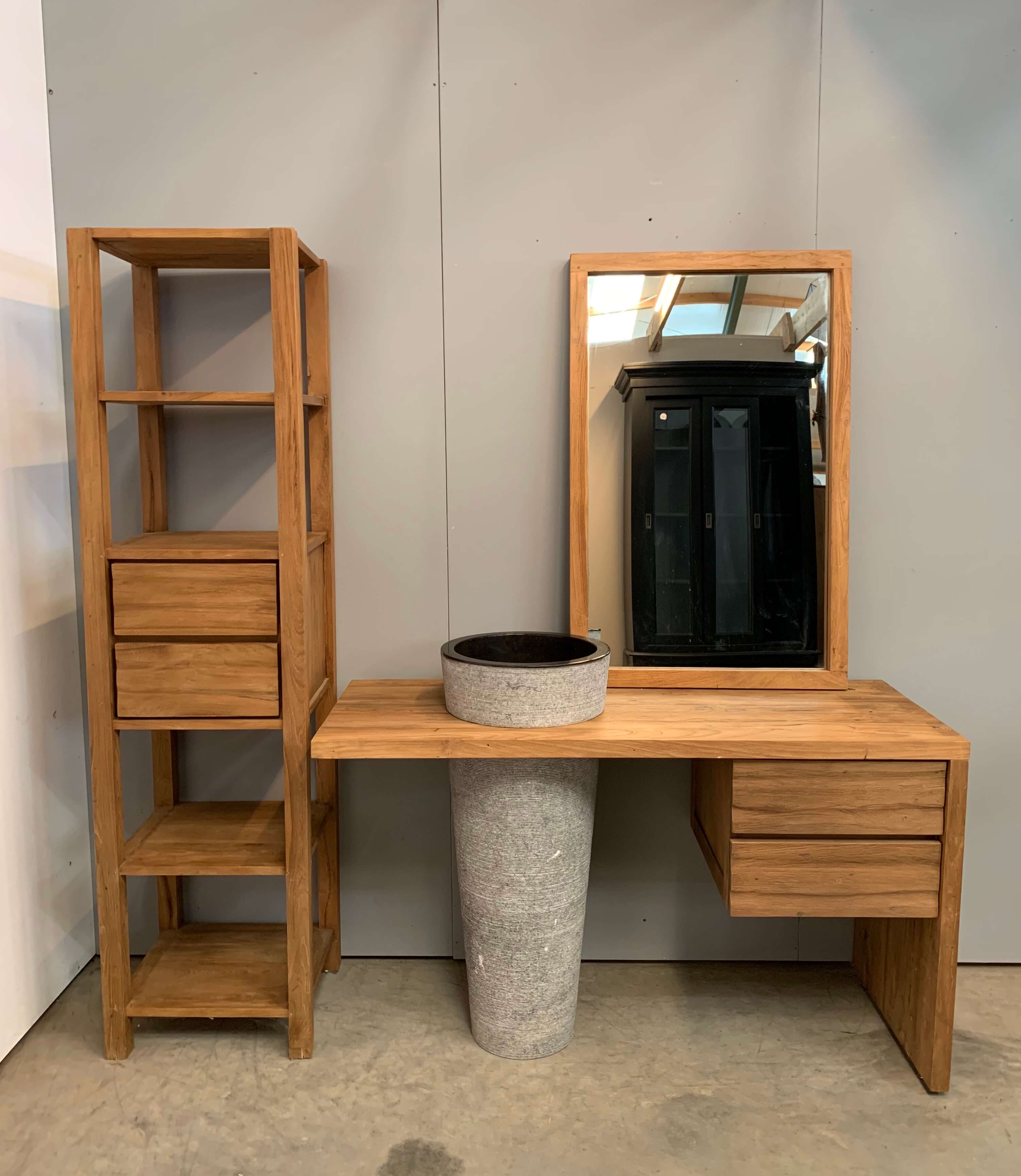 Complete set voor de badkamer. Deze set is gemaakt van massief hergebruikt teakhout. Het hout is licht geborsteld en dat geeft deze set een robuuste uitstraling. De laden gaan open op metalen rails.