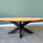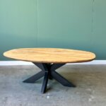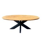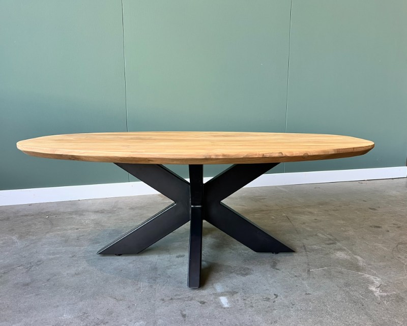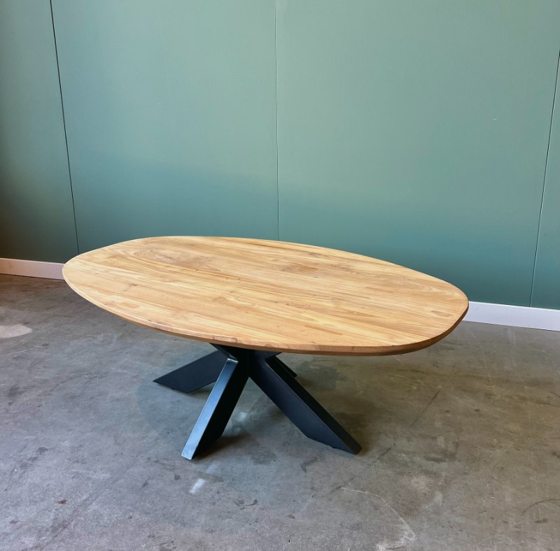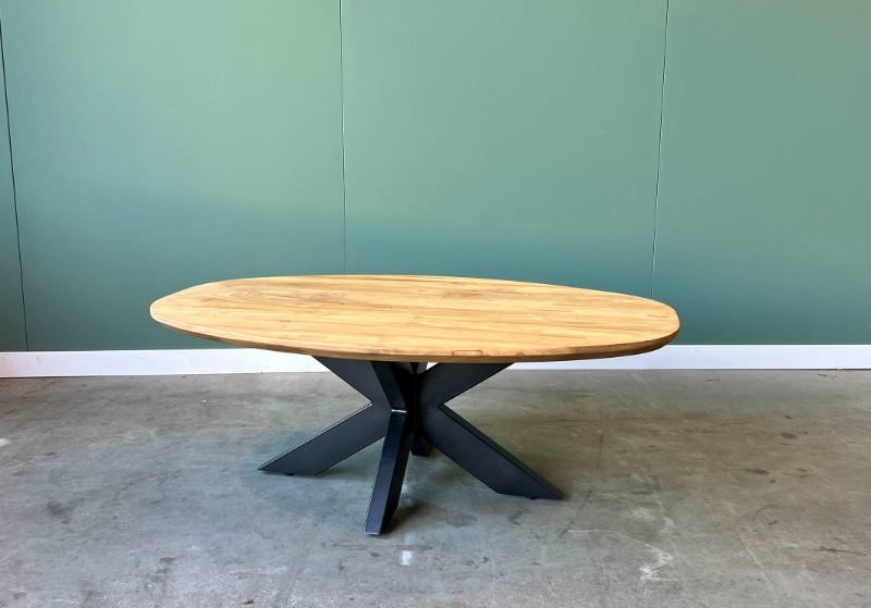 Deens ovale salontafel met stalen onderstel. Voor het blad is de beste kwaliteit gerecycled teakhout gebruikt. Leverbaar in 2 maten!