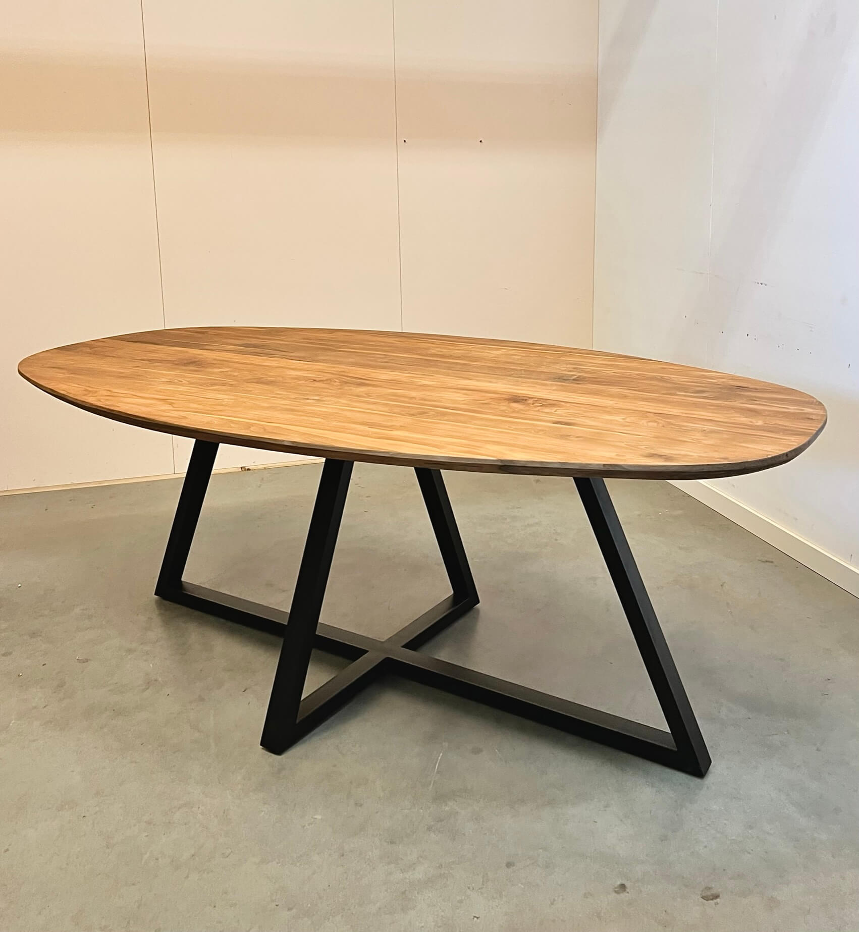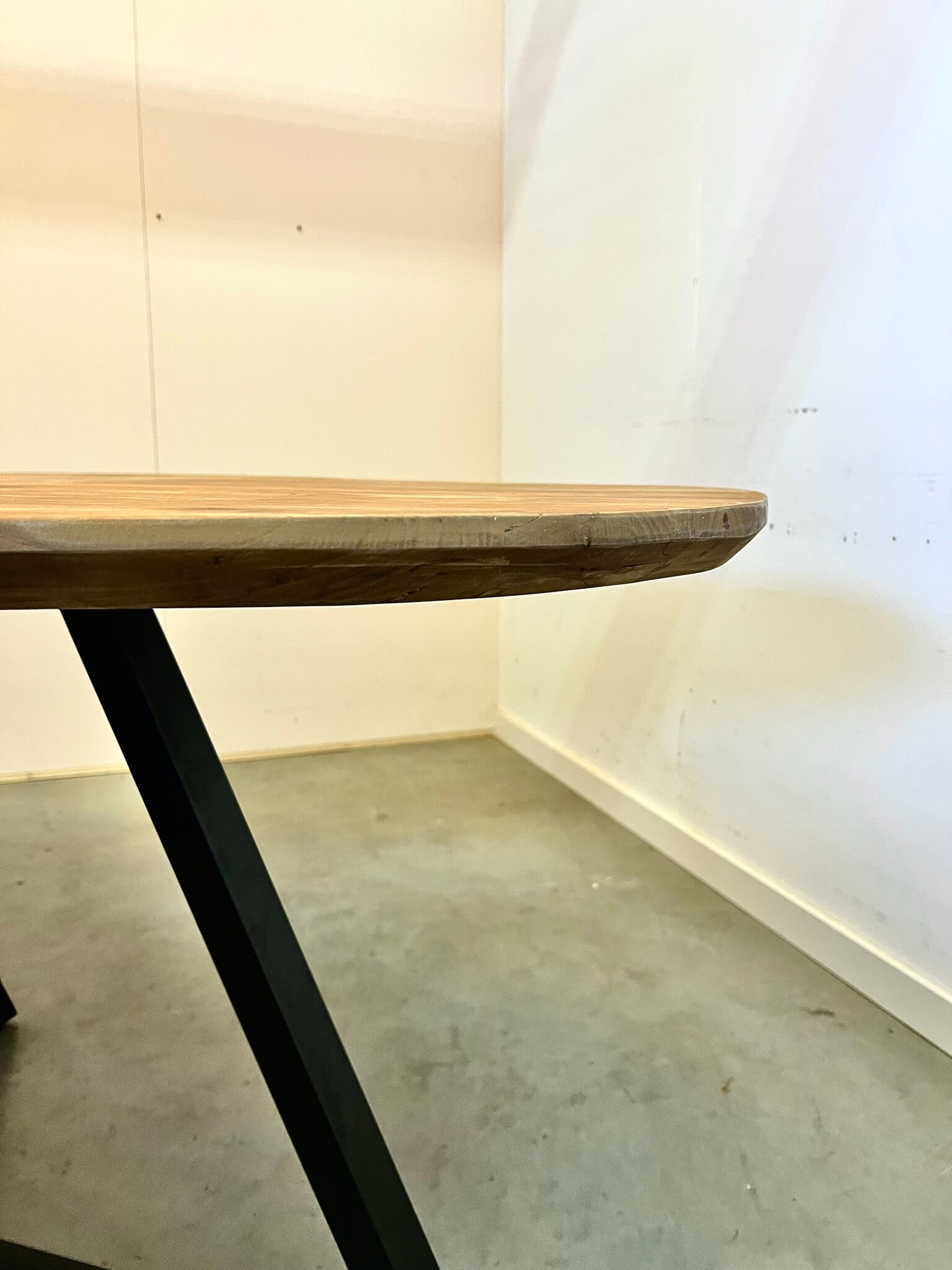 Prachtige tafel van gerecycled teakhout met een Deens ovaal blad. De rondingen van de tafel zorgen voor een sierlijk geheel, maar er is nog voldoende ruimte om een extra stoel aan te schuiven op de kopse kant. De poot is gemaakt van metaal.