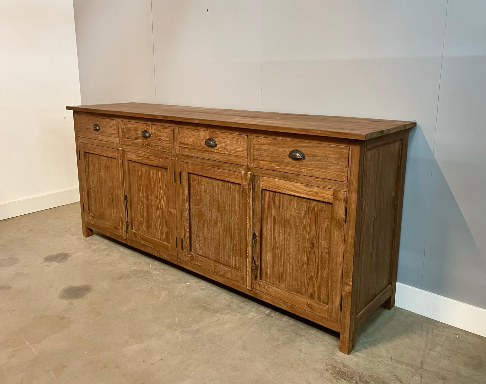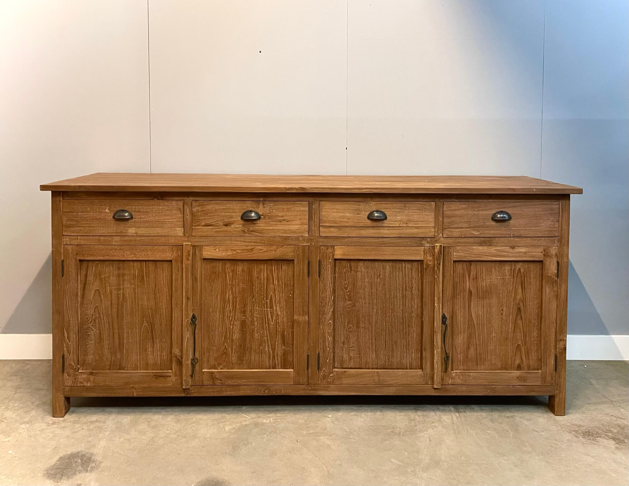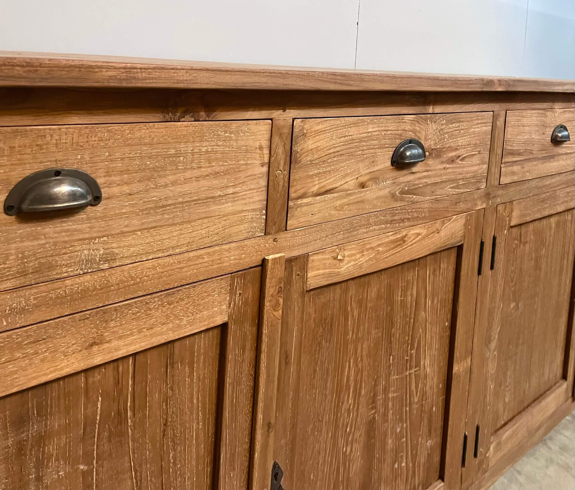 Landelijk dressoir gemaakt van gerecycled teakhout. De laden en deuren gaan soepel open op metalen geleiders. Het hout is wat ruiger gelaten en behandeld met een waslaag voor een intensere kleur, hierdoor heeft dit dressoir een robuuste uitstraling. Deze afwerking wordt dingklik genoemd. Het teakhout wat gebruikt is voor dit dressoir is gerecycled. Dit houd in dat het hout afkomstig is uit oude slooppanden.