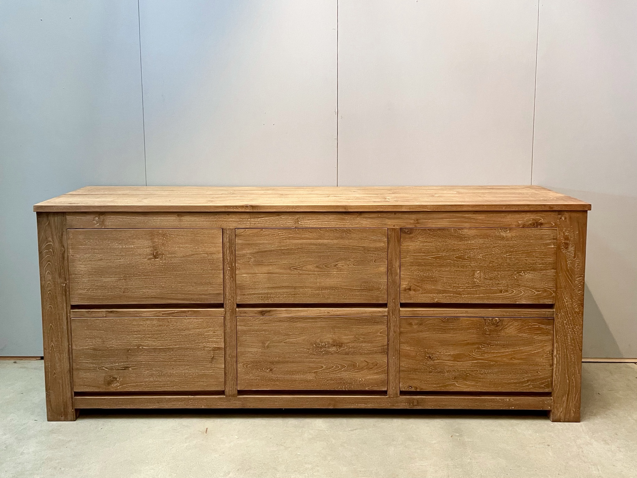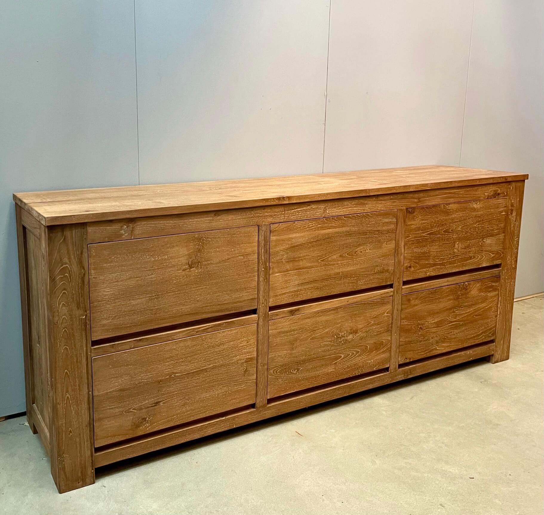 Een prachtig dressoir van massief teakhout afgewerkt in dingklik. Het meubel is van uitstekende kwaliteit en de greeploze laden gaan open op geleiders. De laden zijn erg diep, waardoor u er veel spullen in kunt opbergen!