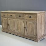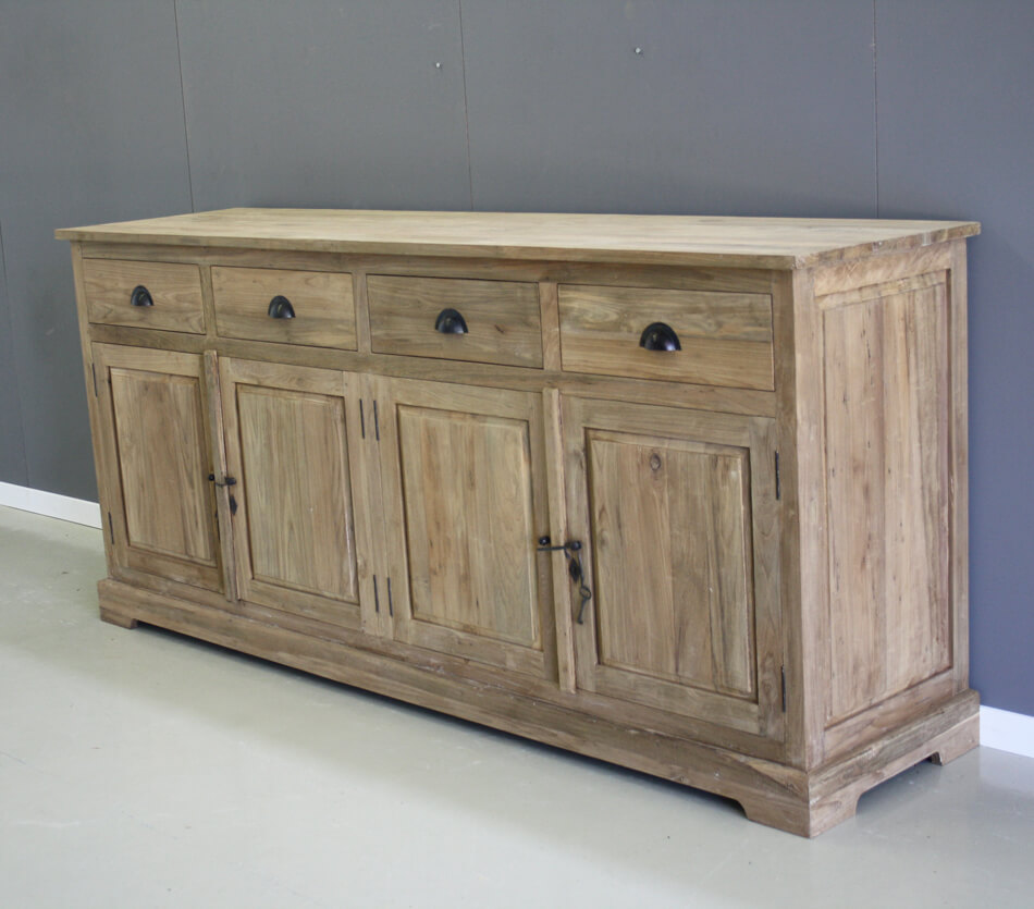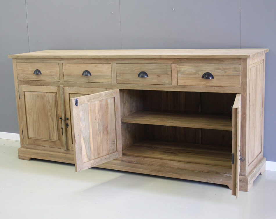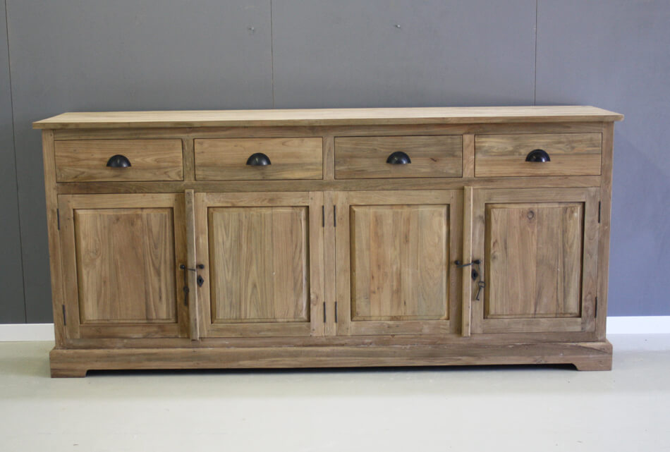 Dressoir 2 meter breed van zware kwaliteit recycle teakhout. Vier deuren en vier laden.