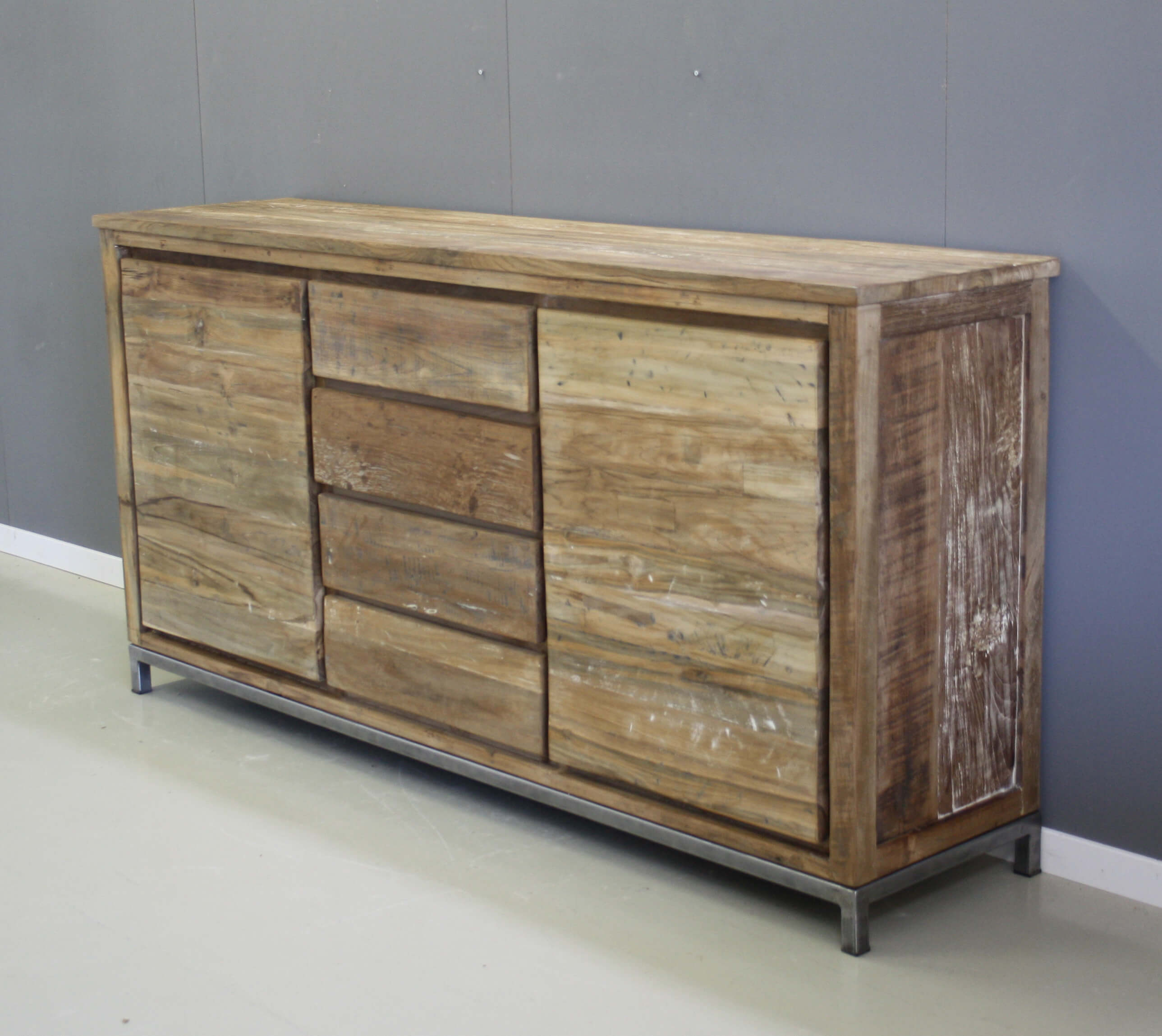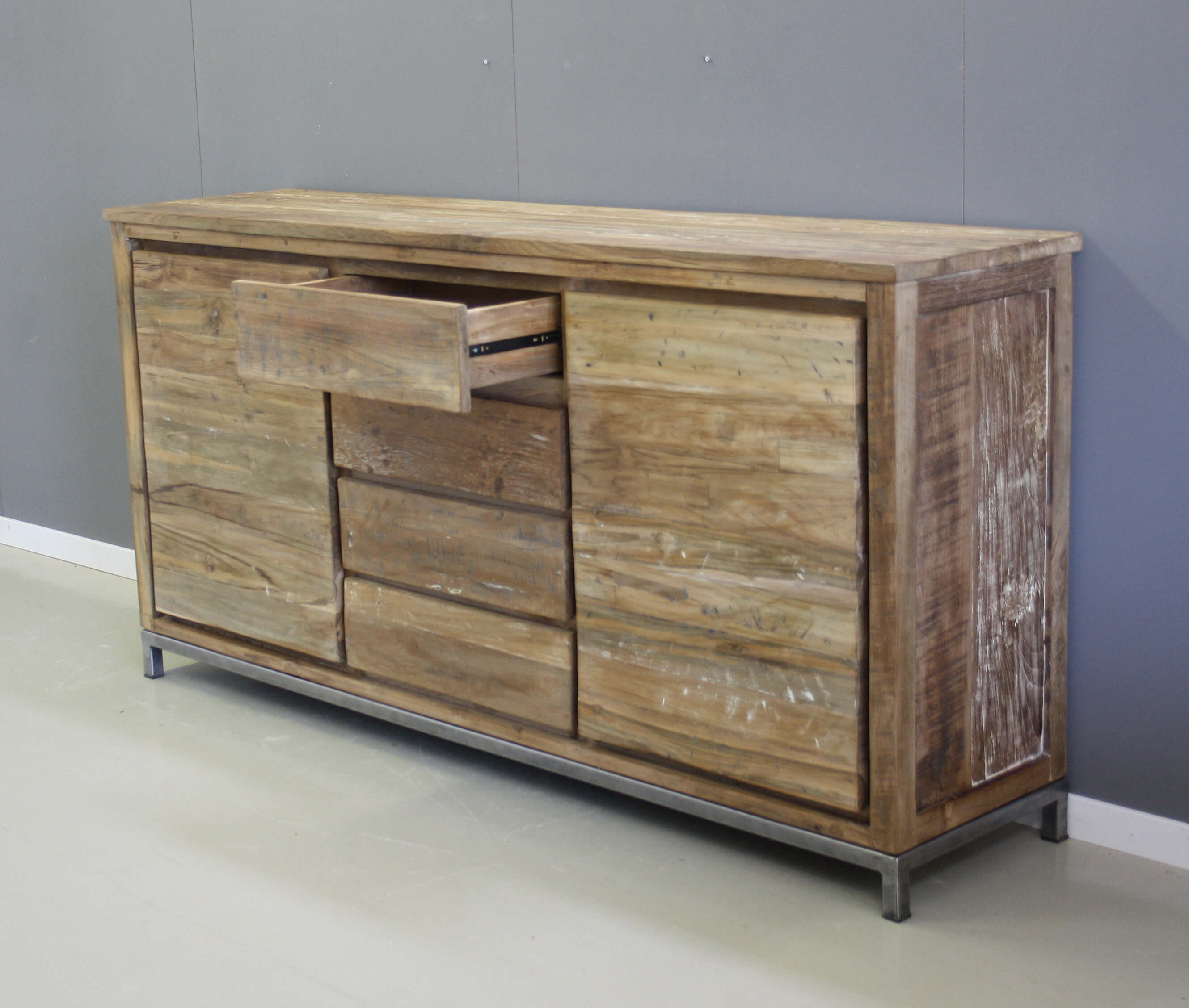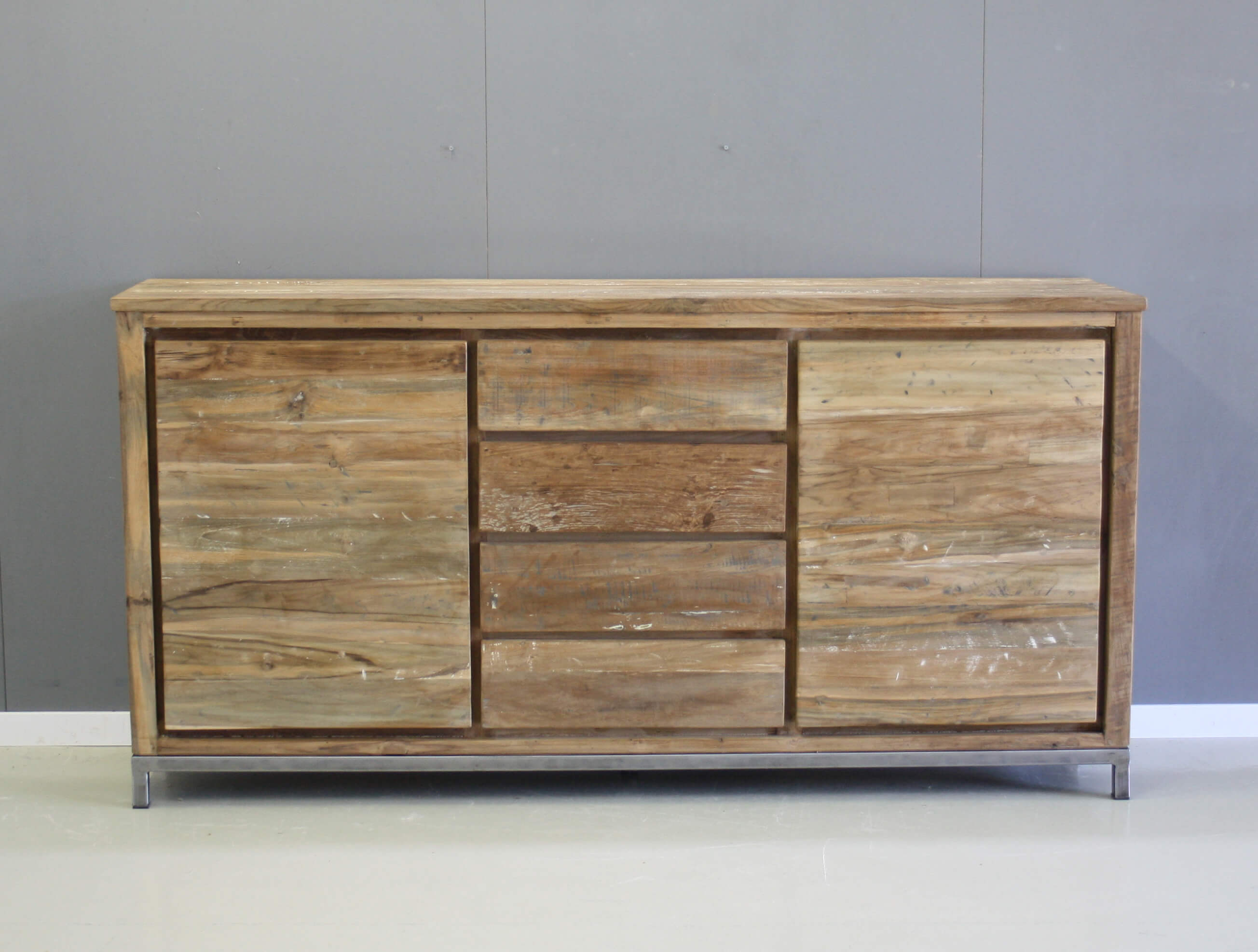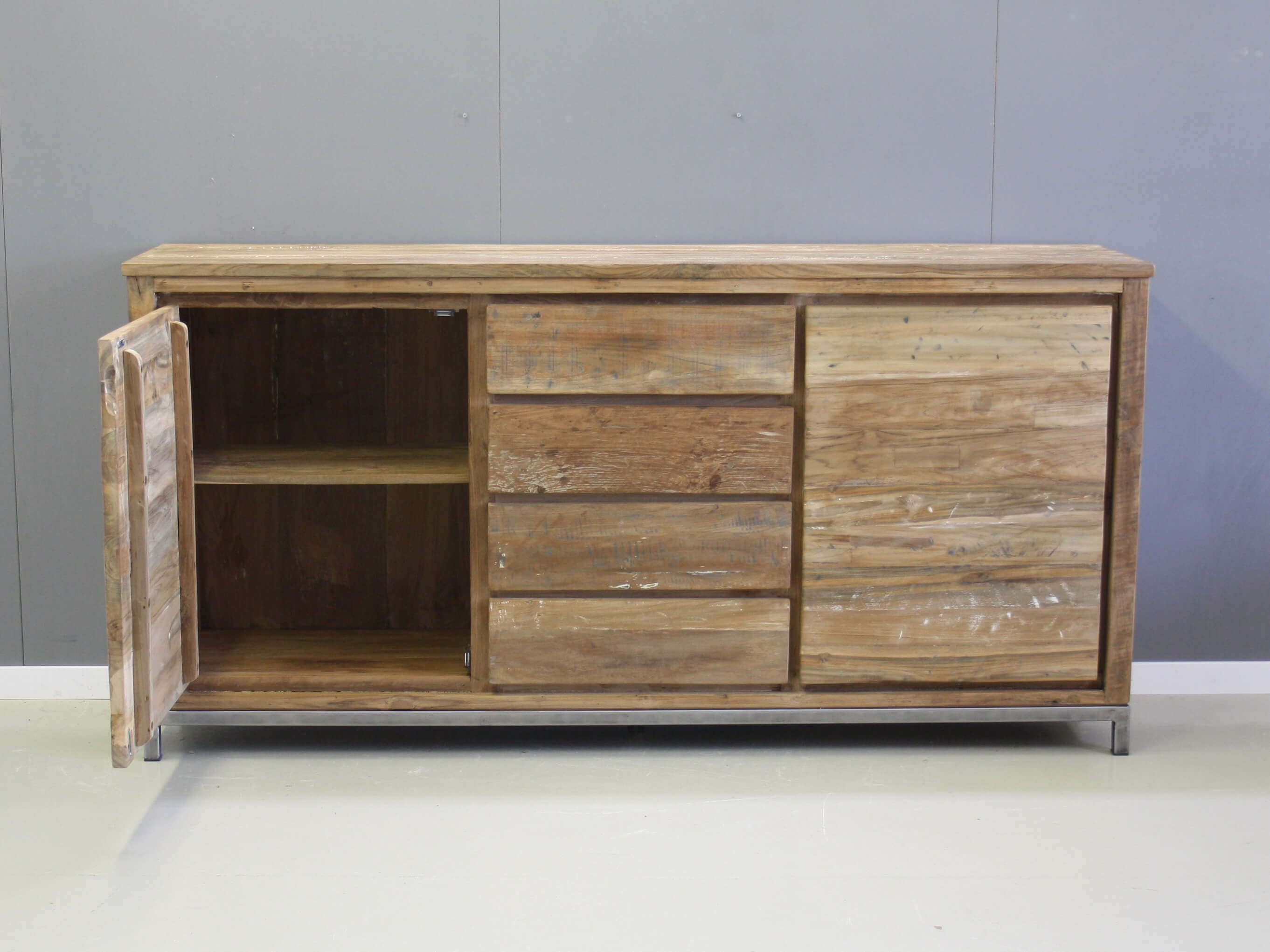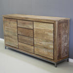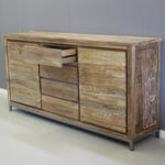 Stoer meubel met eigentijdse uitstraling. Dressoir op stalen frame, twee deuren en vier laden. Bewerkt teakhout.