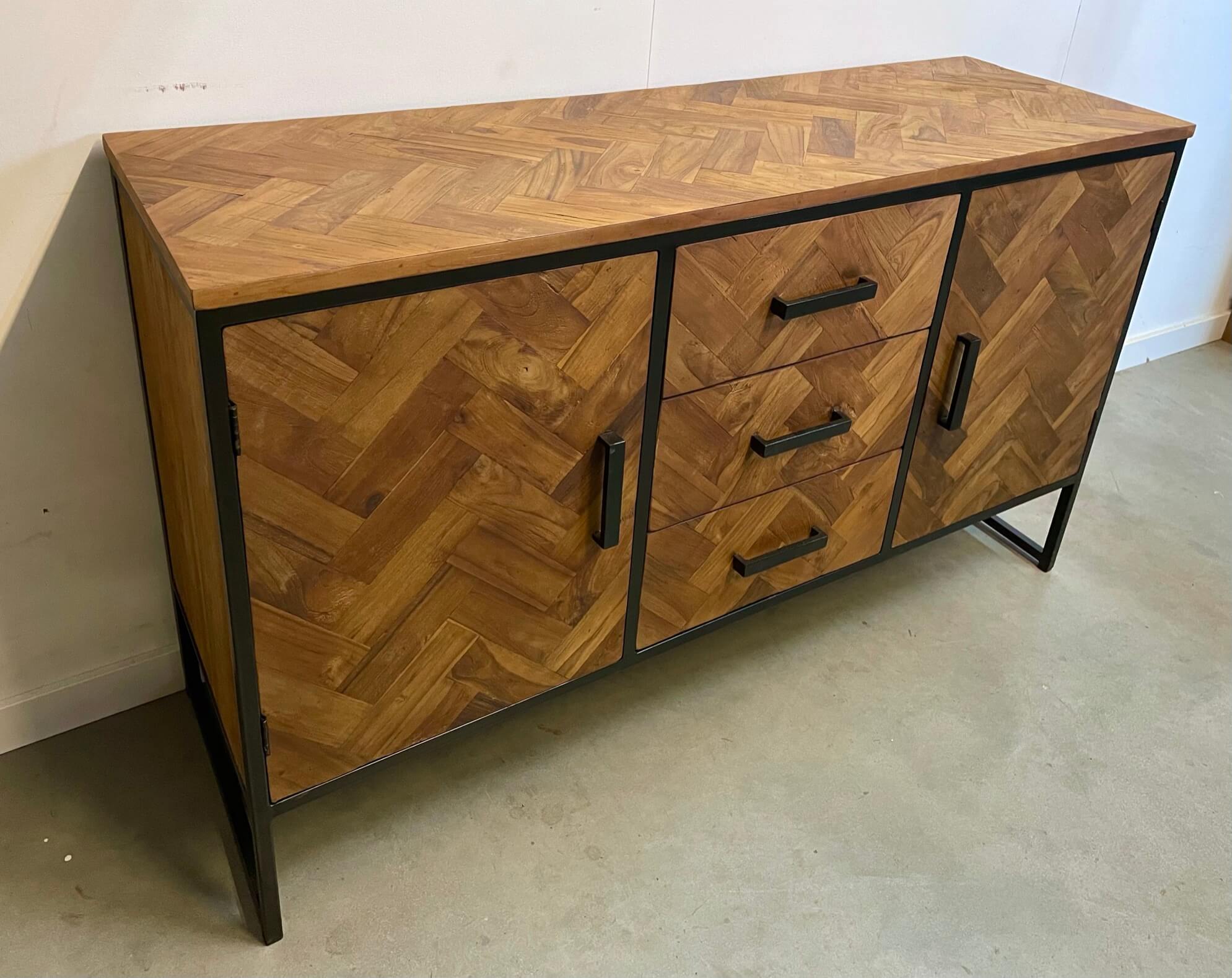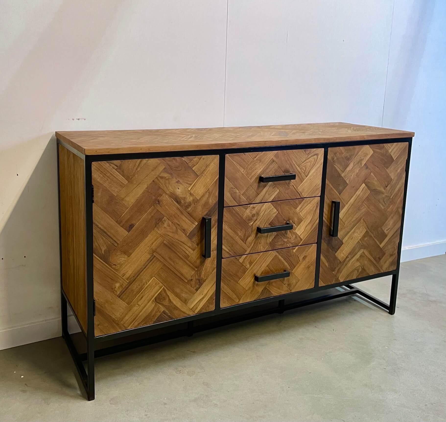 Elegant dressoir van teakhout en staal. Het teakhout heeft een visgraat afwerking. Deze elementen zorgen ervoor dat dit dressoir helemaal in de trend van nu is.