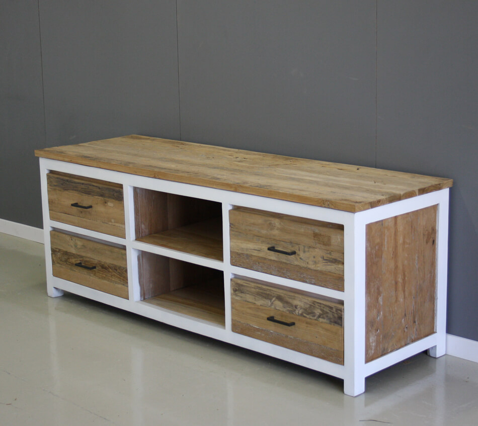 TV meubel uit onze DUO lijn. Het teakhouten frame is wit gekleurd, de frontjes en panelen zijn afgewerkt met robuust teakhout. Het meubel heeft een fijne hoogte van 60cm. Vier ruime laden en twee open vakken.