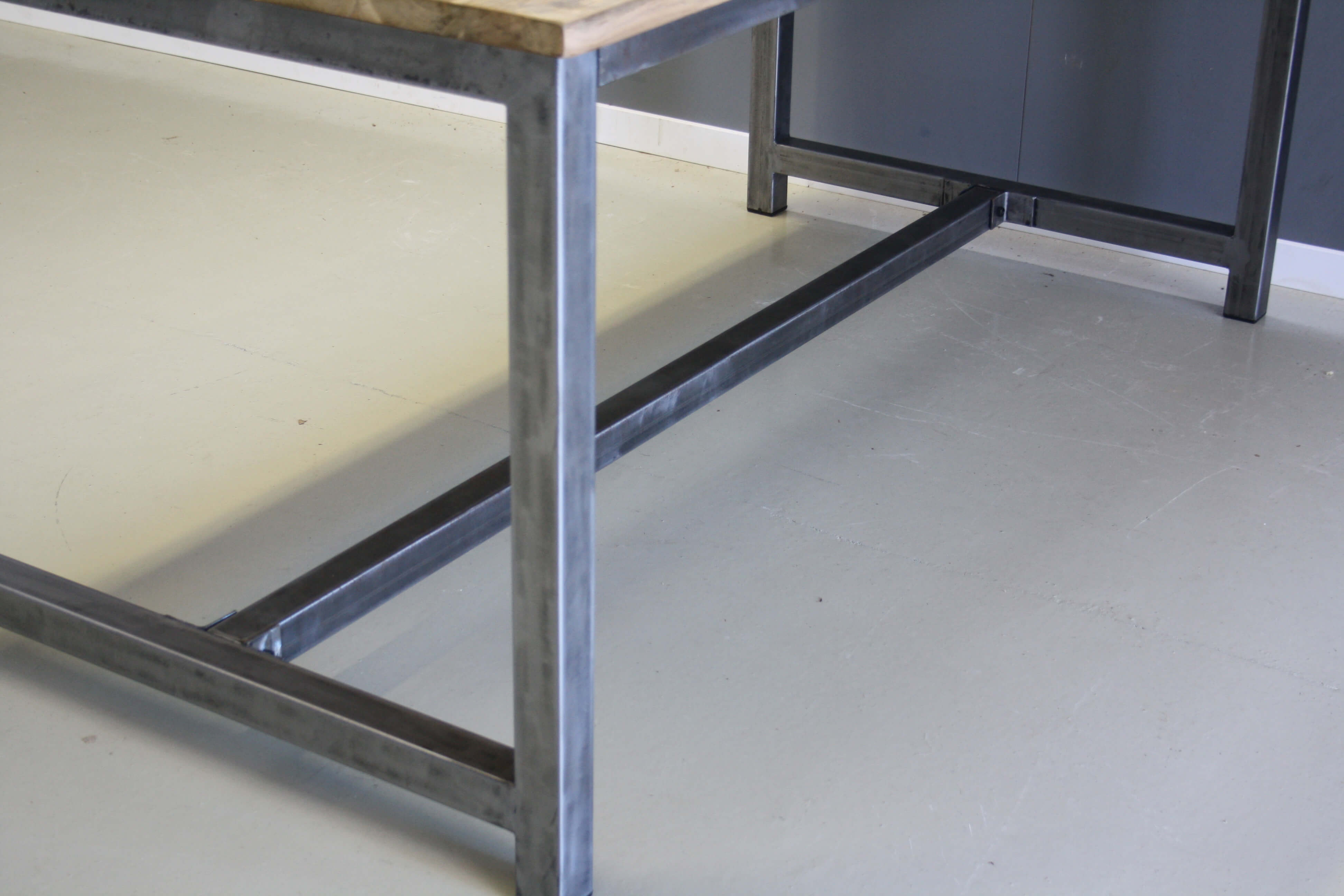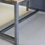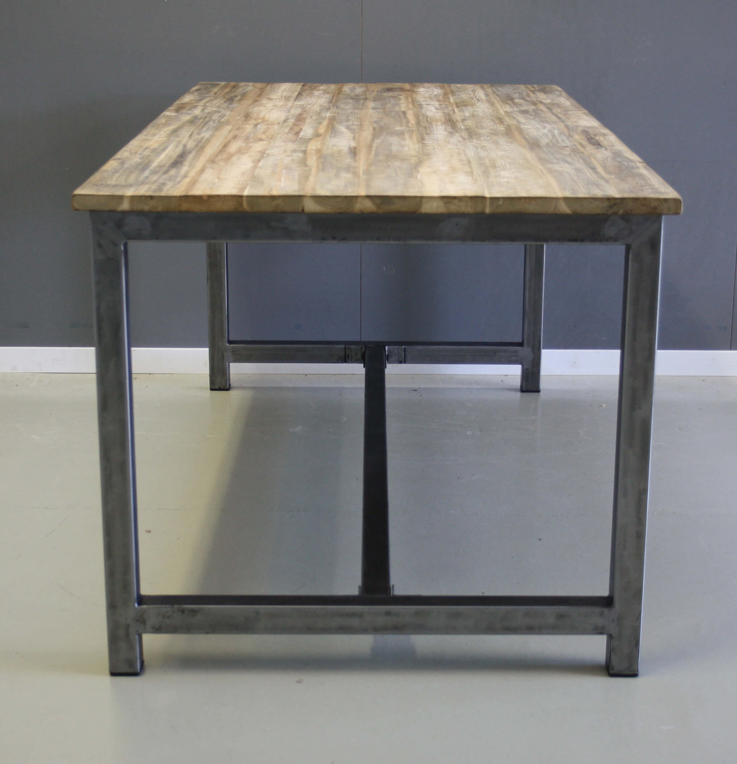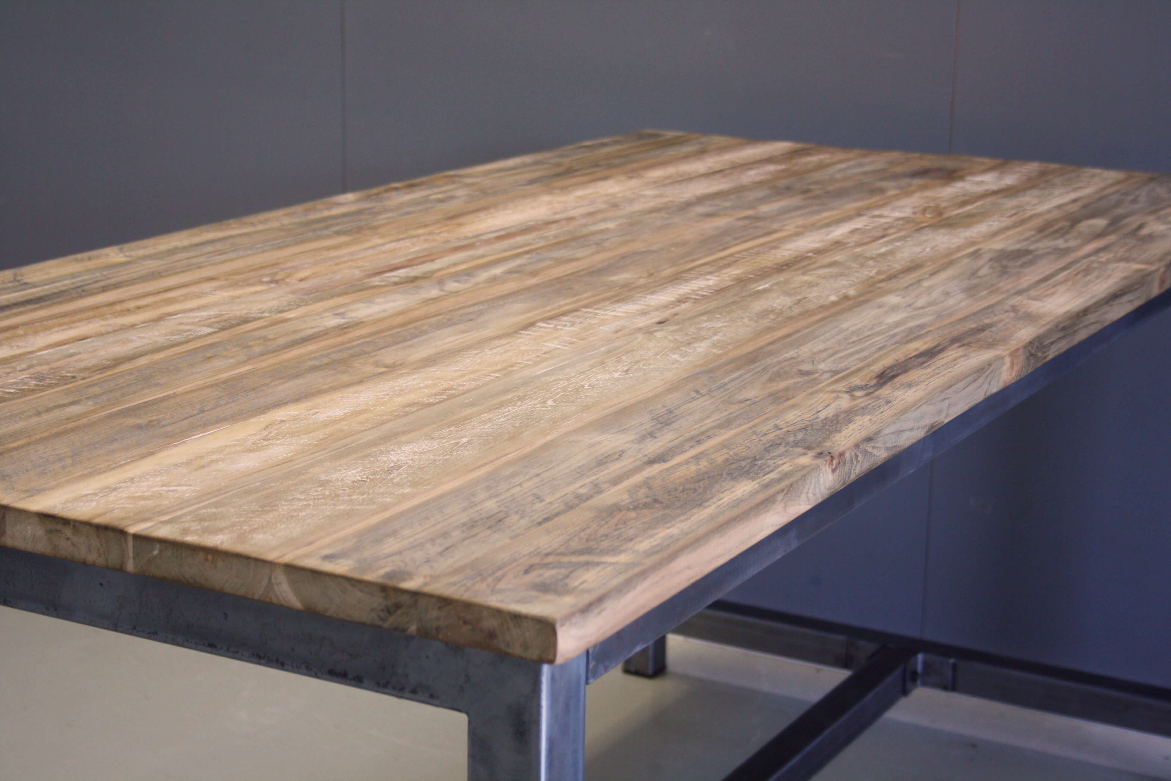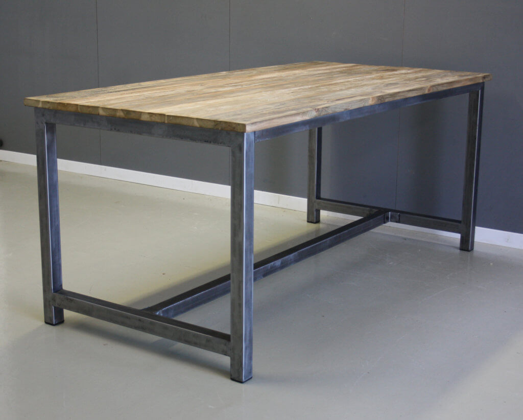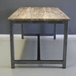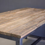 Stoere eettafel met eigentijdse uitstraling. Industriële look. Het teakhout van deze tafel is bewerkt.