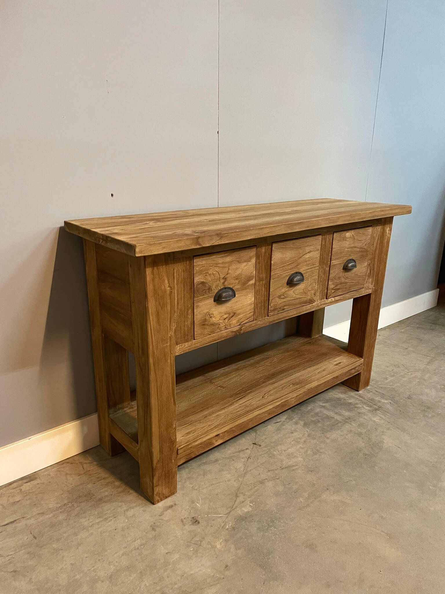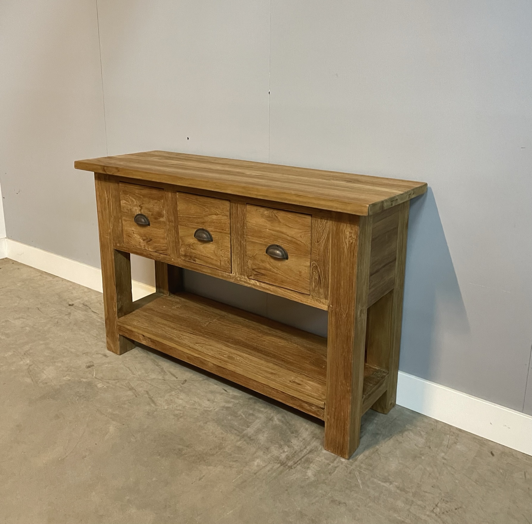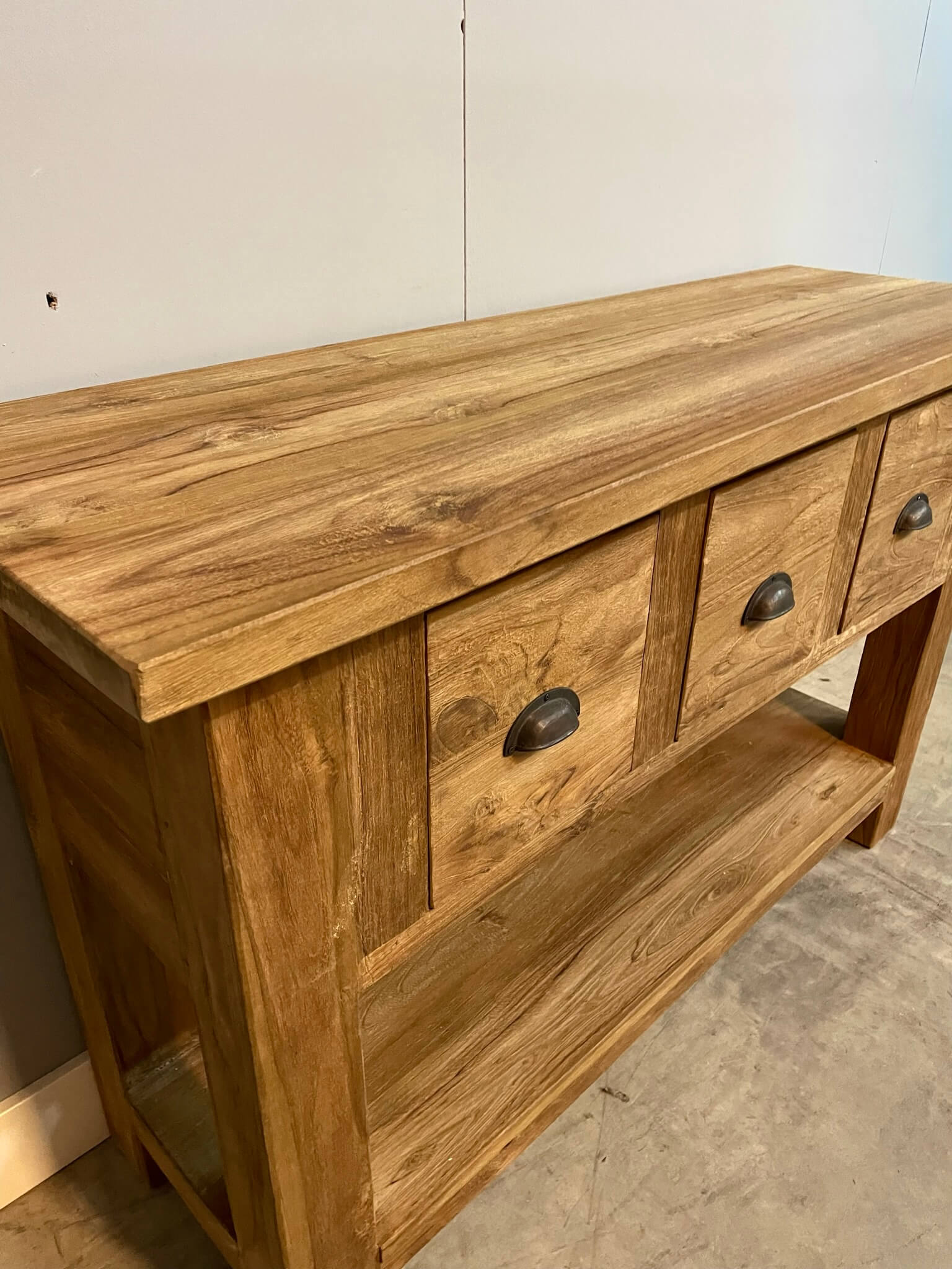 Sidetable gemaakt van geborsteld teakhout. De wandtafel heeft 3 diepe laden en een handige onderplank.