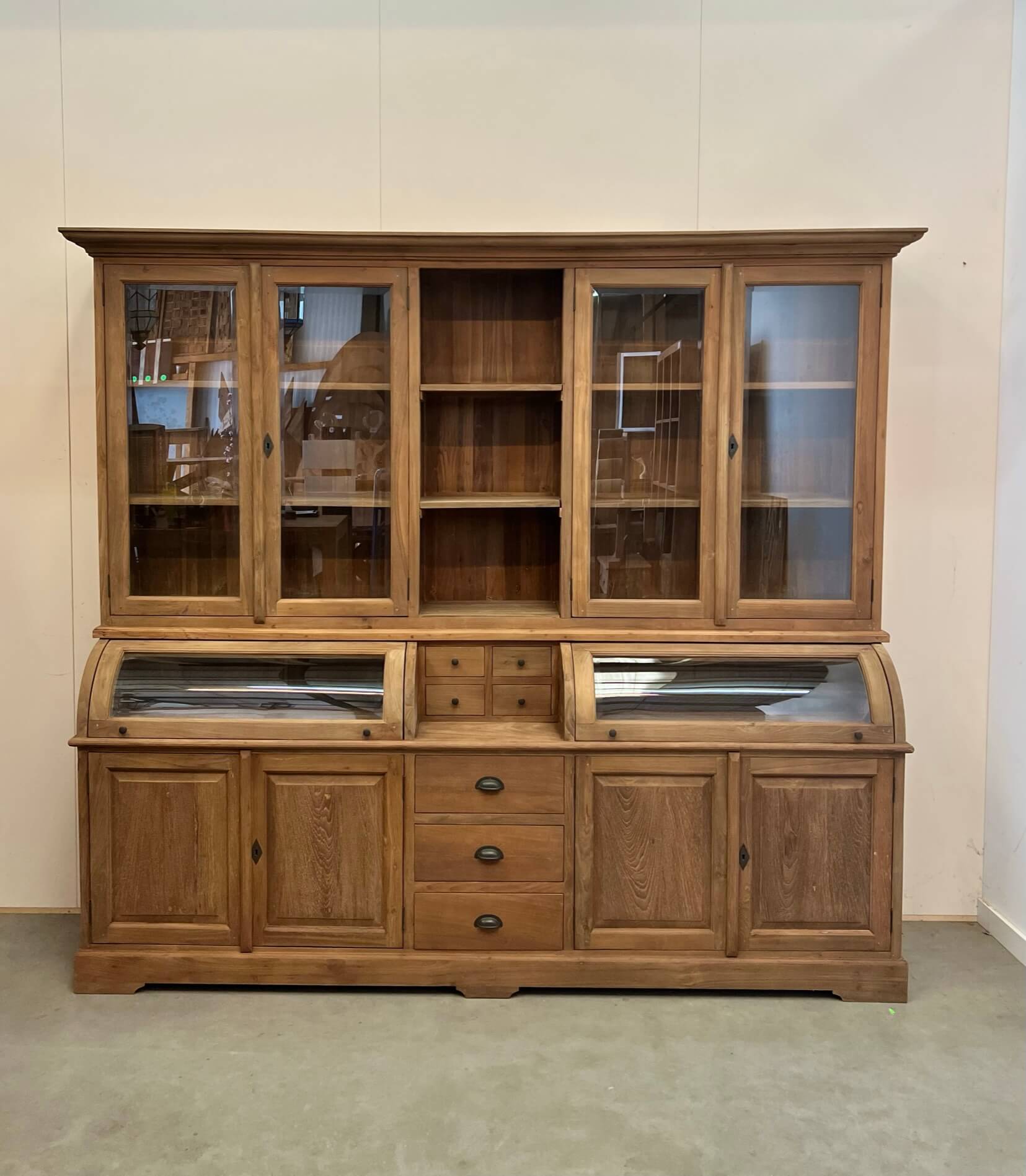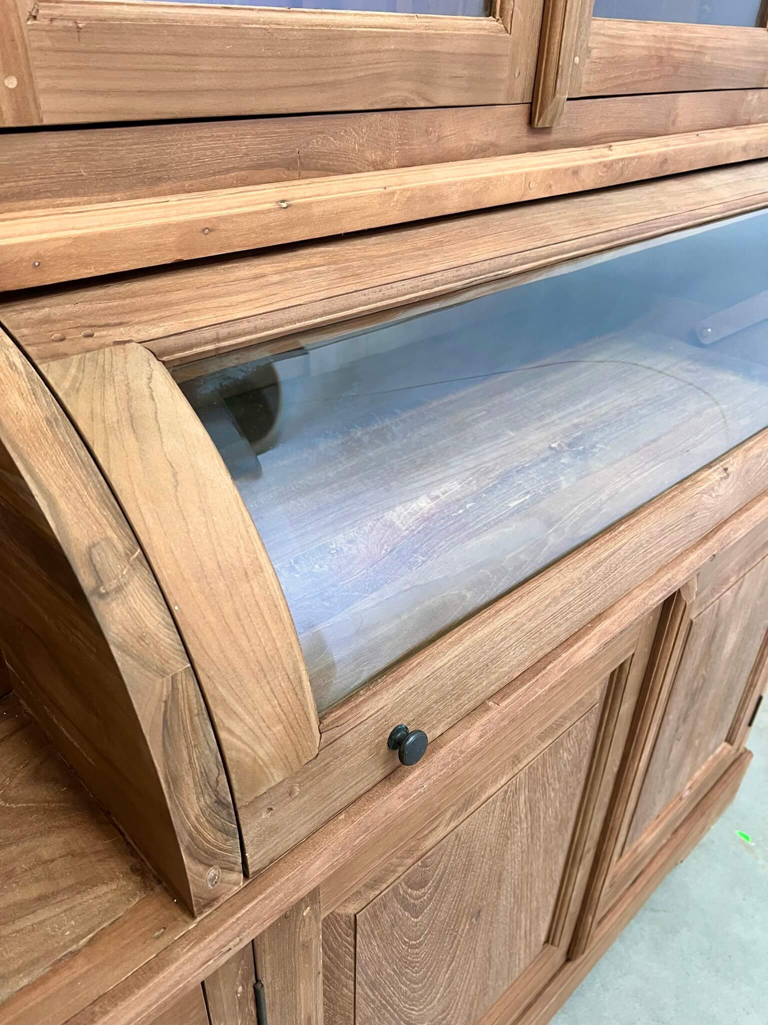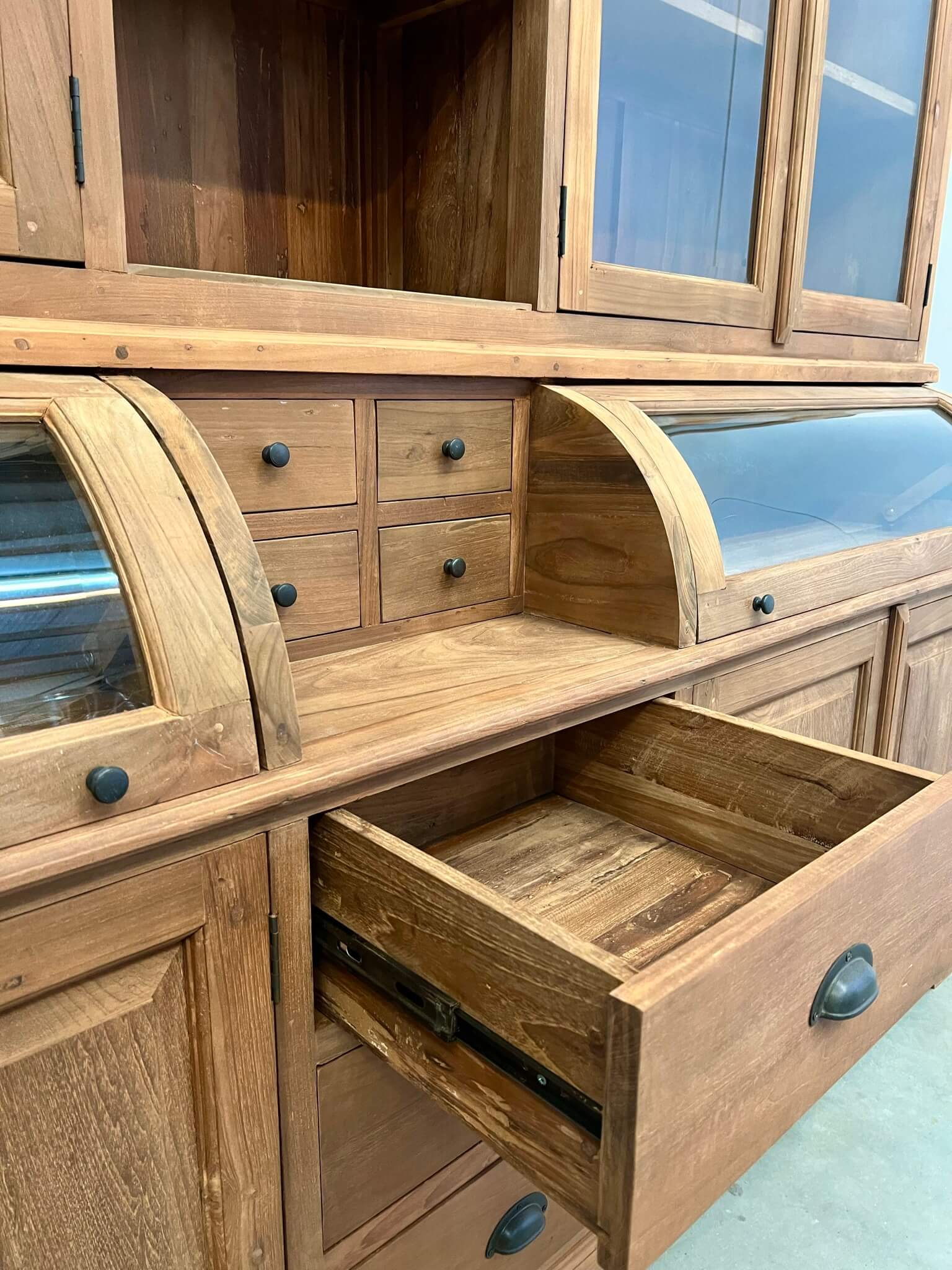 Grote grutterskast gemaakt van hergebruikt teakhout. De ramen en het glas van de gebogen kleppen zijn facet geslepen. De laden gaan soepel open op een metalen geleider.  Kortom een kast waar u jaren van kunt genieten!