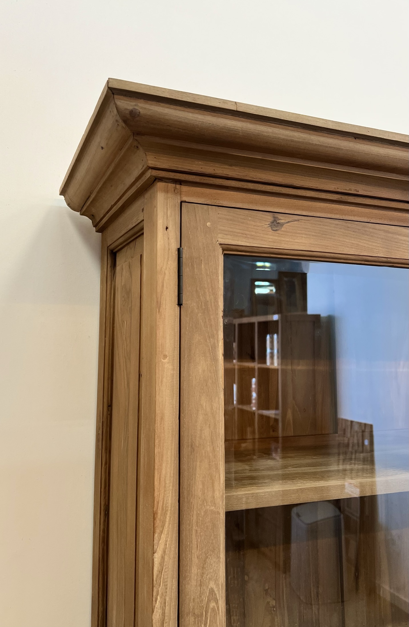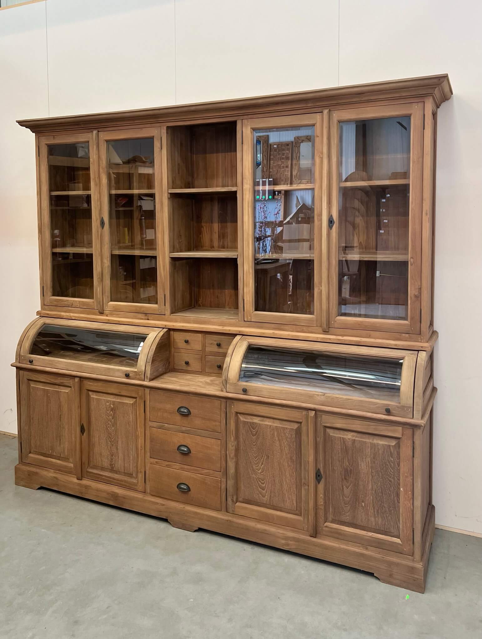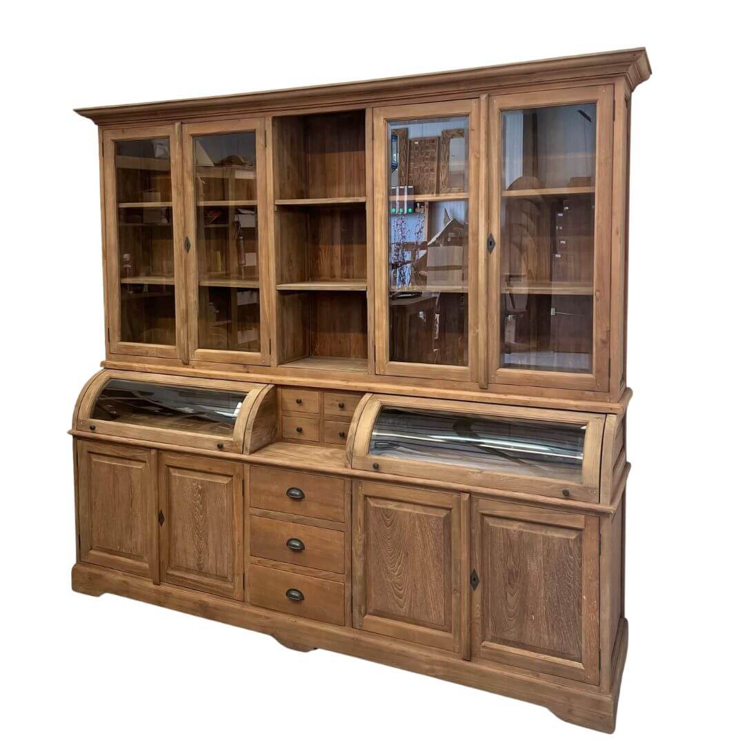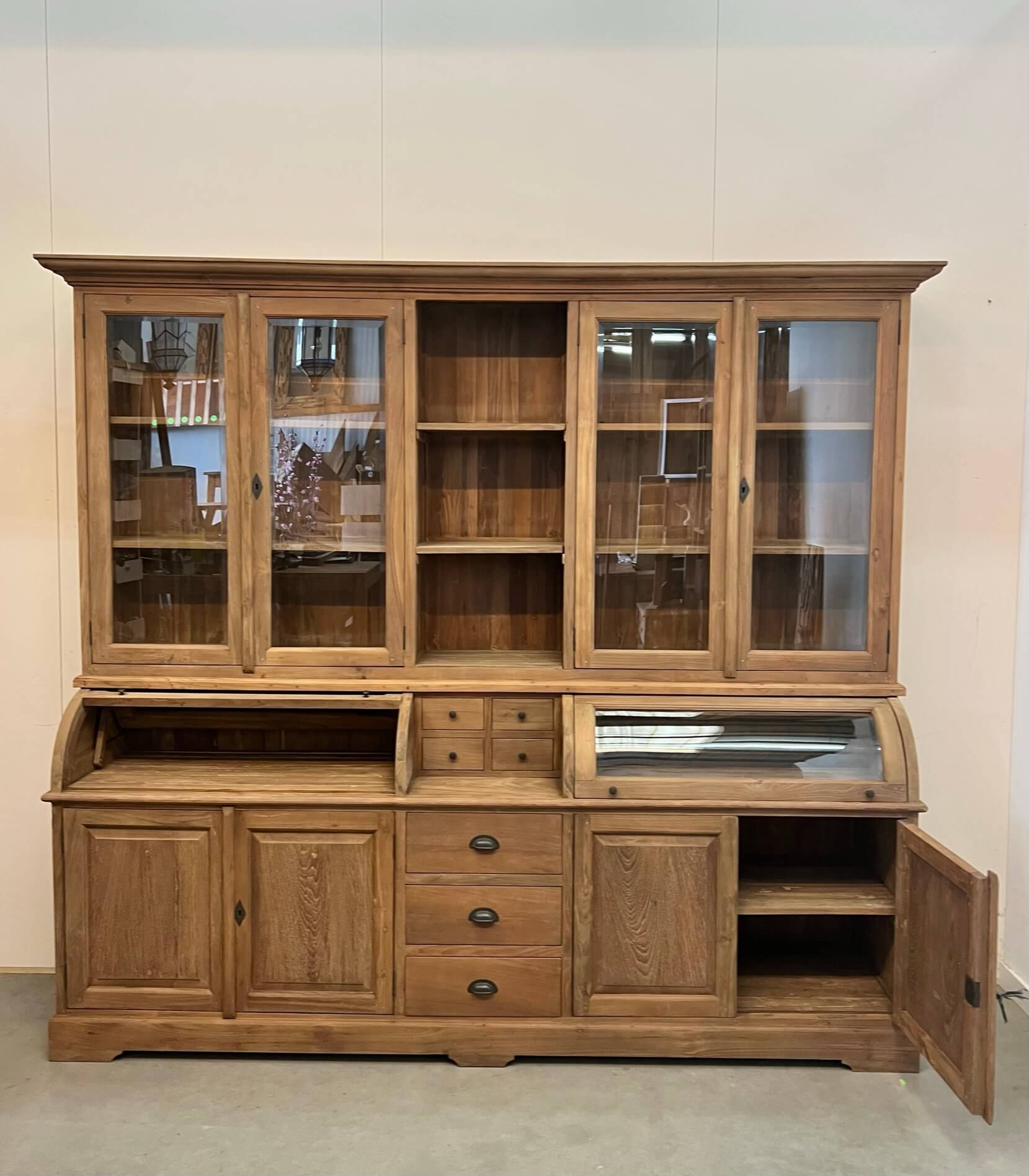 Grote grutterskast gemaakt van hergebruikt teakhout. De ramen en het glas van de gebogen kleppen zijn facet geslepen. De laden gaan soepel open op een metalen geleider.  Kortom een kast waar u jaren van kunt genieten!