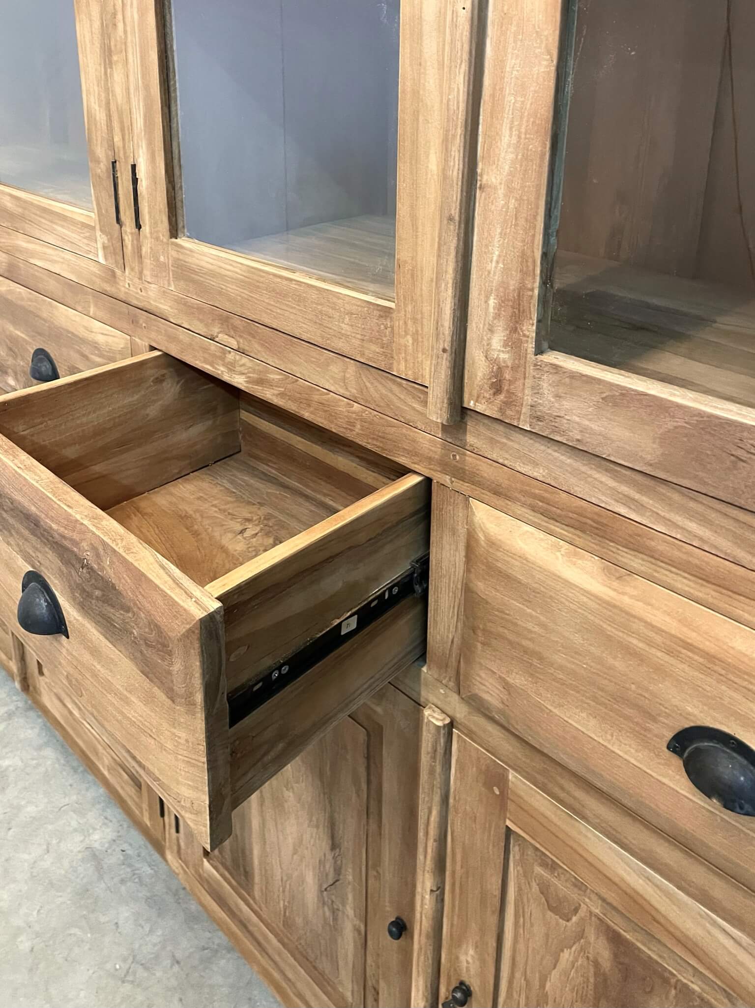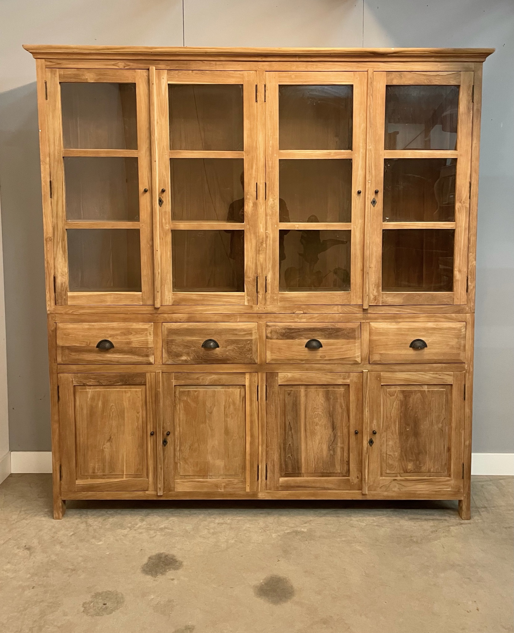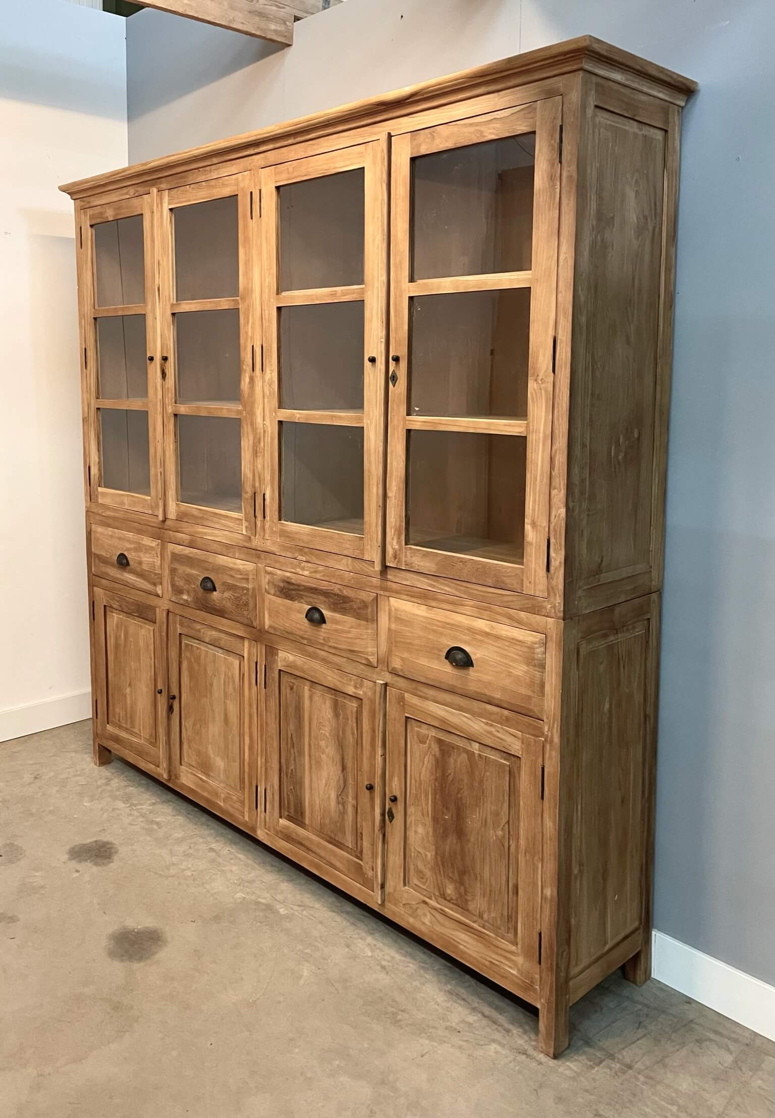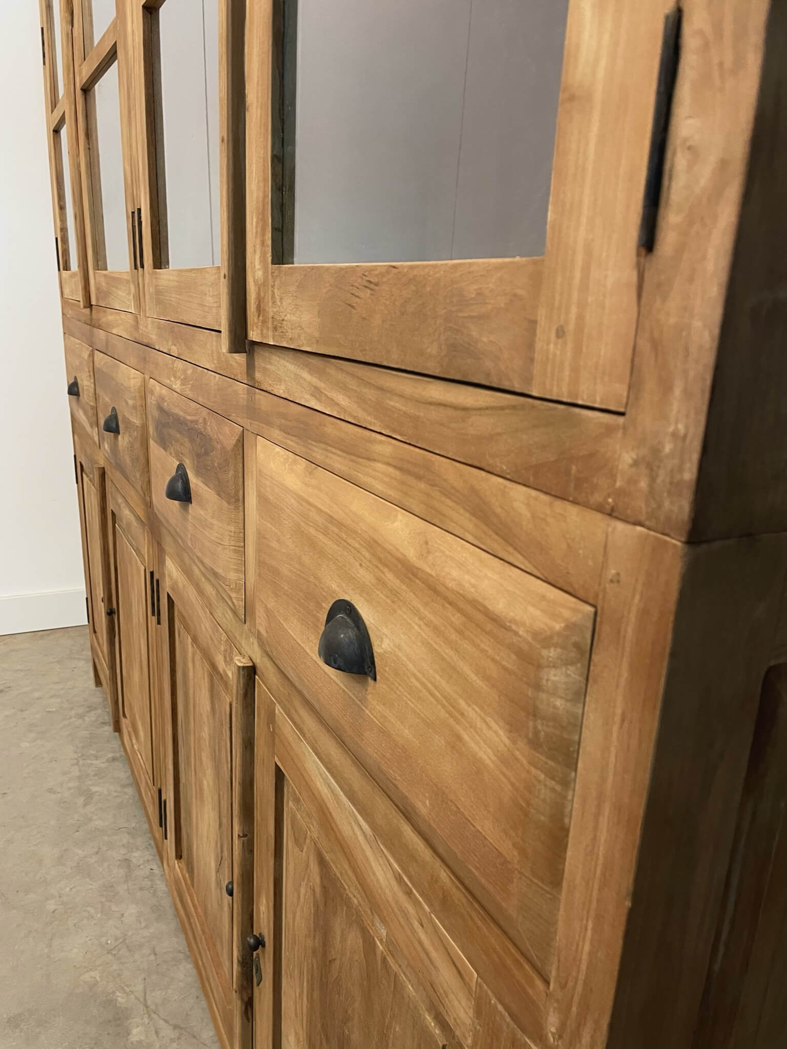 Deze kast is gemaakt van massief gerecycled teakhout. Doordat de kast bovenin ook 45cm diep is, kunnen er grote serviesstukken in worden opgeborgen.