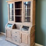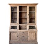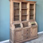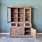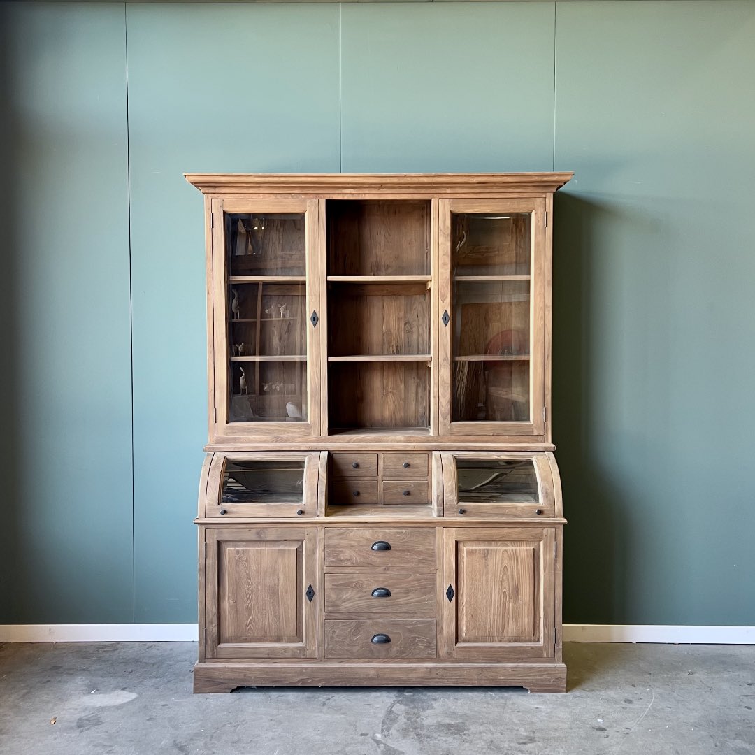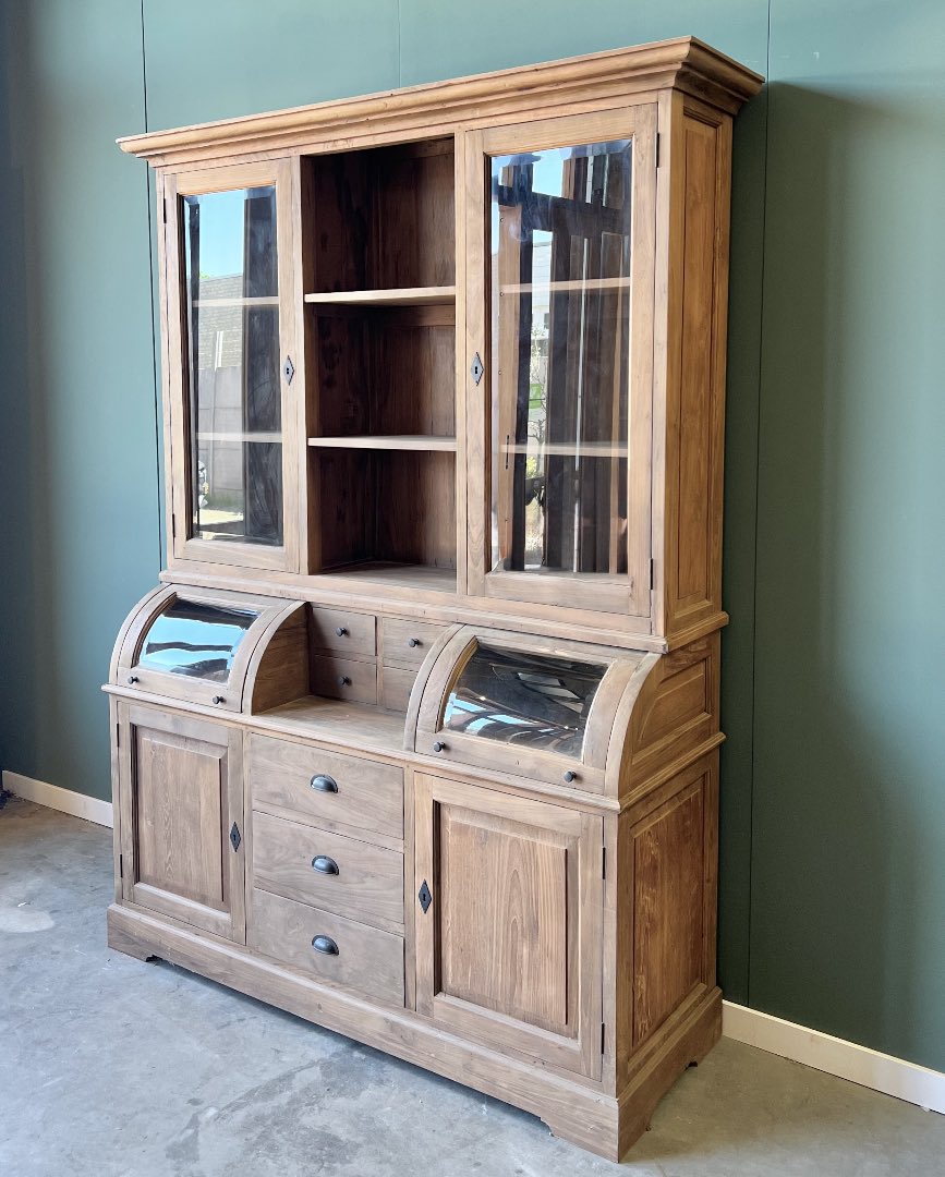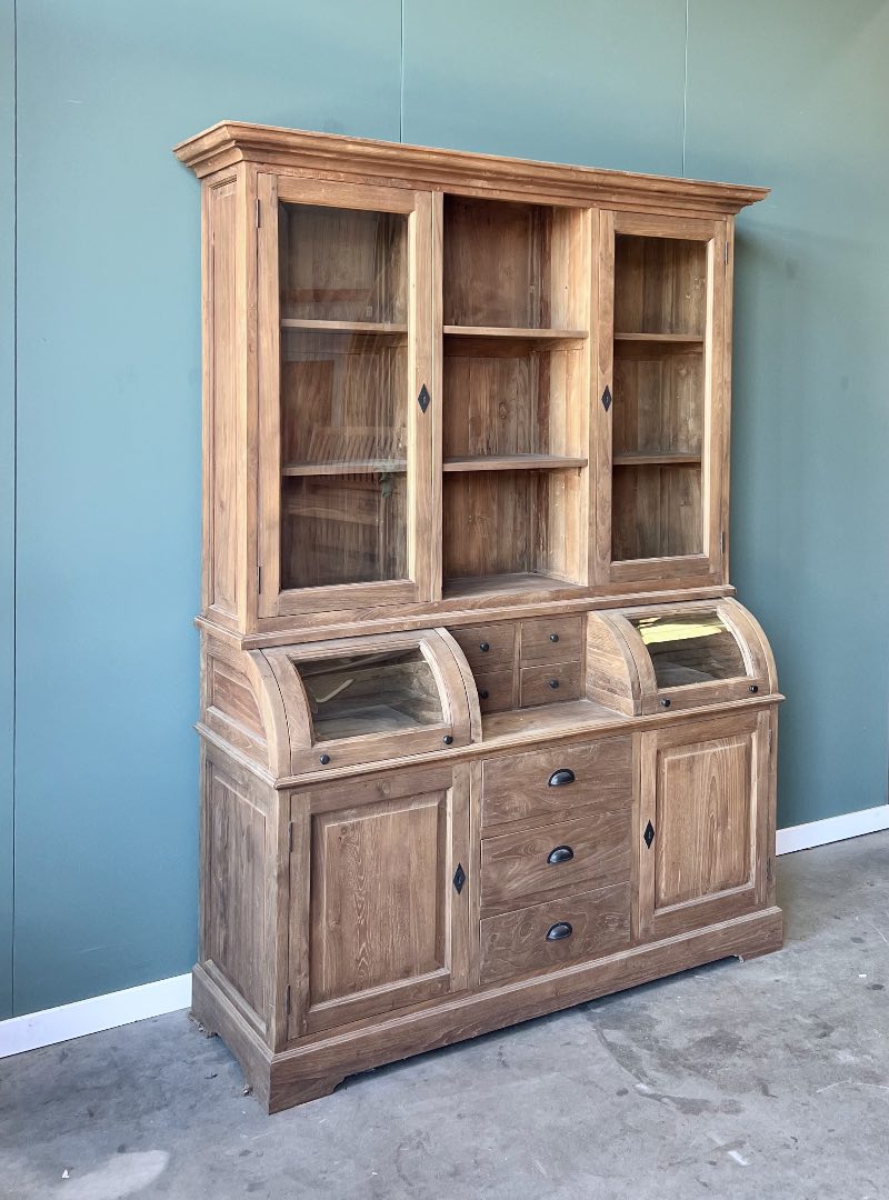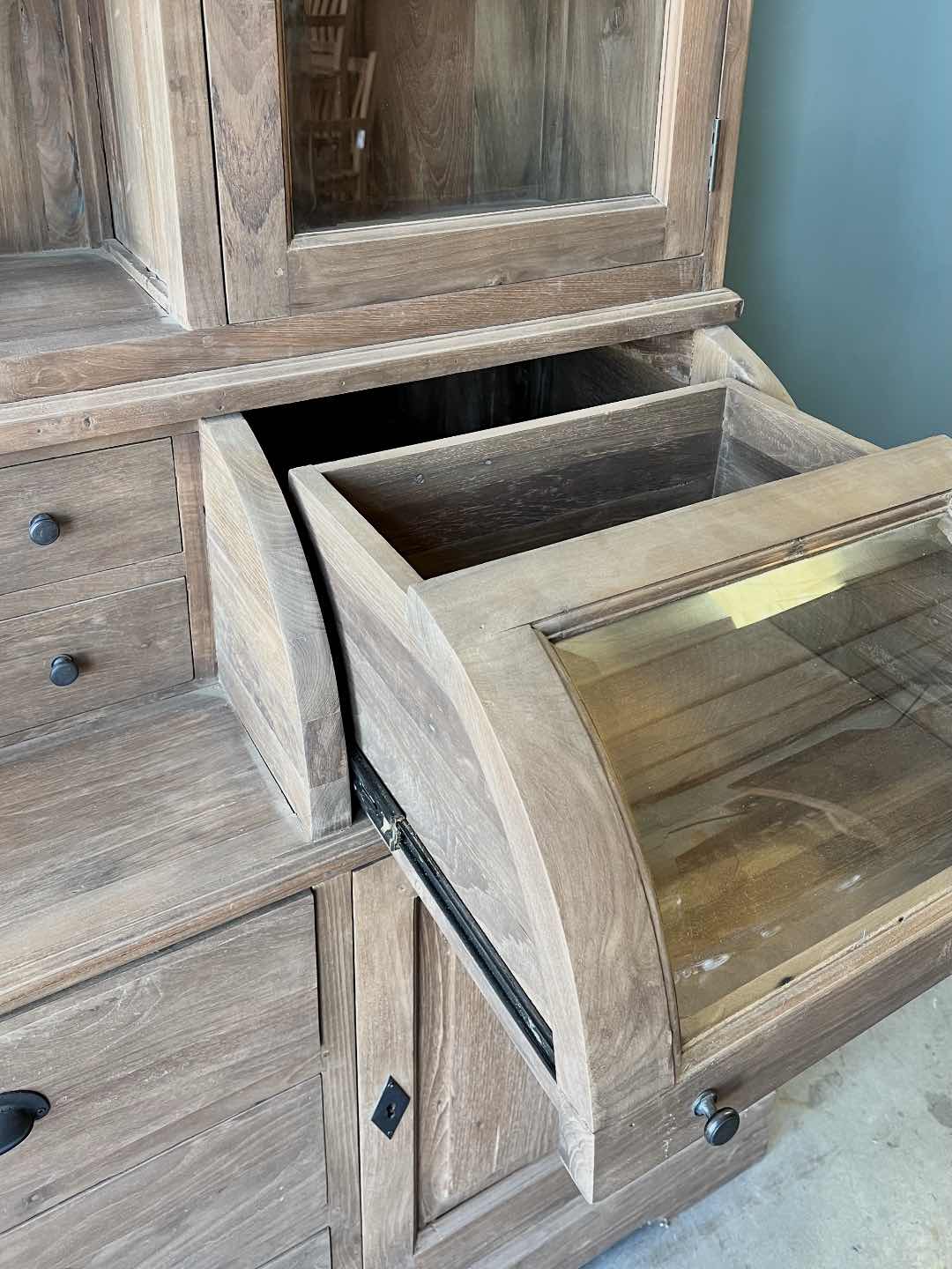 Deze grutterskast is gemaakt van gerecycled teakhout. De laden gaan open op een rails. De kast is uniek in zijn soort omdat het bolle glazen gedeelte van de kast nu een lade is in plaats van een klep.