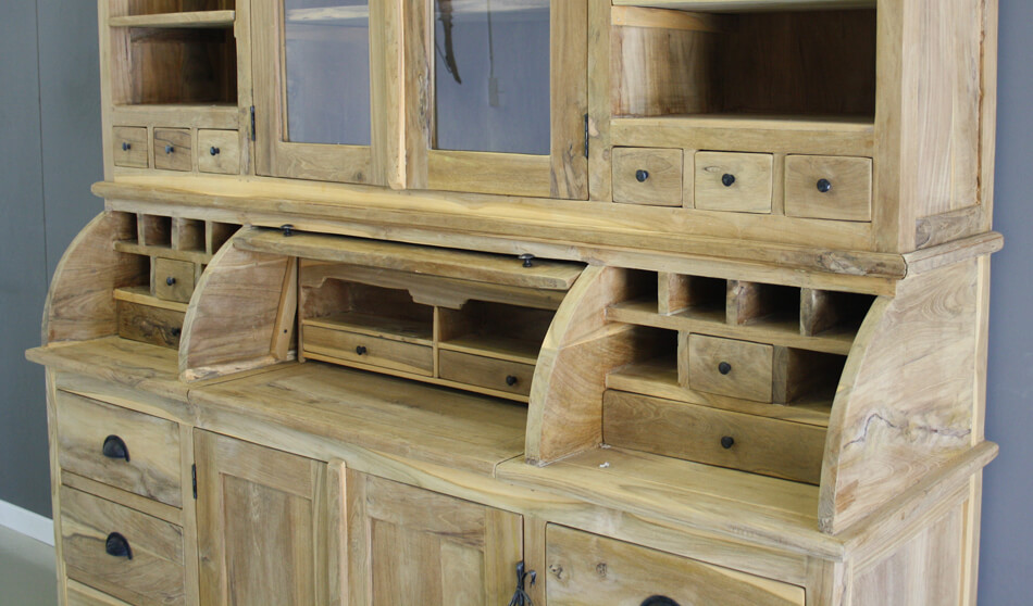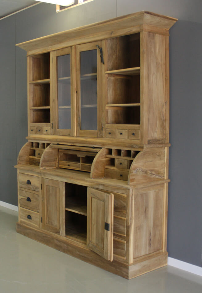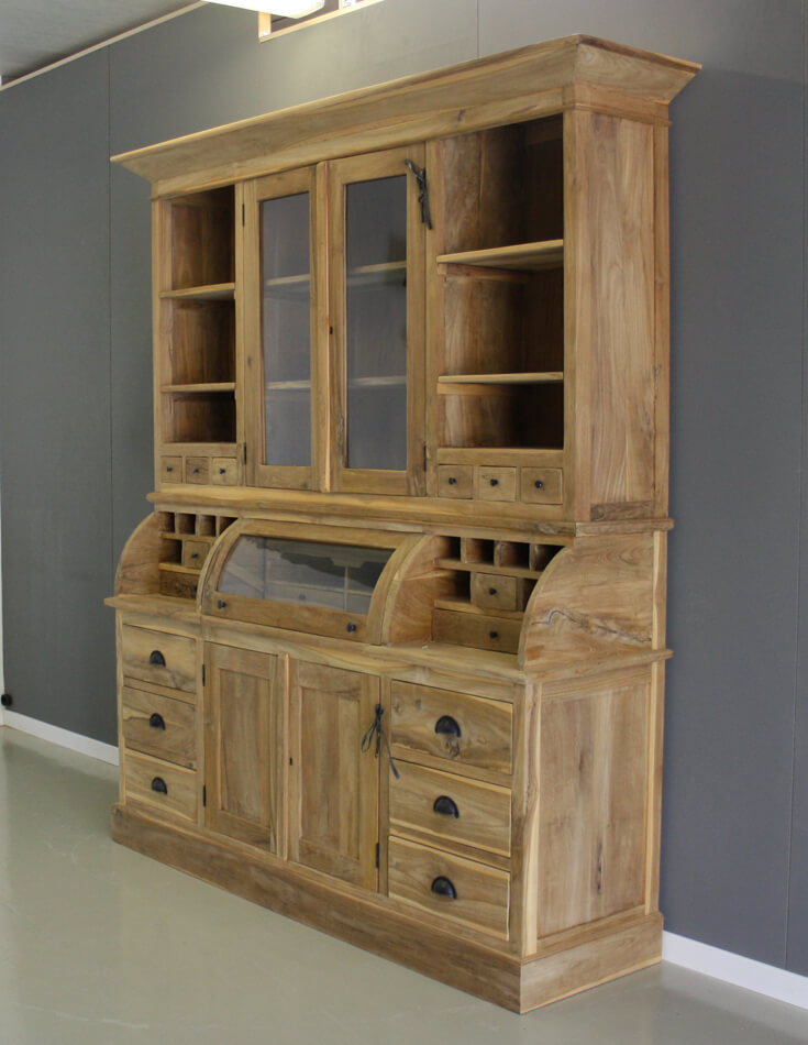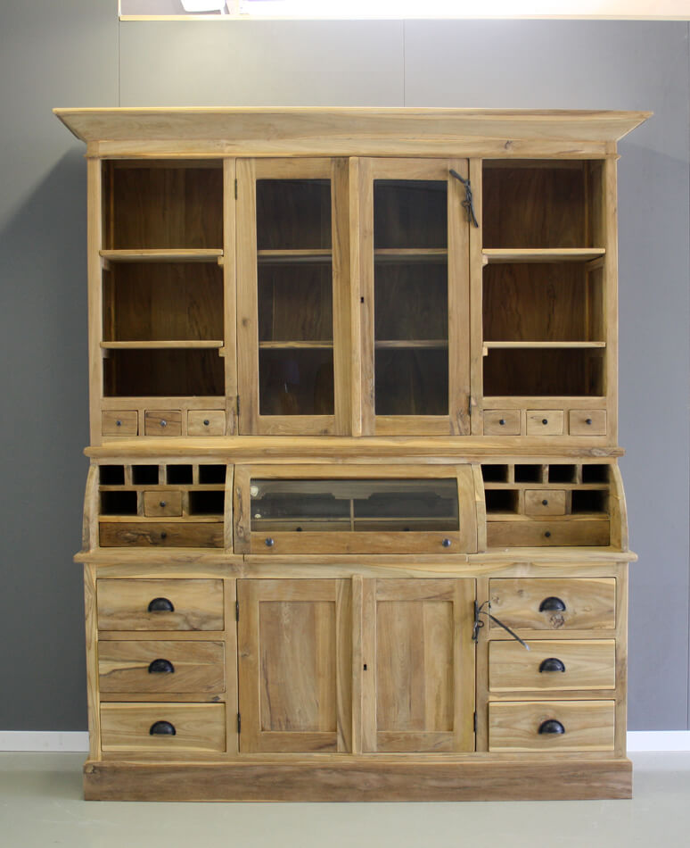 Teak grutterskast Zutphen 180cm breed met één bolle klep. Speelse kast met veel opbergvakjes en kleine lades.