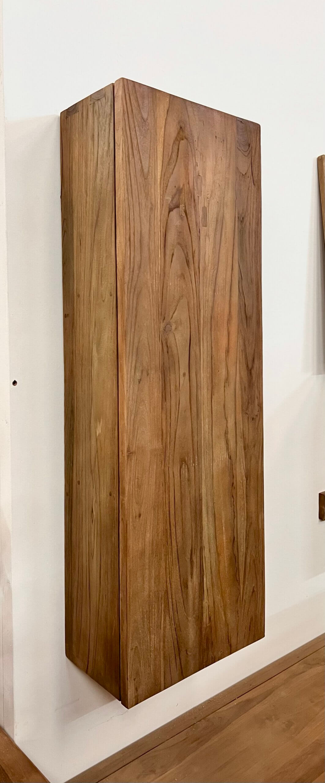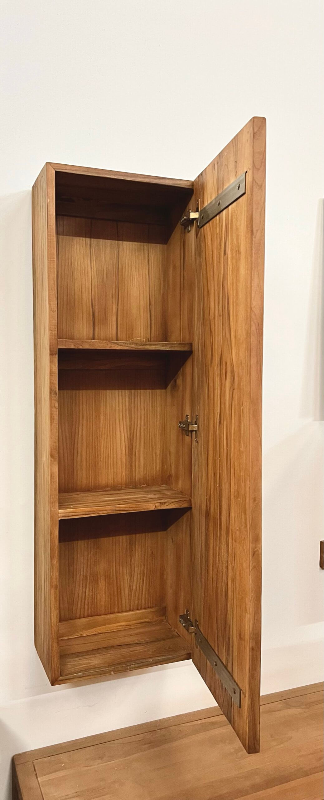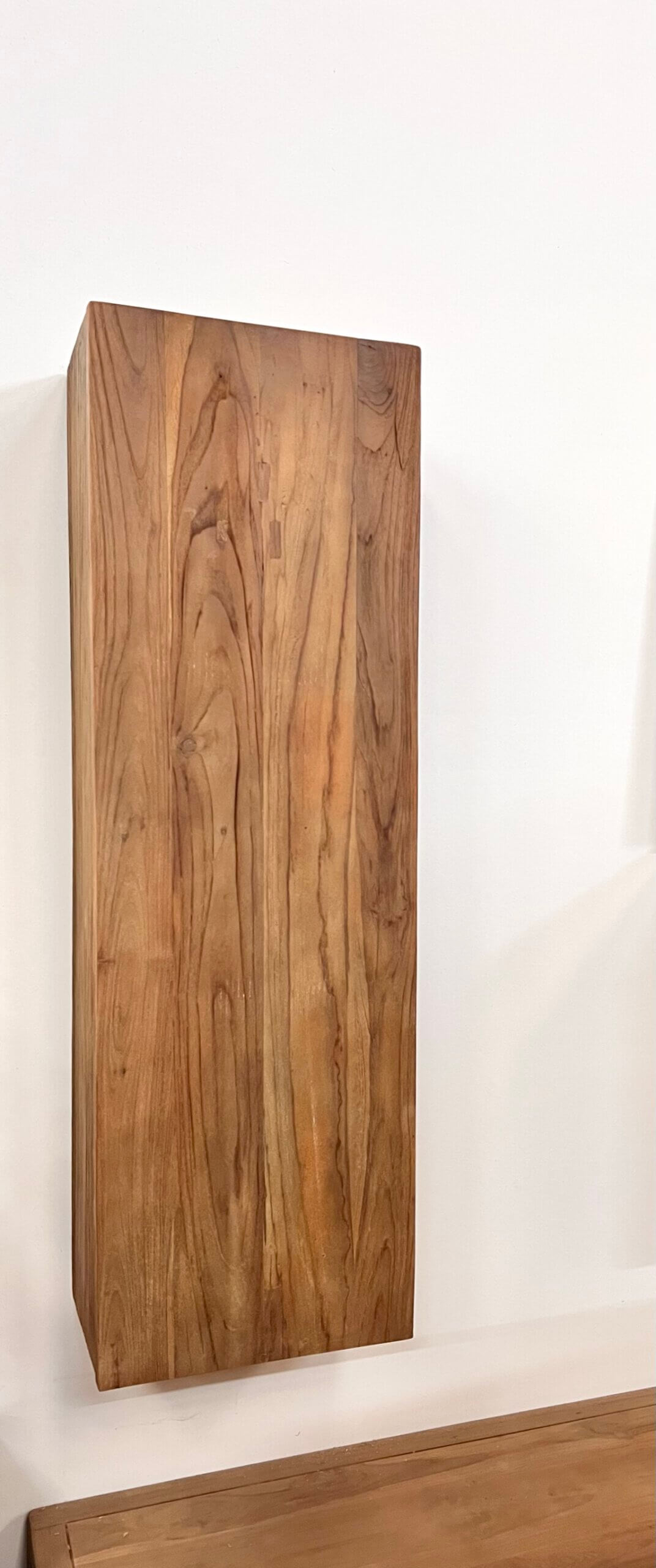 Wandkast gemaakt van teakhout. Achter de gesloten deur heeft de kast twee planken.