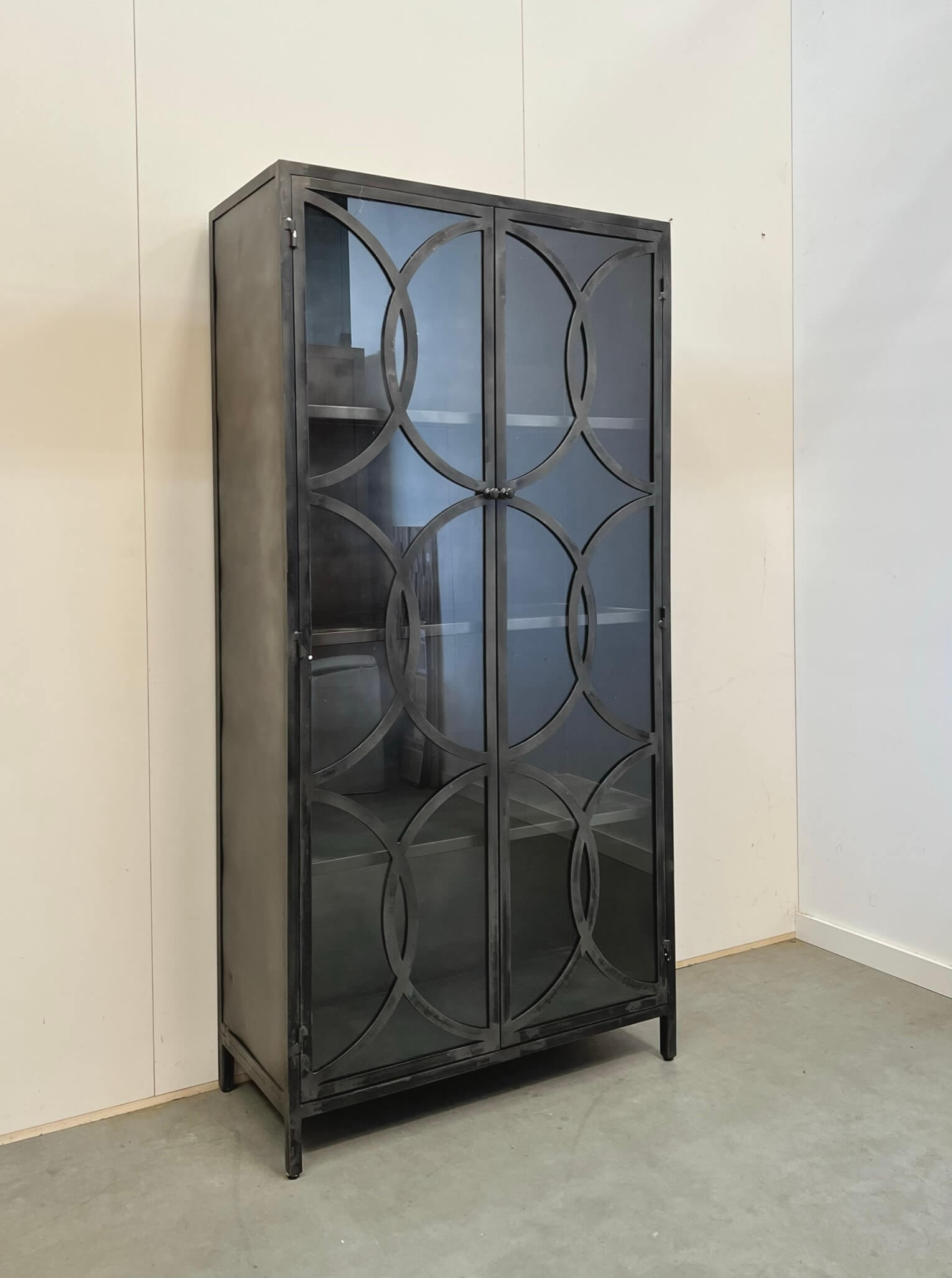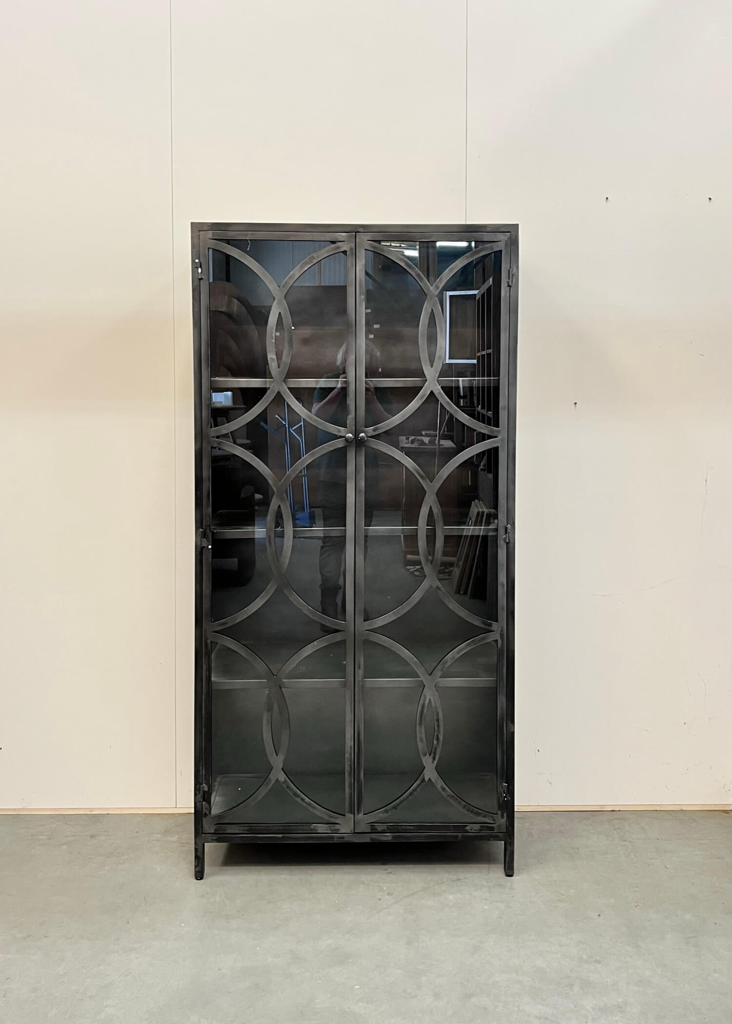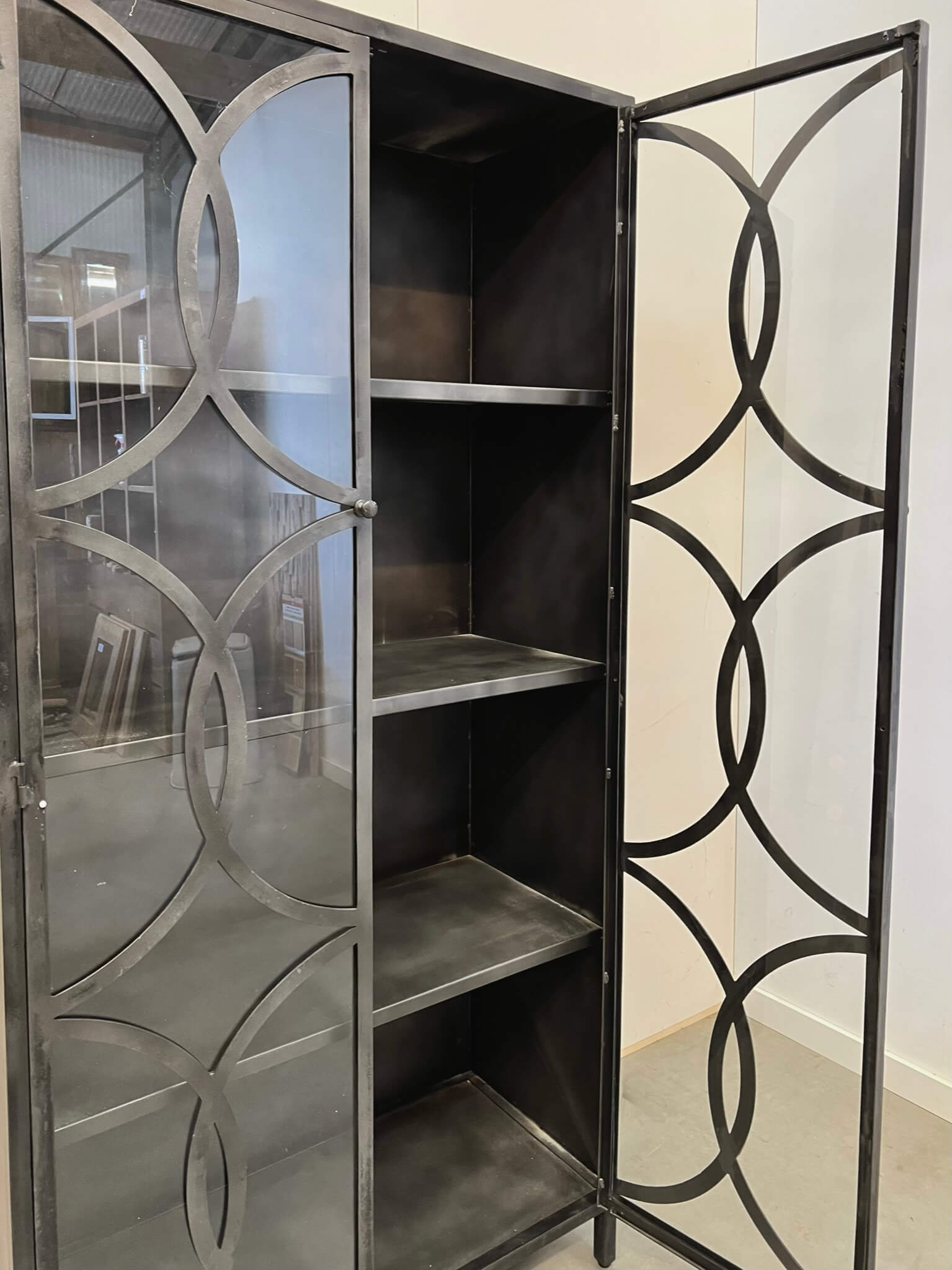 Stoere vitrine kast volledig gemaakt van staal. Stalen kast bij Indoteak? Wij vinden deze kast zo mooi dat we hem niet konden laten staan! De kast is gespoten in gun-metal gray.