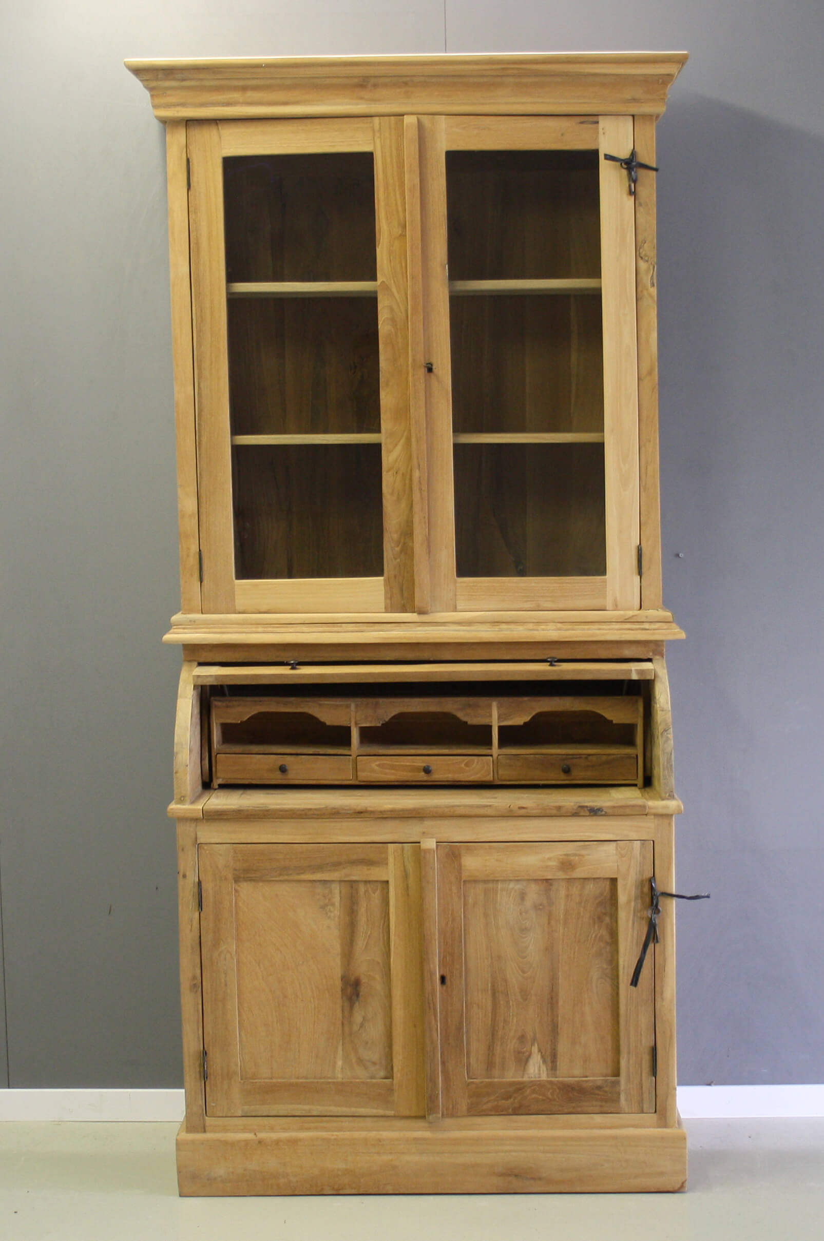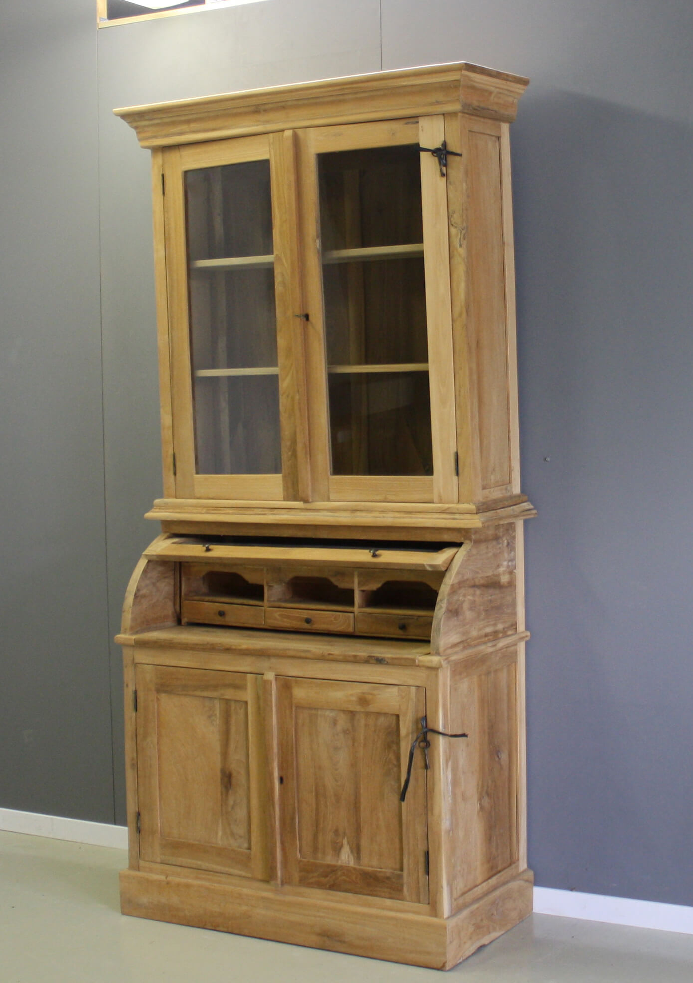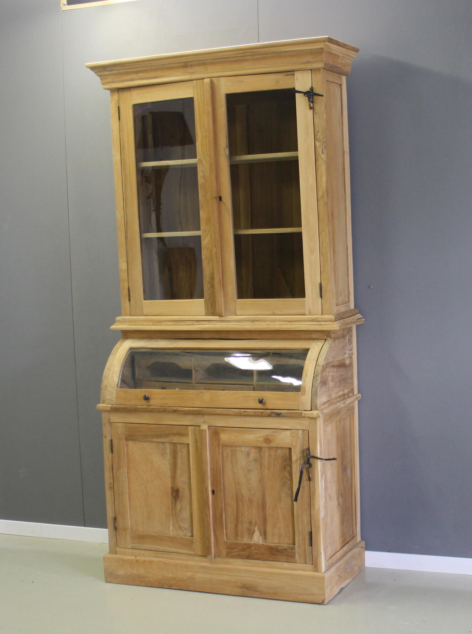 Kleine grutterskast Haarlem van teakhout met één ronde glazen klep. Achter het glas van de klep zitten lades en open vakjes.