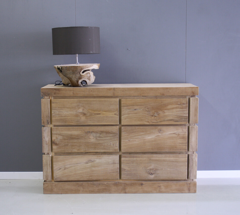 Teakhouten ladekast. Zes laden, greeploos afgewerkt.