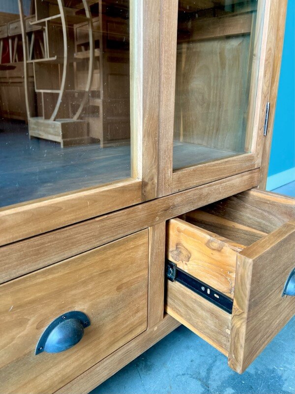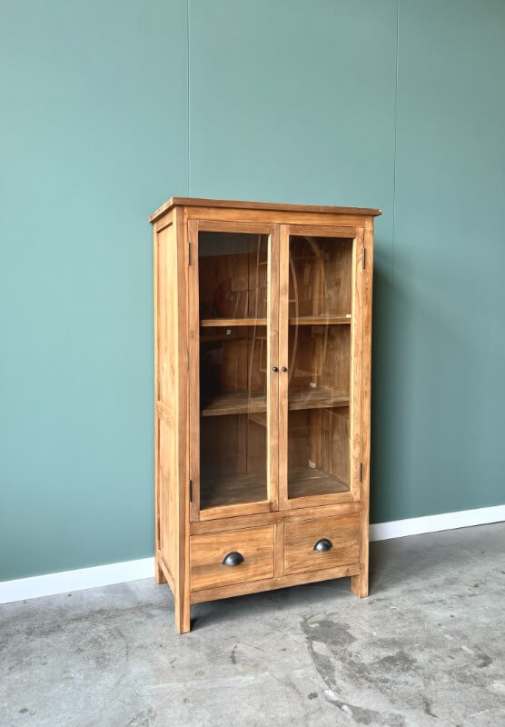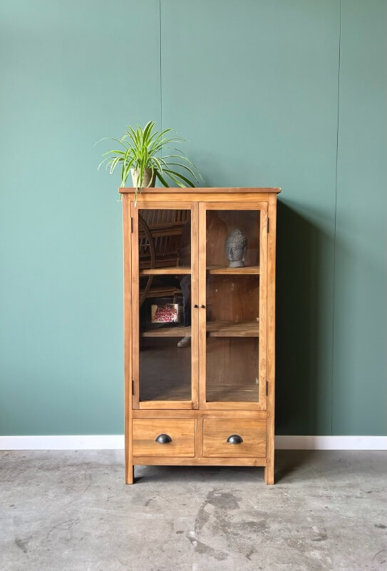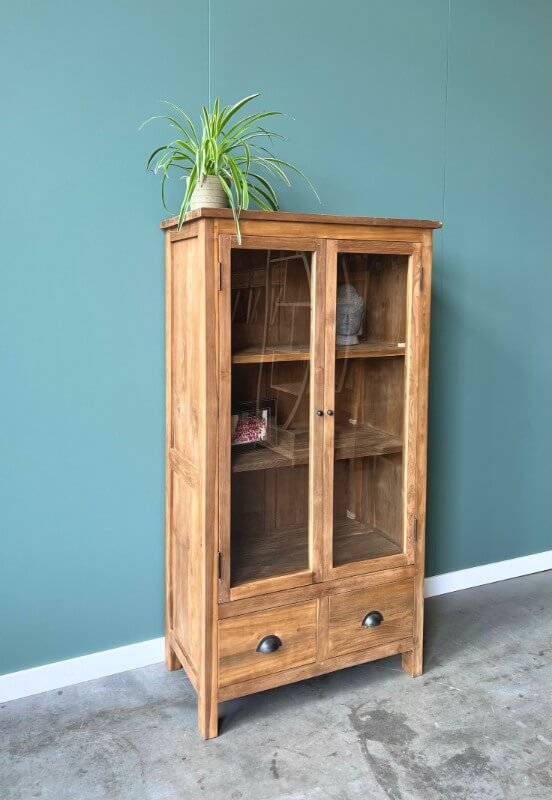 Kleine buffetkast gemaakt van gerecycled teak. Door de unieke afmetingen is de kast goed te plaatsen tussen 2 deuren of onder een trap. De laden gaan soepel open op metalen rail.