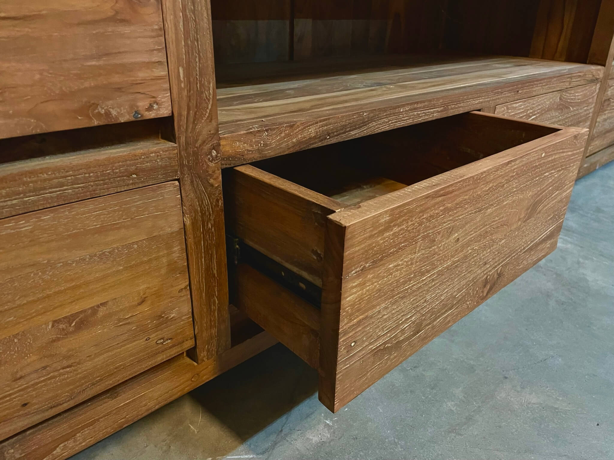 Modern tv-meubel met een robuuste afwerking. Het teakhout is ruwer gelaten en behandeld met een was voor een intense kleur. De laden zijn greeploos en gaan eenvoudig open op metalen geleiders. Ook leverbaar in 240 cm breed.