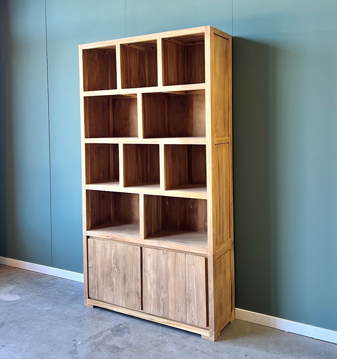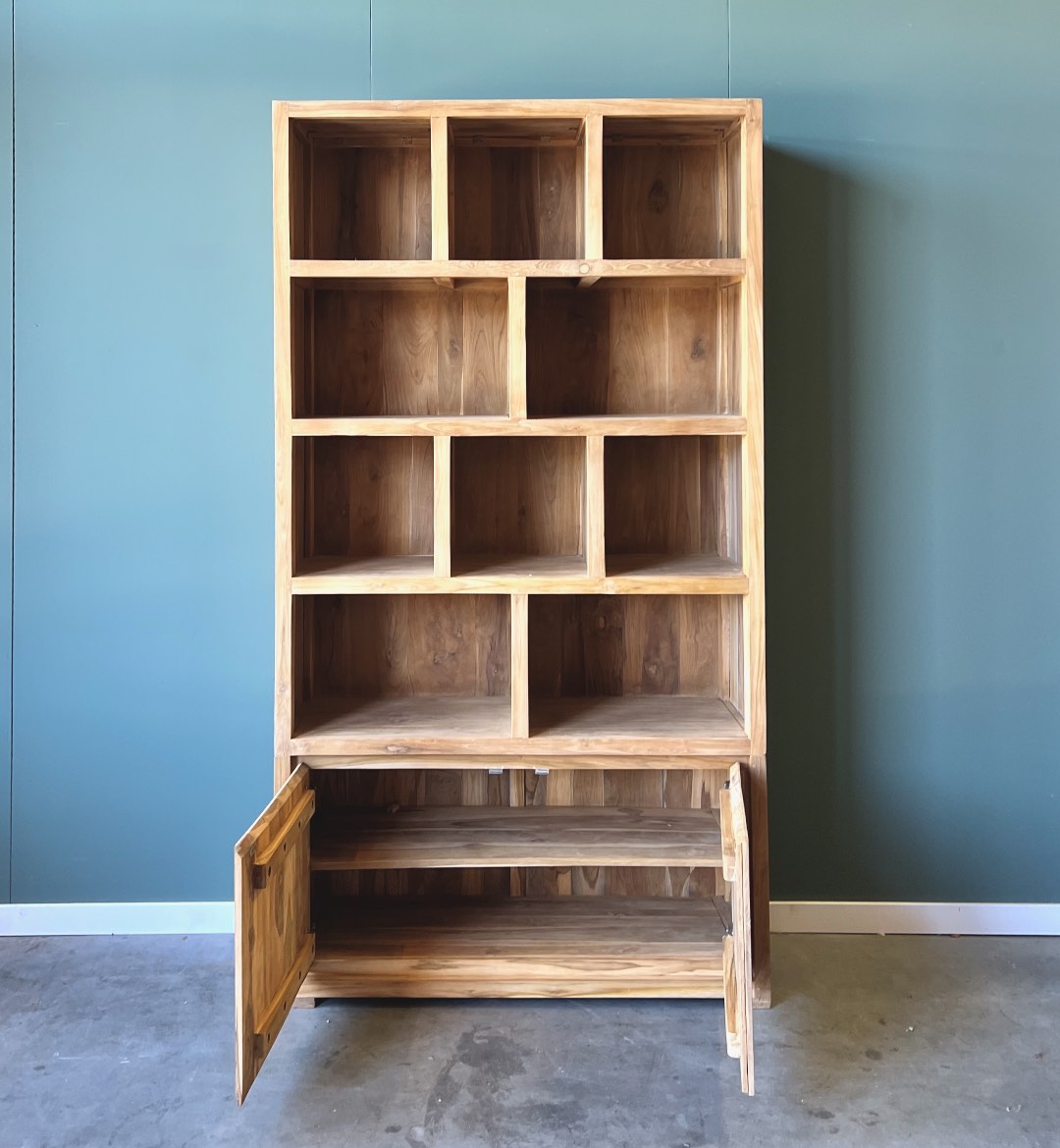 Deze moderne boekenkast brengt sfeer in elk interieur. De kast is gemaakt van uitstekende kwaliteit FSC teakhout. De deuren zorgen ervoor dat je genoeg opbergruimte hebt voor spullen uit het zicht. De kast is duurzaam en tijdloos waar je jarenlang plezier van hebt!