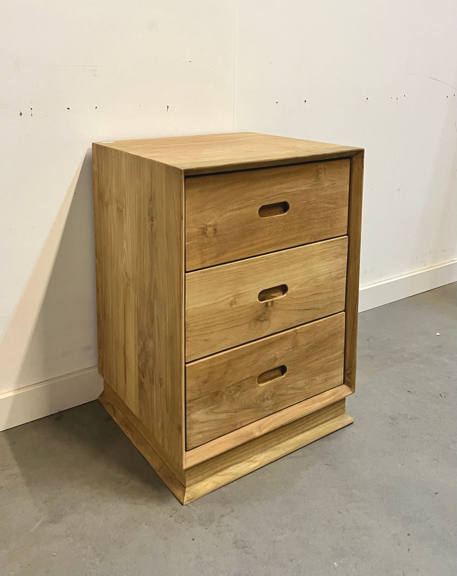 Moderne nachtkast met 3 laden. De nachtkast is gemaakt van plantage teakhout.