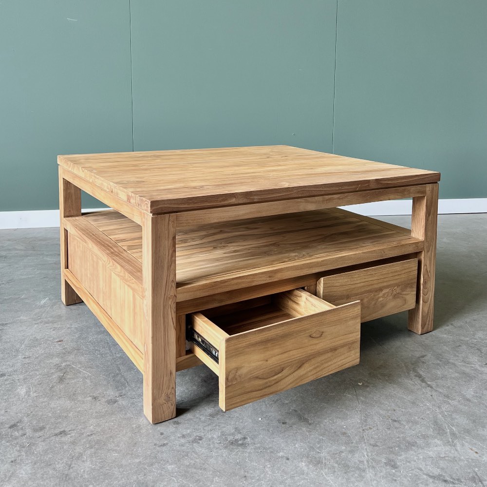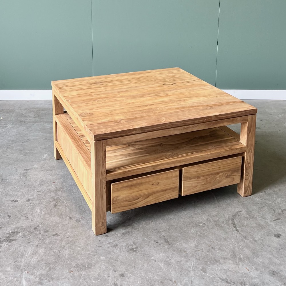 Moderne salontafel met vier greeploze laden. De tafel is gemaakt van uitstekende kwaliteit gerecycled teakhout.