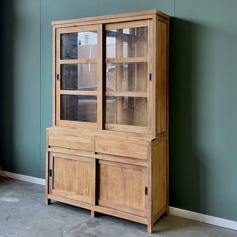 De moderne teak schuifdeurkast Groningen is gemaakt van oud gerecycled teakhout. Het hout wordt gewonnen uit oude sloopgebouwen in Indonesië. Het hout wordt vervolgens klaargemaakt voor hergebruik, zoals het verwijderen van spijkers en verf. Ten slotte wordt het teakhout gladgemaakt en gebruikt voor het meubelstuk. De fabriek waar deze kast vandaan komt gebruikt alleen de beste kwaliteit teak. Het voordeel van het oude teakhout is dat het op een natuurlijke manier heeft laten drogen, waardoor de kans op krimpscheuren veel kleiner is.