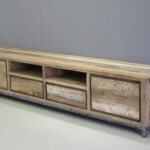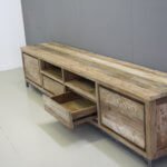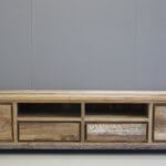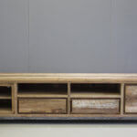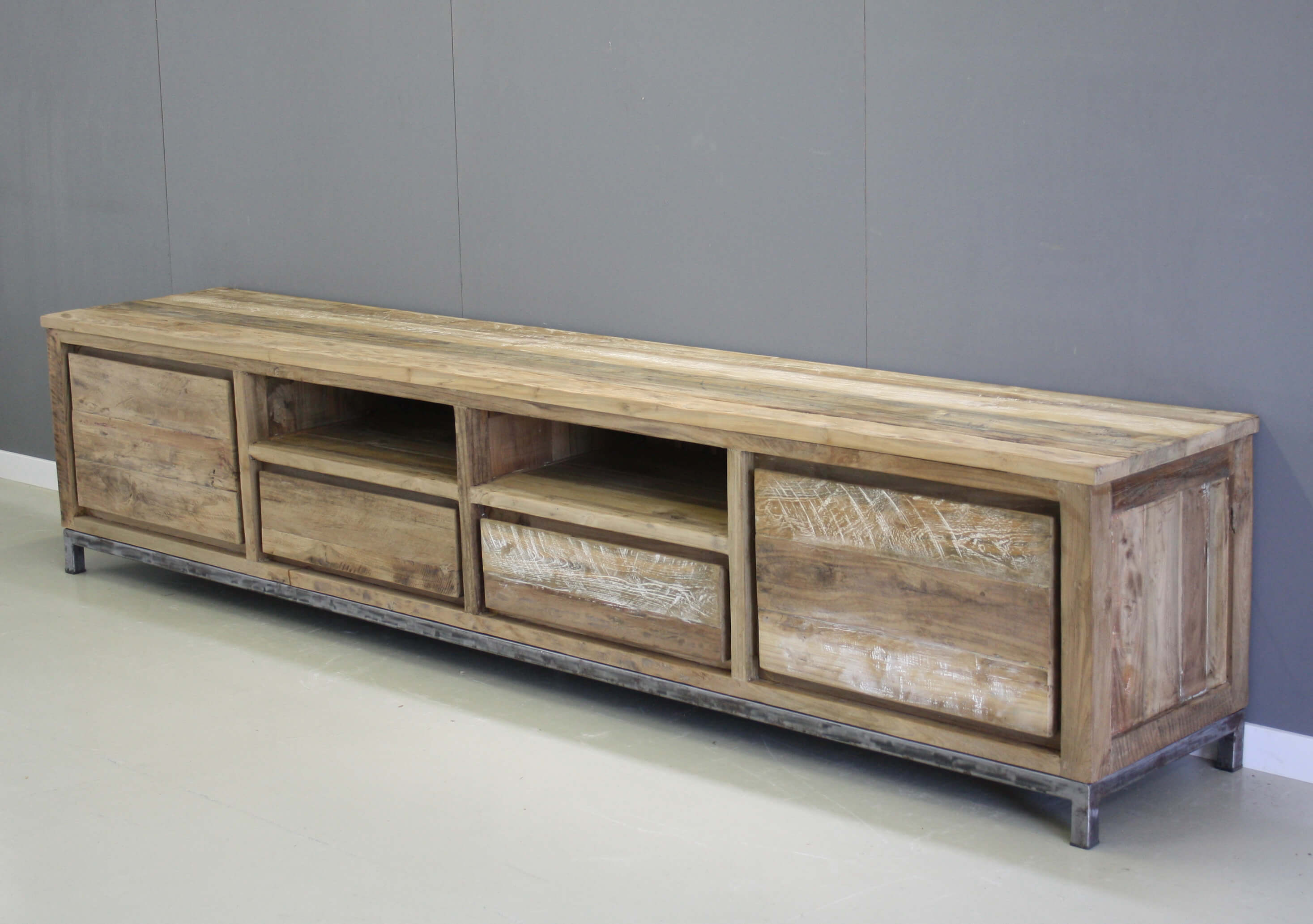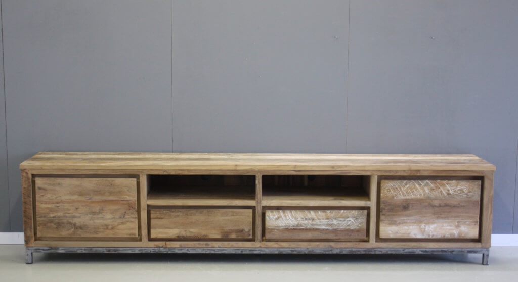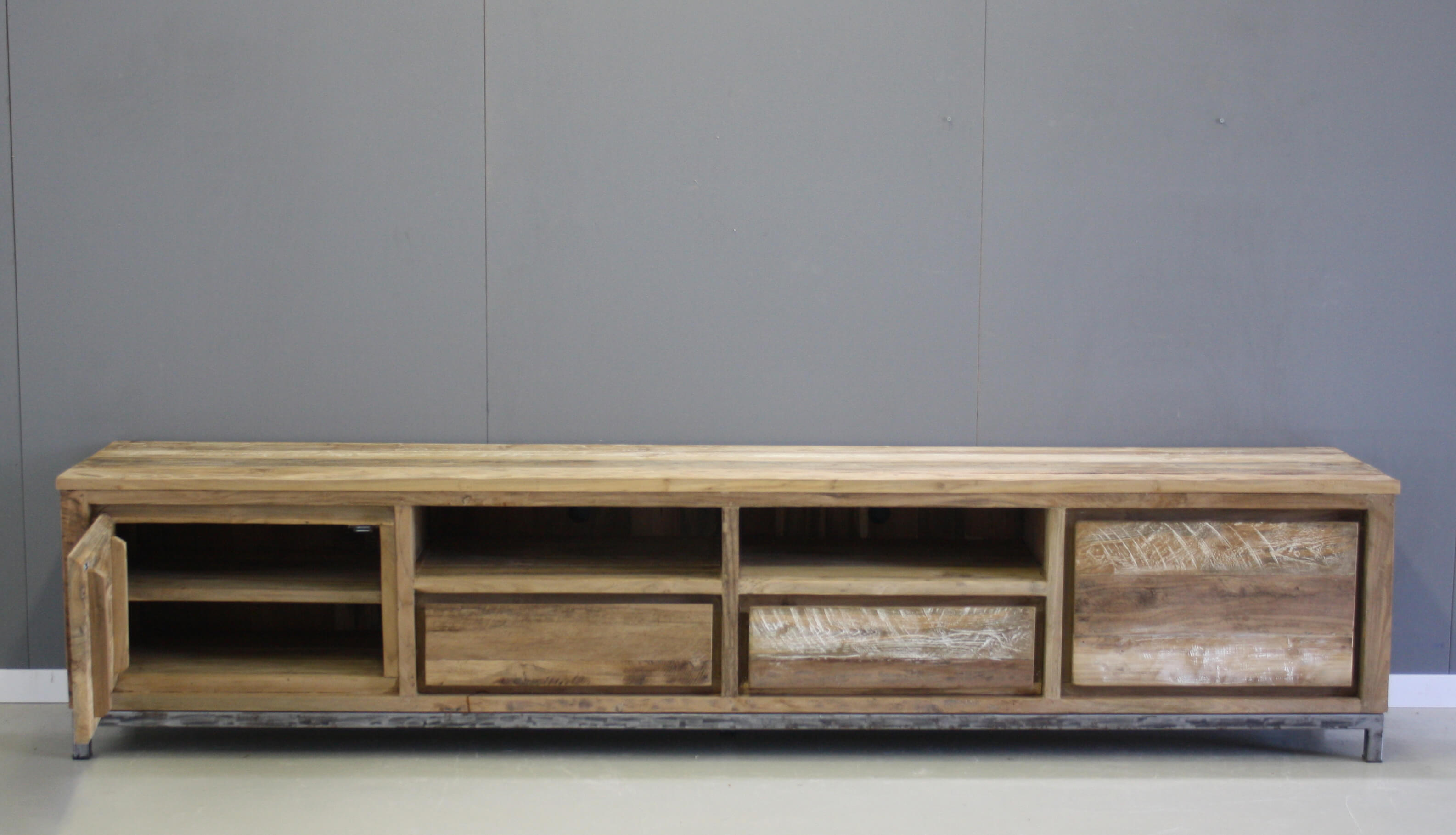Imposant TV meubel New York. Bewerkt teakhout, metalen frame. Twee deuren, twee laden en twee open vakken.