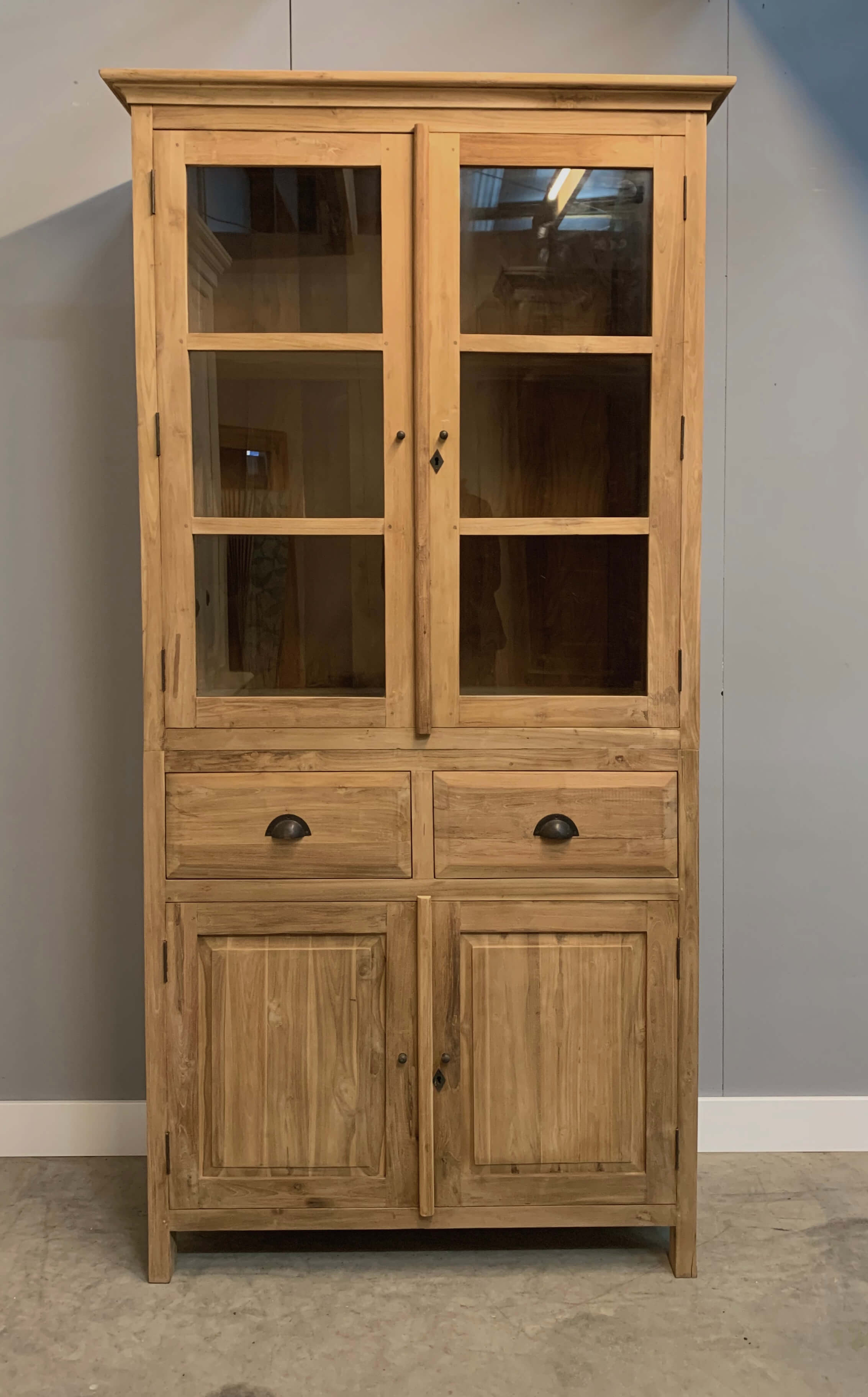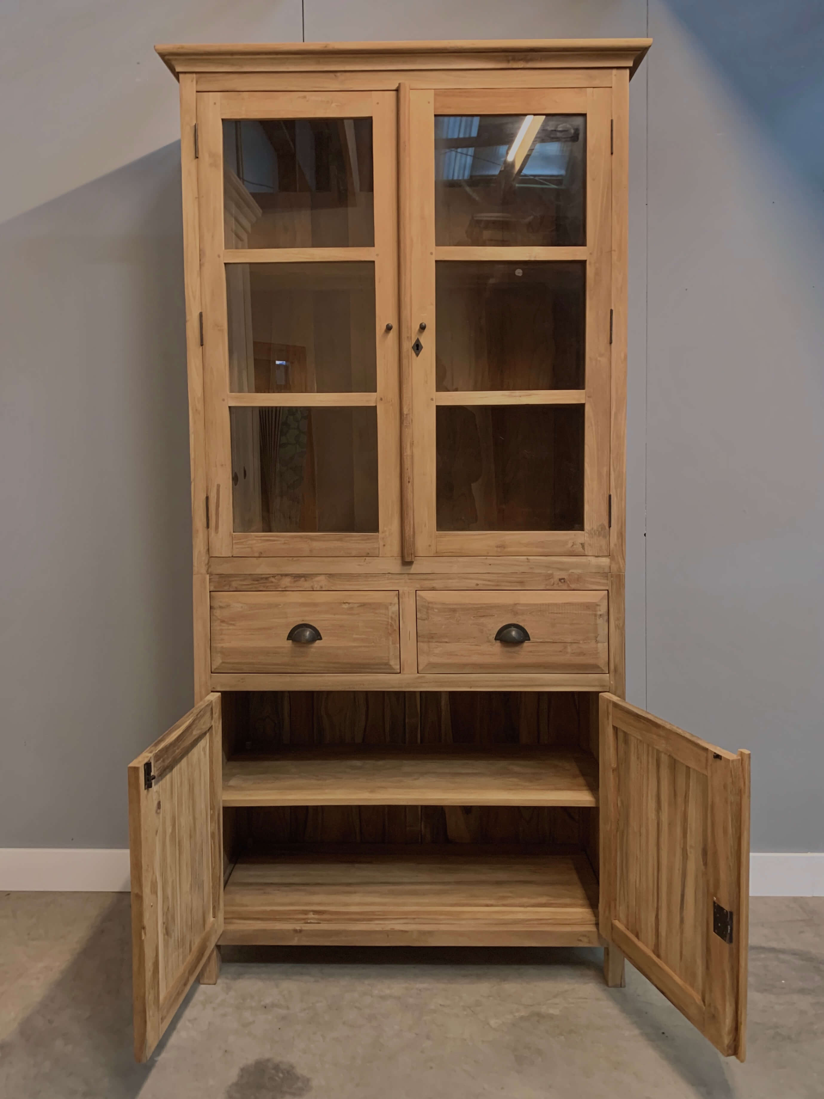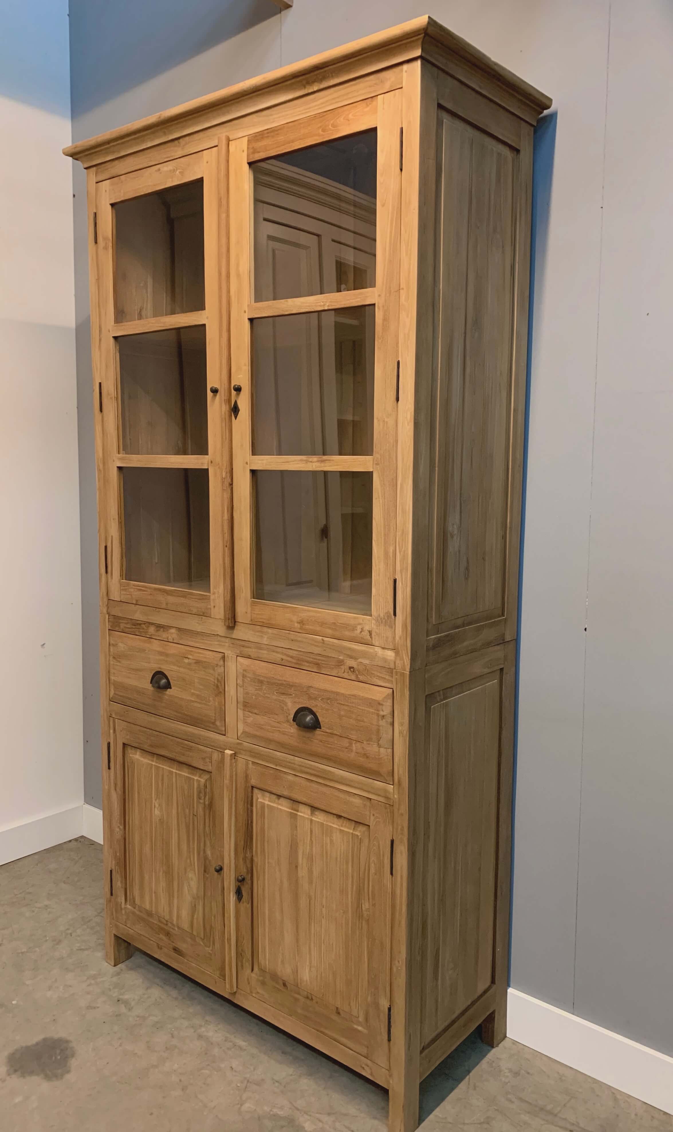 Teak kast Oldenzaal van 1 meter breed. De kast heeft bovenin glasdeuren. Geen oversteek waardoor het bovenstuk wat dieper is. Makkelijk als u er servies in wilt zetten.
