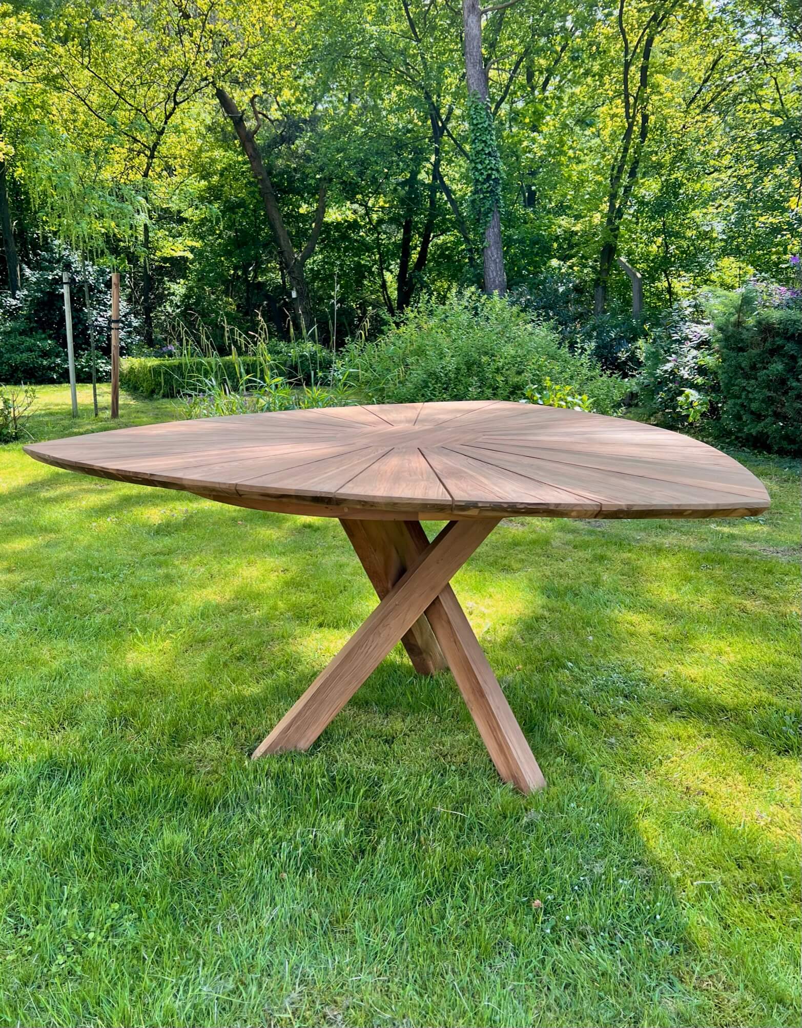 Organische driehoek vorm tuintafel gemaakt van uitstekende kwaliteit teakhout. Door de unieke vorm bent u verzekerd van een geslaagde zomer avond. De tafel is licht op geruwd voor een natuurlijke uitstraling. Deze tafel kunnen wij leveren in 2 afmetingen.