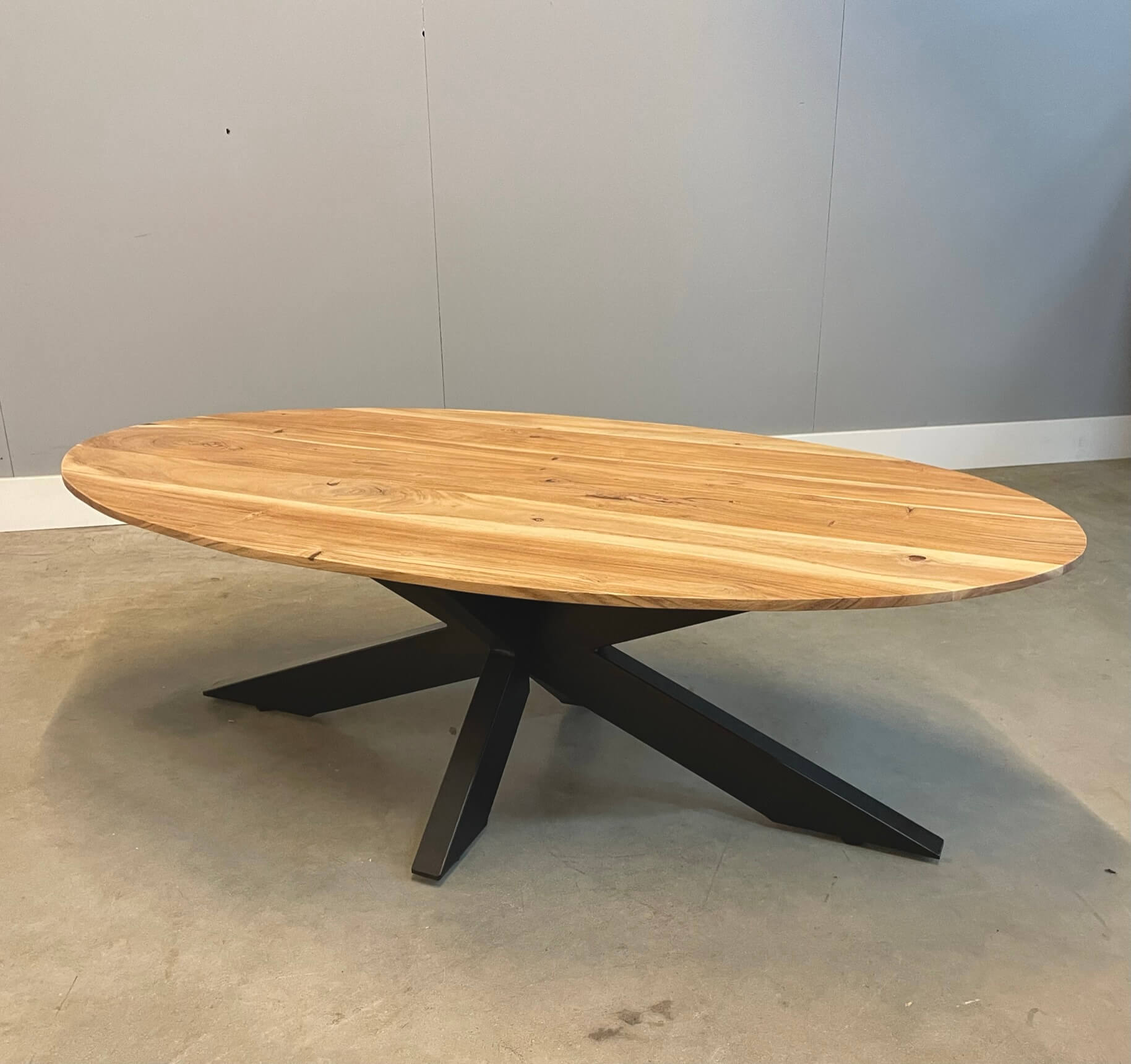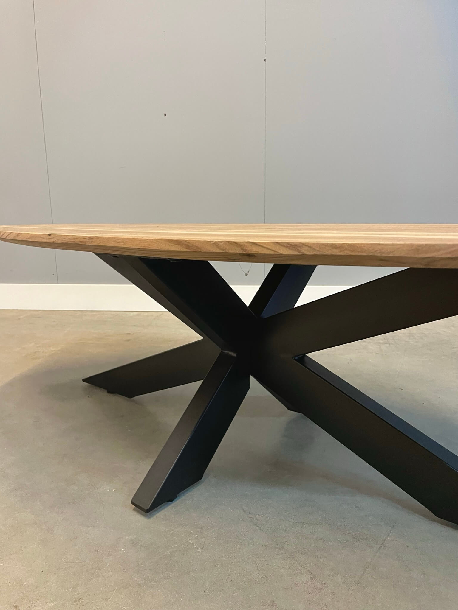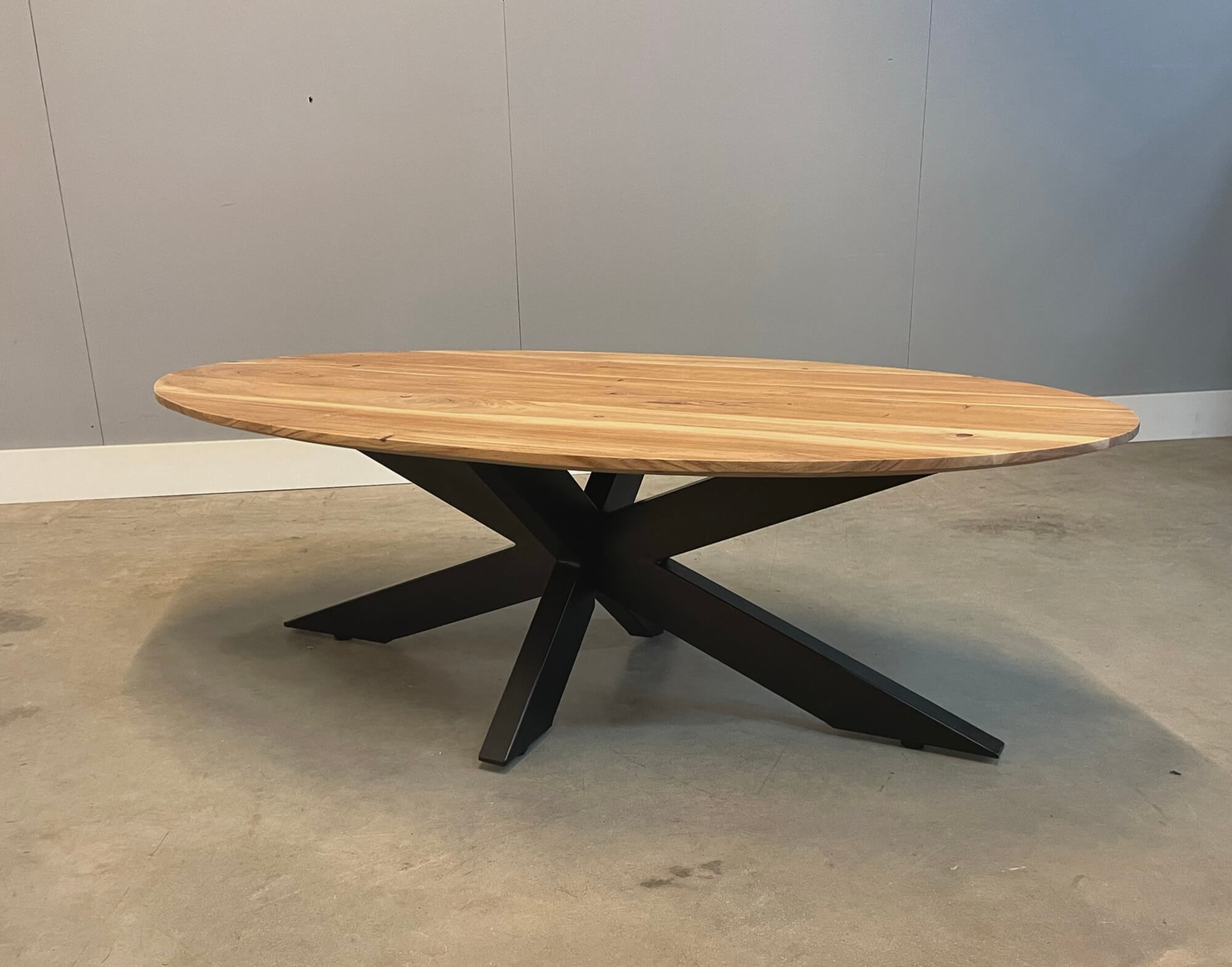 Elegante salontafel met een metalen kruispoot, het houten blad heeft een verjongde rand. Dit geheel zorgt voor een stijlvolle uitstraling. Acacia bij Indoteak? Deze houten bladen zijn gebleekt waardoor het goed te combineren is met teakhout. Het blad is gelakt en kan gelijk in gebruik genomen worden.