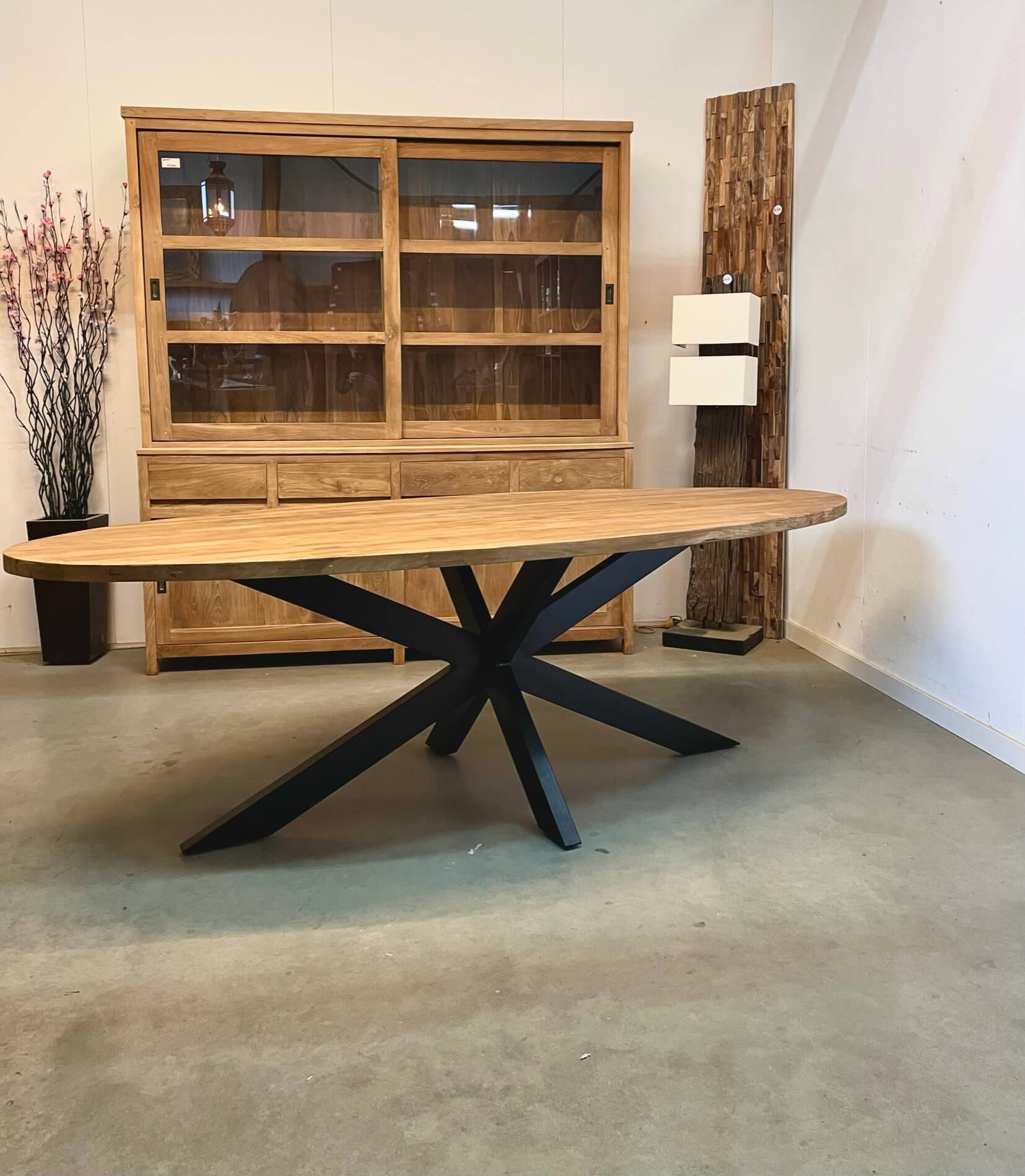 Bent u dol op een industrieel interieur? Dan is deze ovale teak tafel met stalen poot wellicht iets voor u. De combinatie van twee stoere materialen geven uw inrichting een hele robuuste uitstraling. Het is een echte eyecatcher voor in uw interieur, zeker omdat het materiaal erg uniek is. Daarnaast is het erg duurzaam omdat we gebruikmaken van gerecycled teakhout uit Indonesië. Voor deze unieke tafel hoeven we dus geen extra bomen te kappen, wat het een milieuvriendelijke optie maakt.