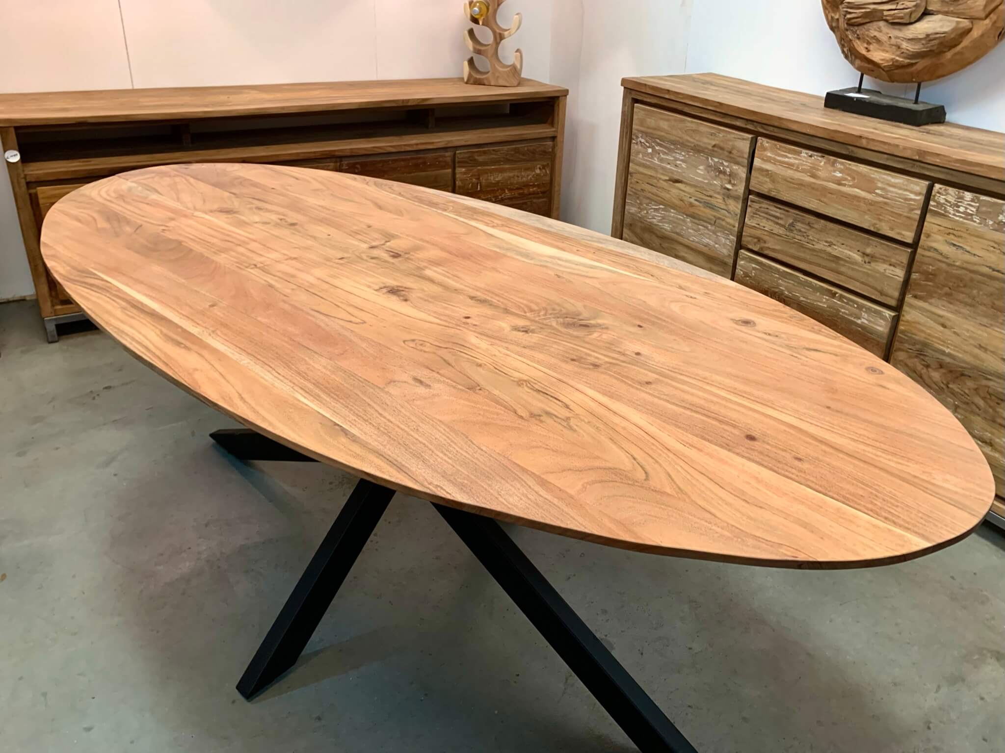 Deze ovale acacia tafel met metalen poot heeft een bleekbehandeling gehad. Hierdoor heeft de tafel niet de gebruikelijke rode gloed. Acacia hout staat bekend om haar mooie en unieke houtnerf. De tafels hebben een mooie vlam in het hout. Hierdoor is elke tafel uniek.