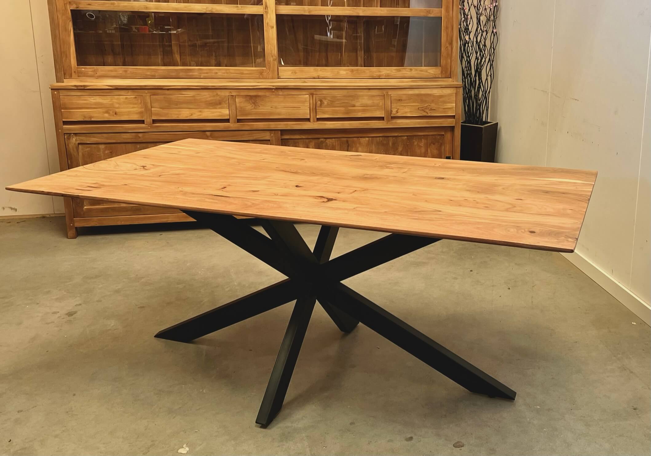 Elegante tafel gemaakt van acacia, de tafel heeft rondom een verjongde rand. Hierdoor lijkt het blad niet heel zwaar en geeft het de tafel een elegante uitstraling. De zwarte metalen poot is gepoedercoat en kan hierdoor goed tegen een stootje.