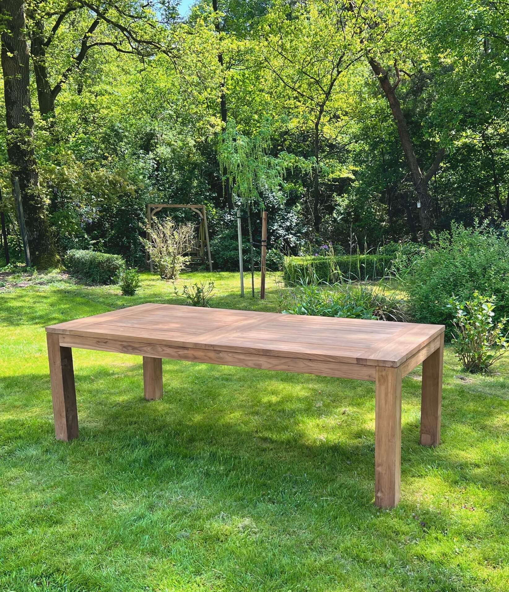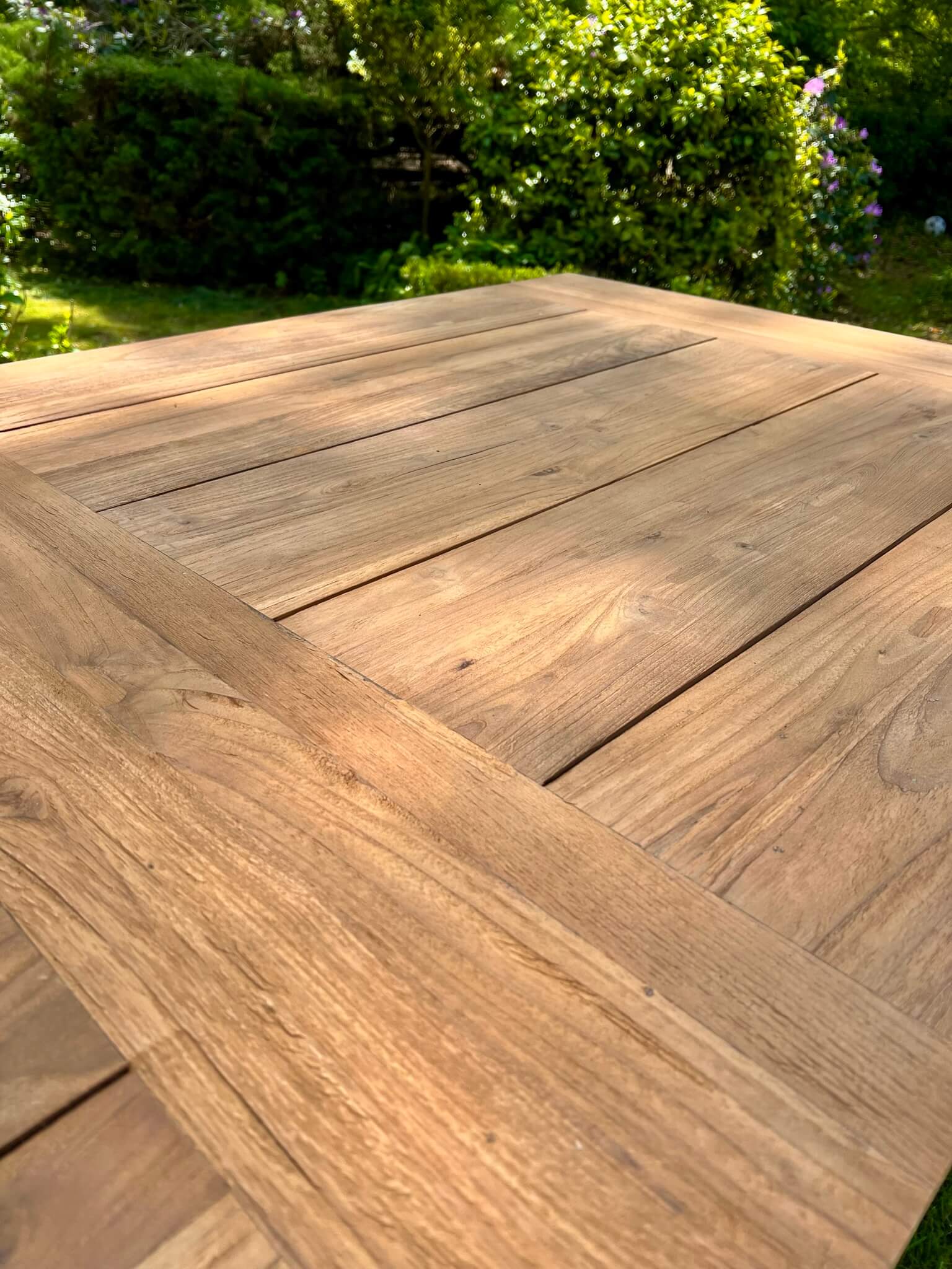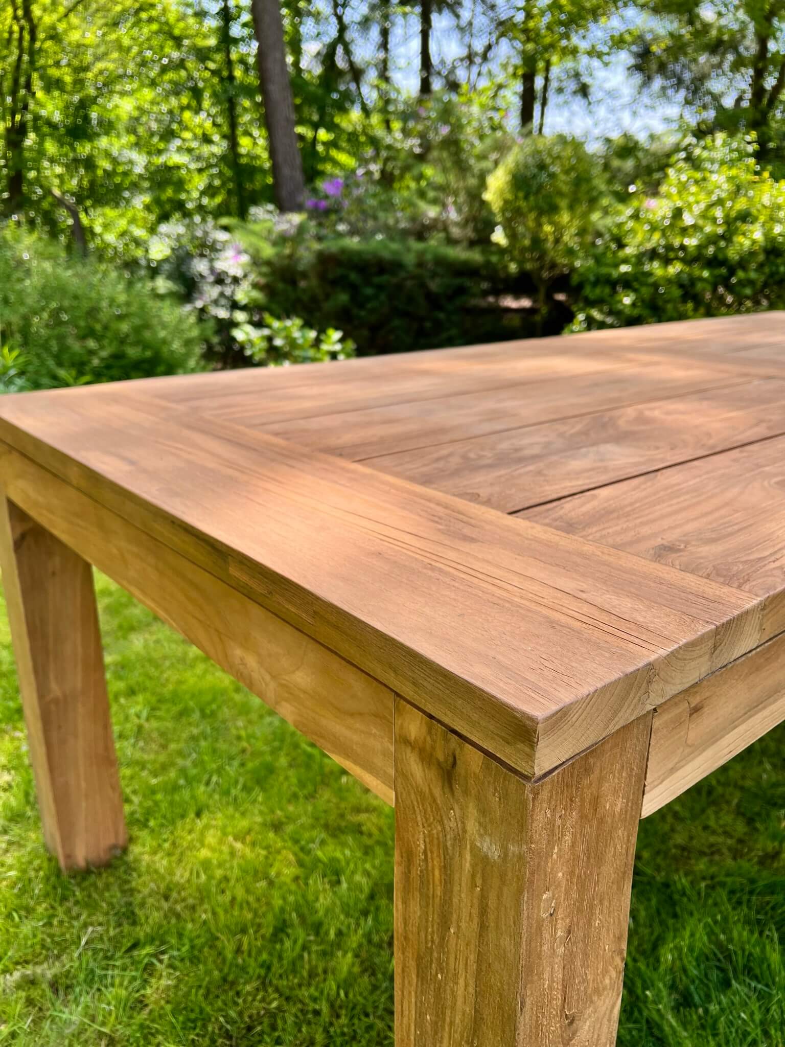 Onderhoud, teakhouten tuinmeubels zijn eenvoudig in het onderhoud. Wij raden aan om de tafel na de winter goed schoon te maken met groenezeep of een woodcleaner. Na het schoonmaken kunt u de tafel behandelen met olie, hiermee wordt het hout gevoed wat zorgt voor een nog langere levensduur van uw tuintafel.
