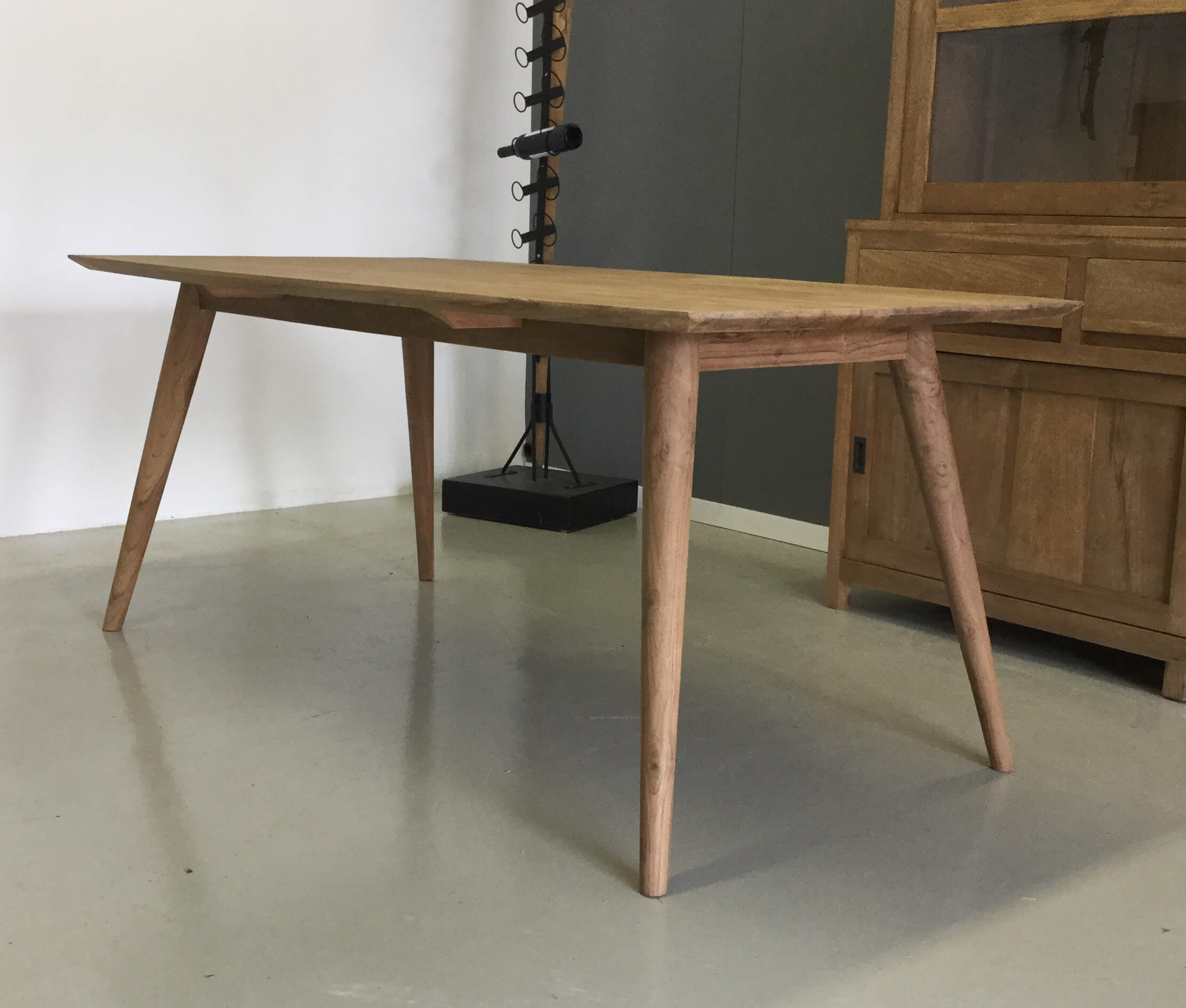 Bijzonder fraaie teak tafel met ronde poten en afgeschuinde hoeken. Een plaatje om te zien. Bij deze tafel zijn bijpassende stoelen te koop.